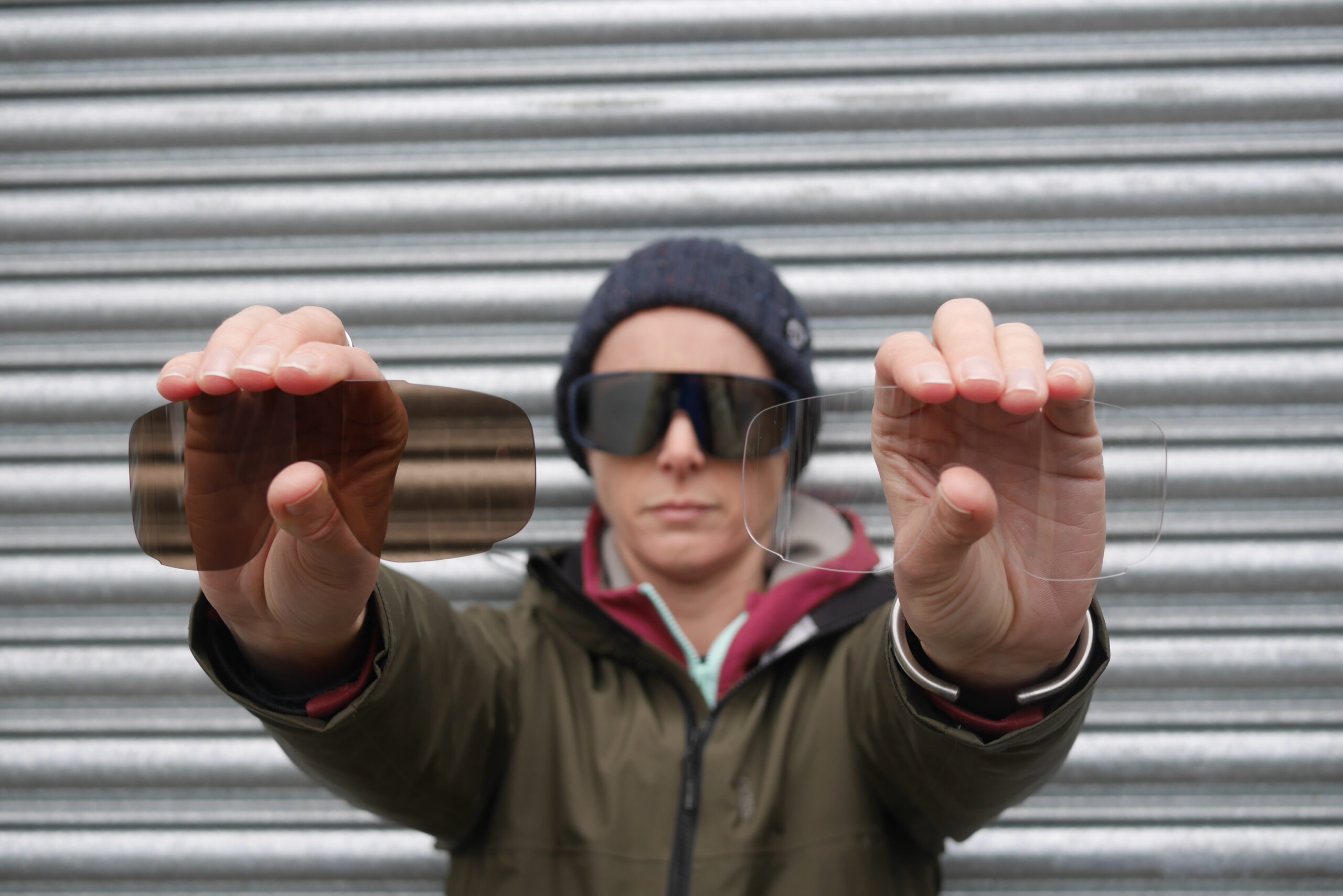Widescreen fronts with really quite narrow arms following behind. Worth a look (ha!) ifyou want hewge lens but only have a dinky melon to attach them to. Based on Panda Optics’ ski goggles apparently. With a semi-rimless frame and cylindrical lens. Three lenses included (Mirrored red category 3, Amber category 2, Clear category 0).