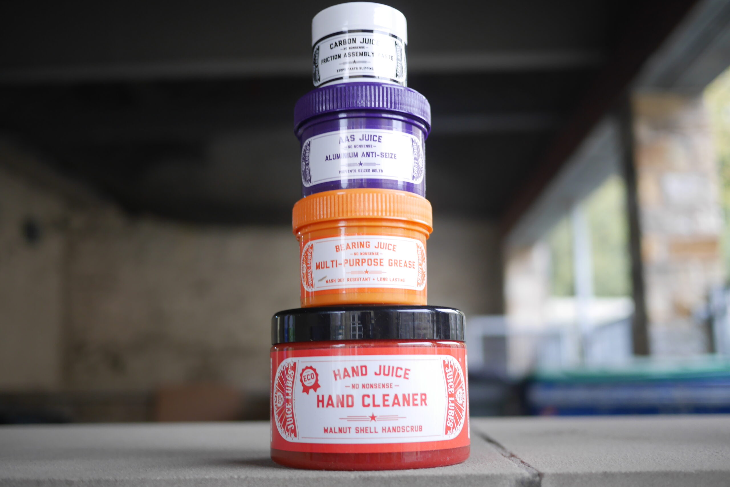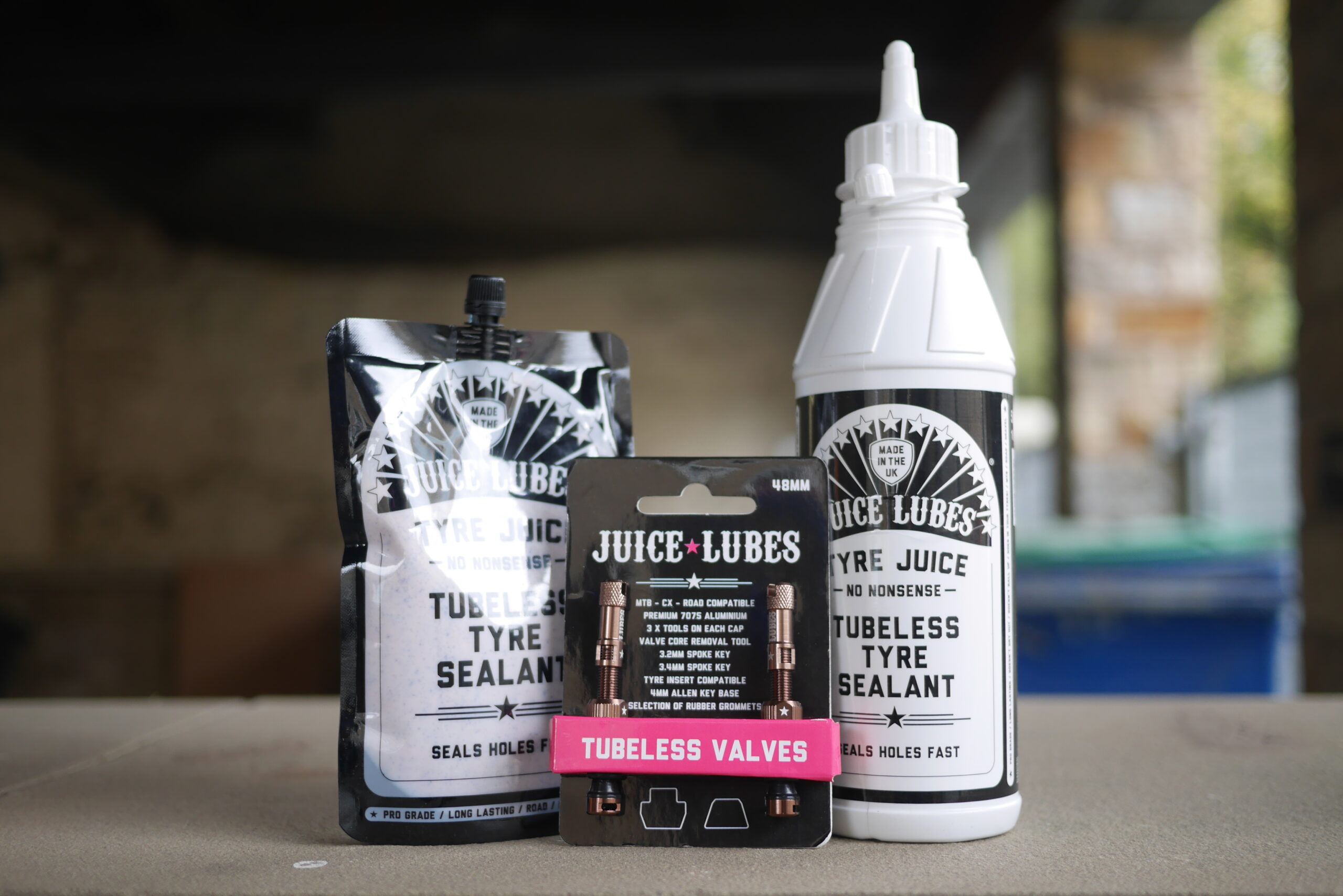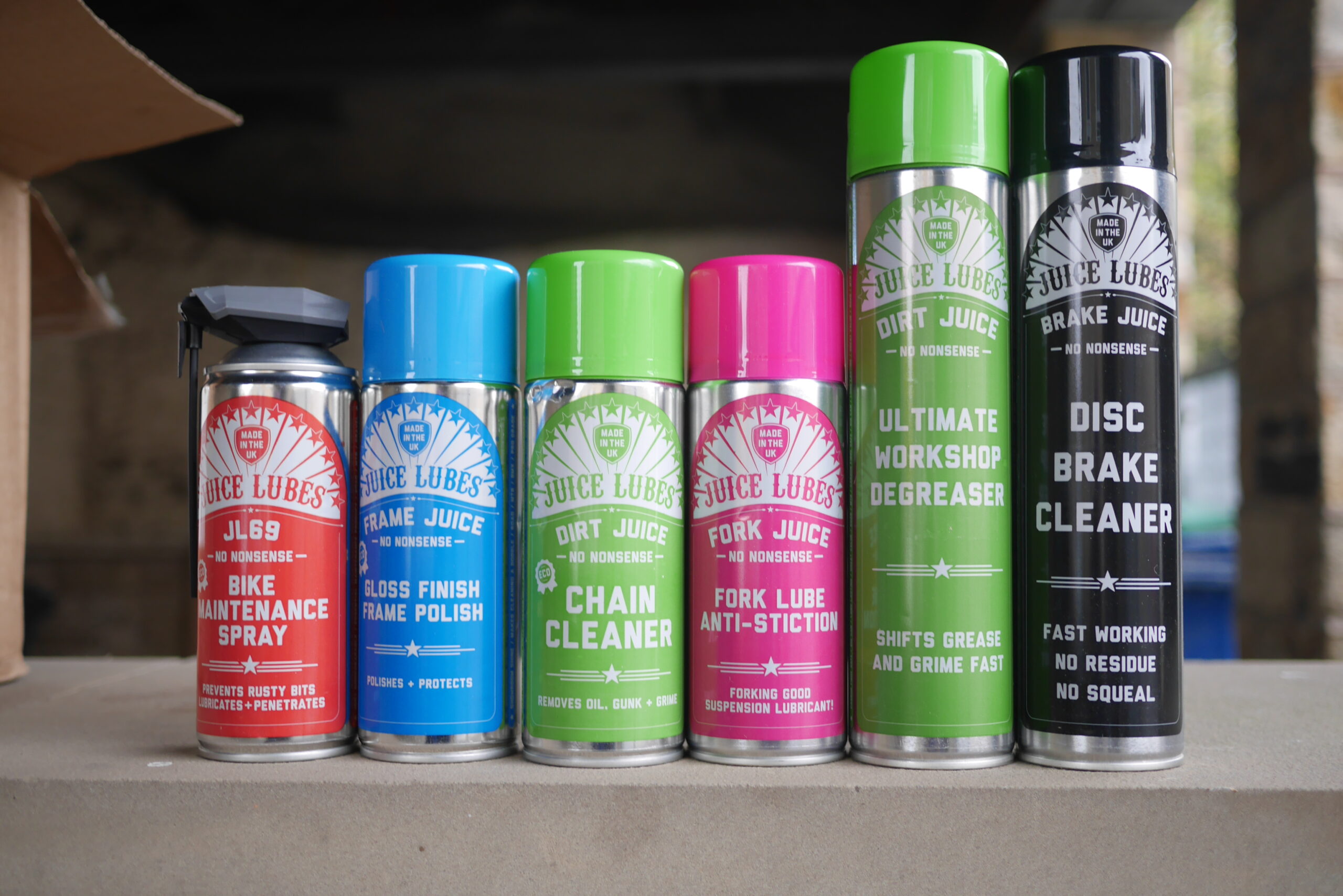 A Tardis-like cardboard box arrived earlier this week. Not that big but impressively heavy. Inside was a lot (and I mean, A LOT) of stuff from Juice Lubes. Chain lubes, tyre sealant, tubeless valves, carbon assembly paste, aluminium anti-seize, general grease, hand cleaner, maintenance spray, frame polish, chain cleaner, fork lube, degreaser, disc brake cleaner, sponge, cloth, bike cleaner, brushes, chain cleaner and stickers. Plenty of stickers. Should keep the Singletrack Office Workshop Crew happy for a while (especially the stickers).