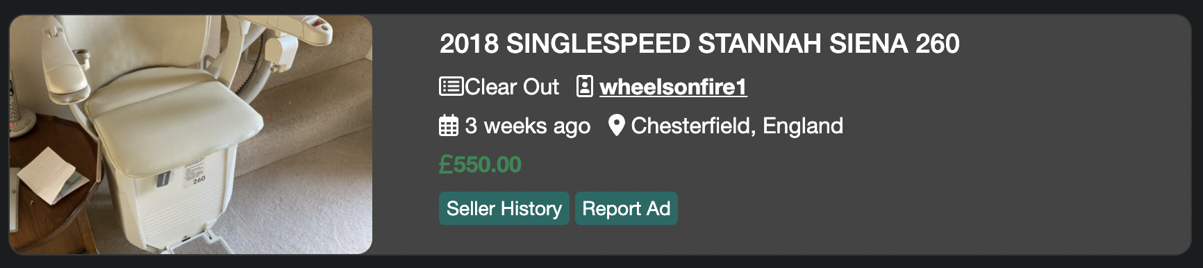 “Fully working and fully serviced. New rail in 2020. I can remove it or buyer can remove to ensure familiarity. You will be very lucky if it fits your location but if you’re a bit handy it could be modified or just buy a new rail – complete stairlifts are ridiculously expensive! Collection from Chesterfield. Please buy it someone to prevent the monorail idea in my head becoming reality!”