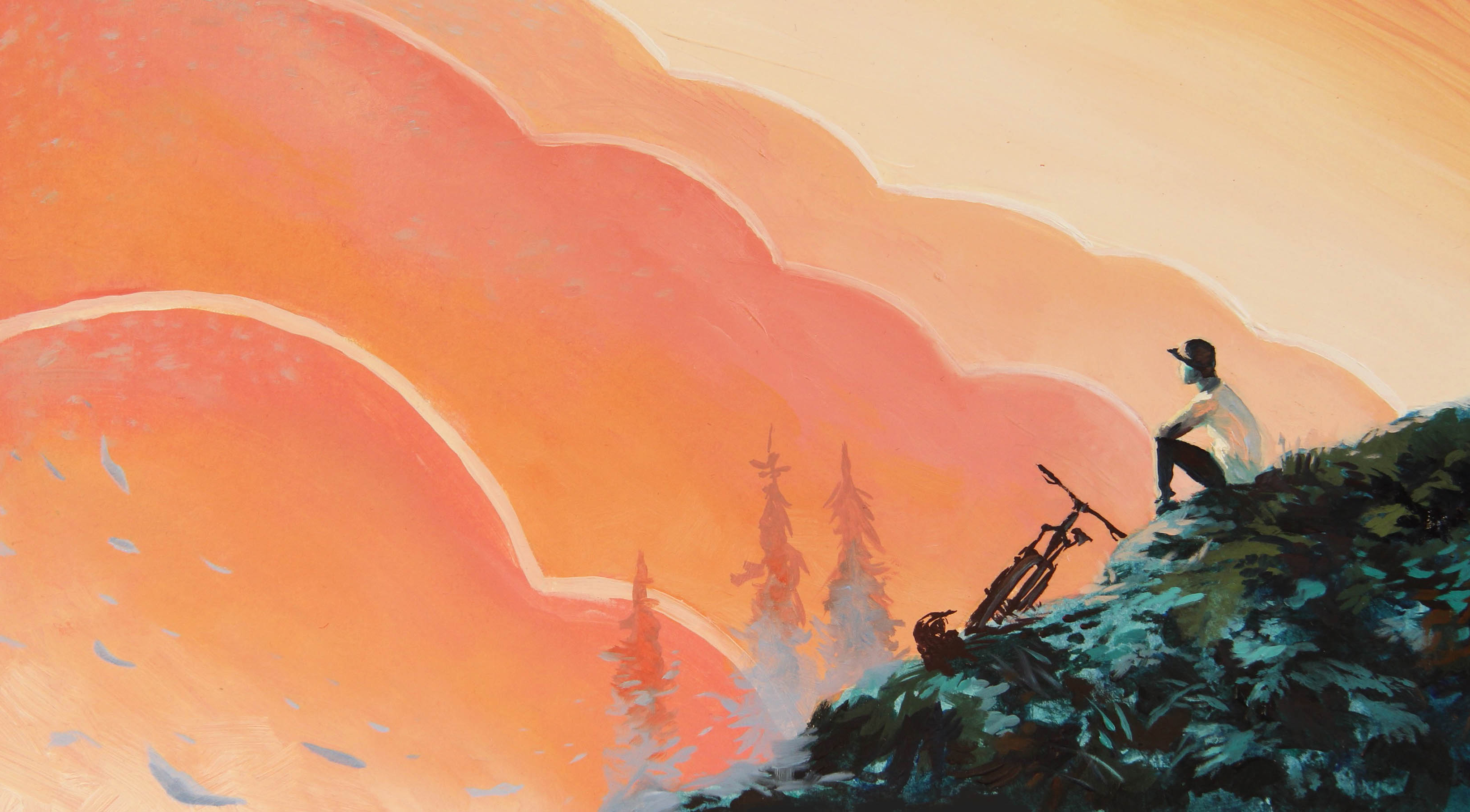 It feels like we often get caught up in ourselves and our self fulfilment projects these days. We spend so much time and effort staring at our own reflection that we tend to miss the bigger picture. With this painting I was hoping to illustrate one of those spots along the trail where we can disconnect and step away from ourselves for a little while. This is acrylic/oils on illustration board, roughly 25x40cm and I’m 100% stoked to be on the cover.