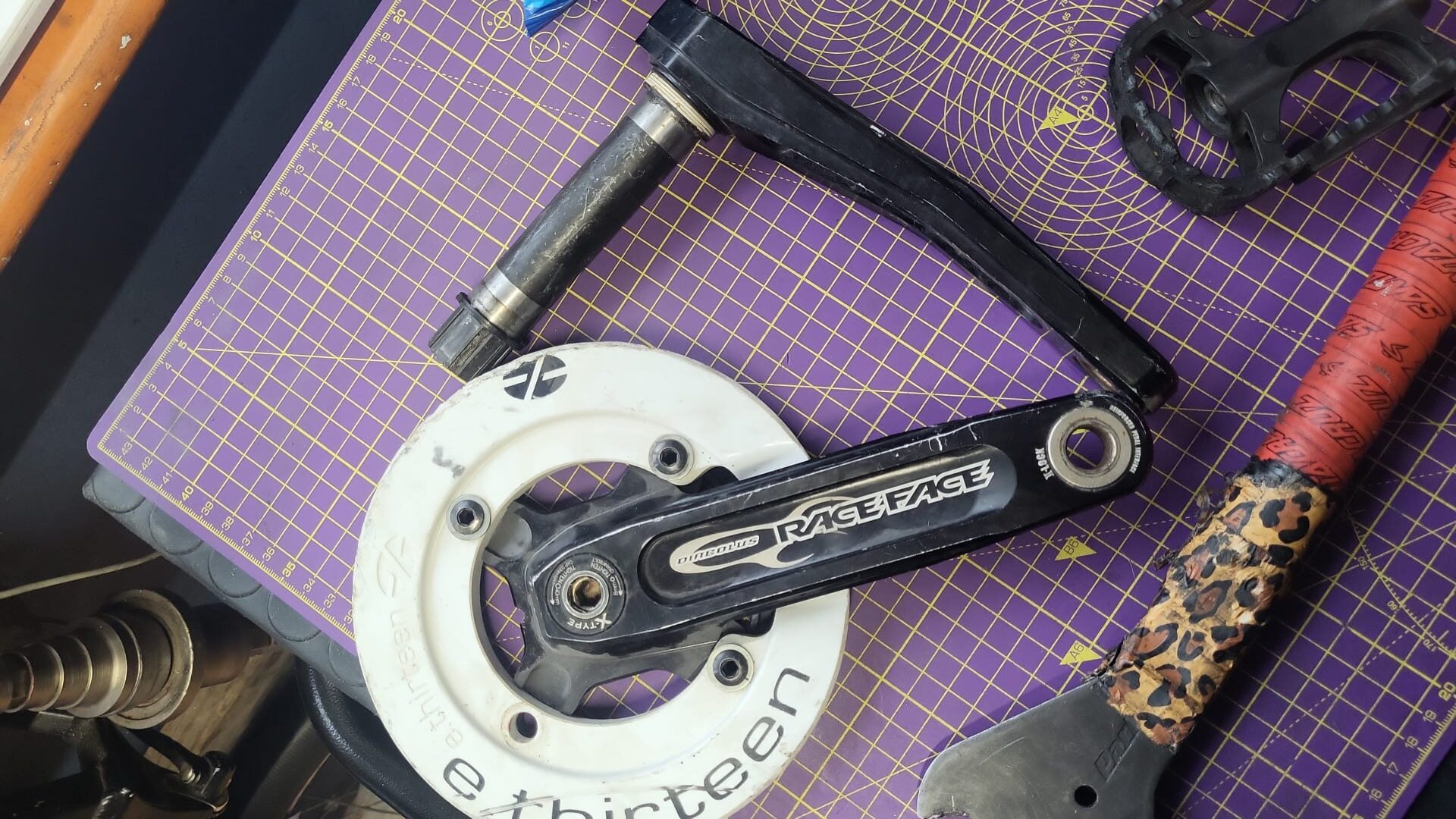 One of my old friends who I recently found out lives right nearby walked through the door with a giant bag of old rear mechs to donate, and sitting on the top of that bag like the burliest machined aluminium crown imaginable, a set of Raceface Diabolus DH cranks! There couldn’t be a more perfect crankset for this machine, built for the task, from the right era, ready to slot straight into the existing BB!