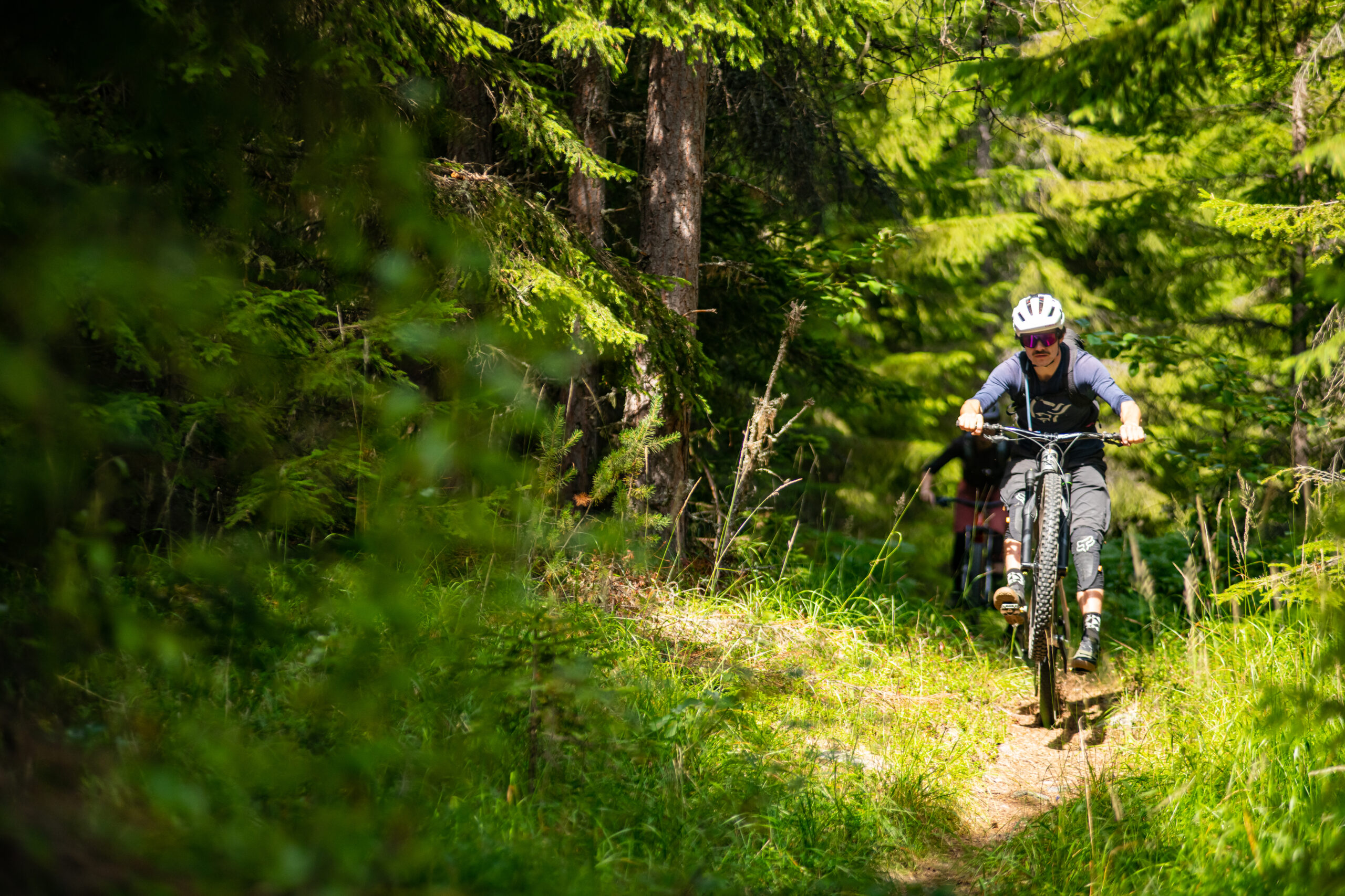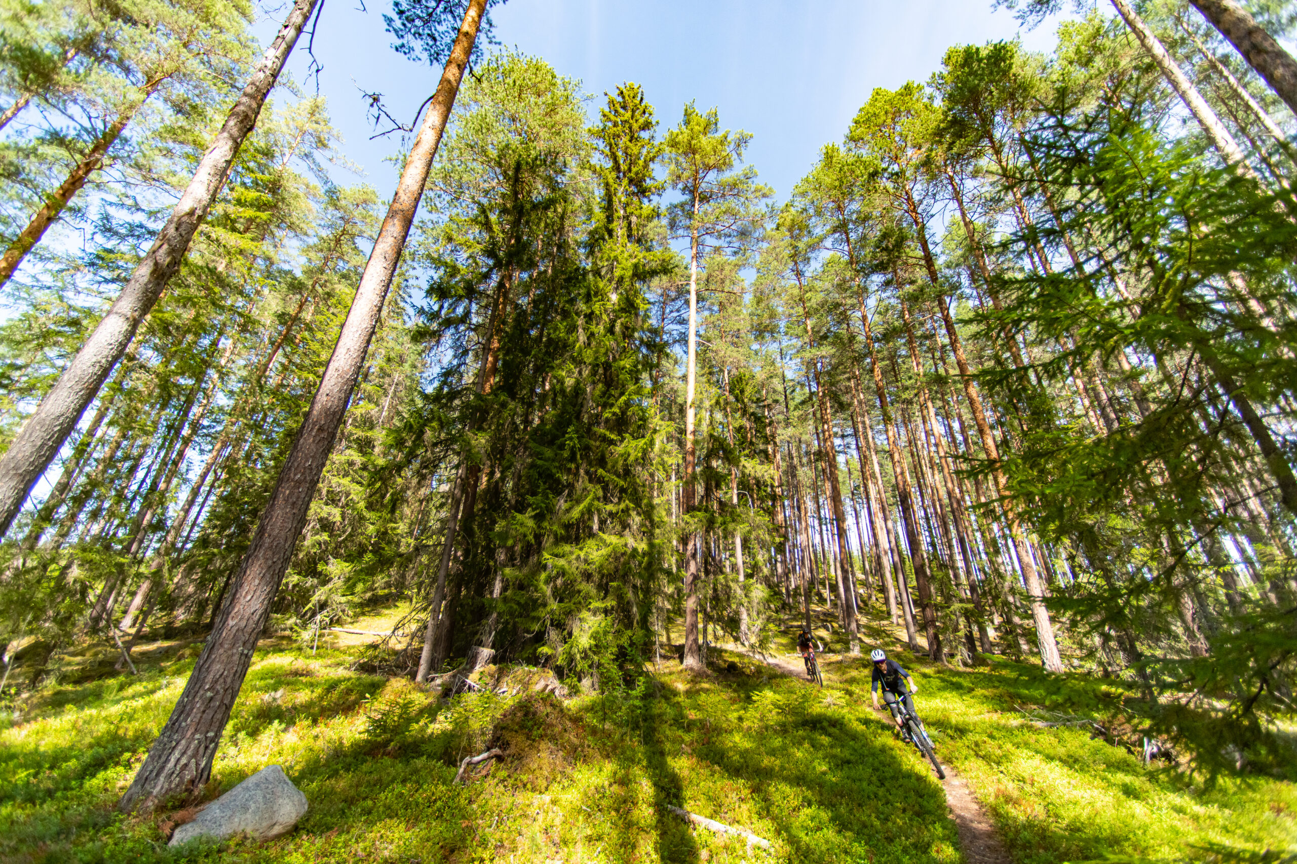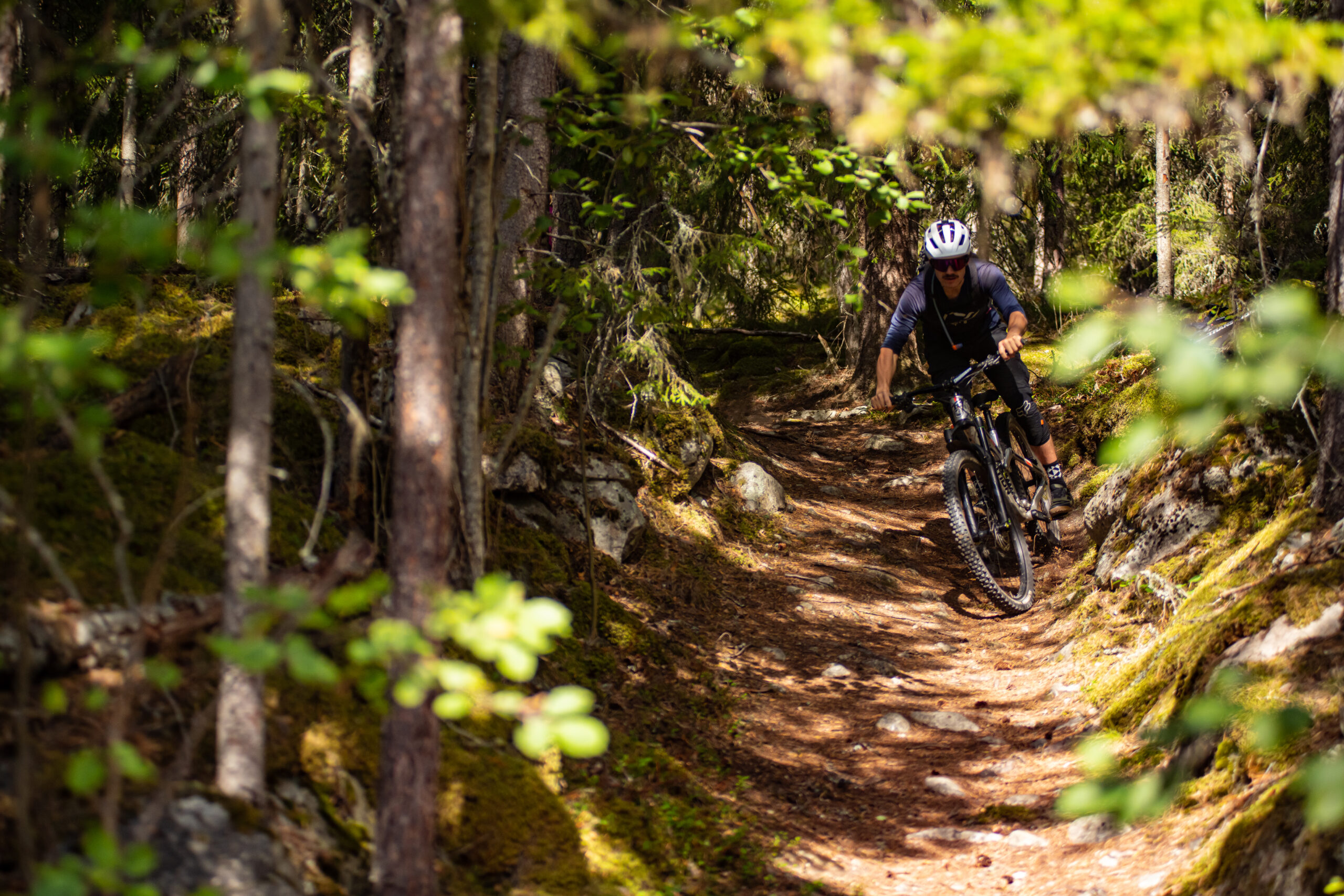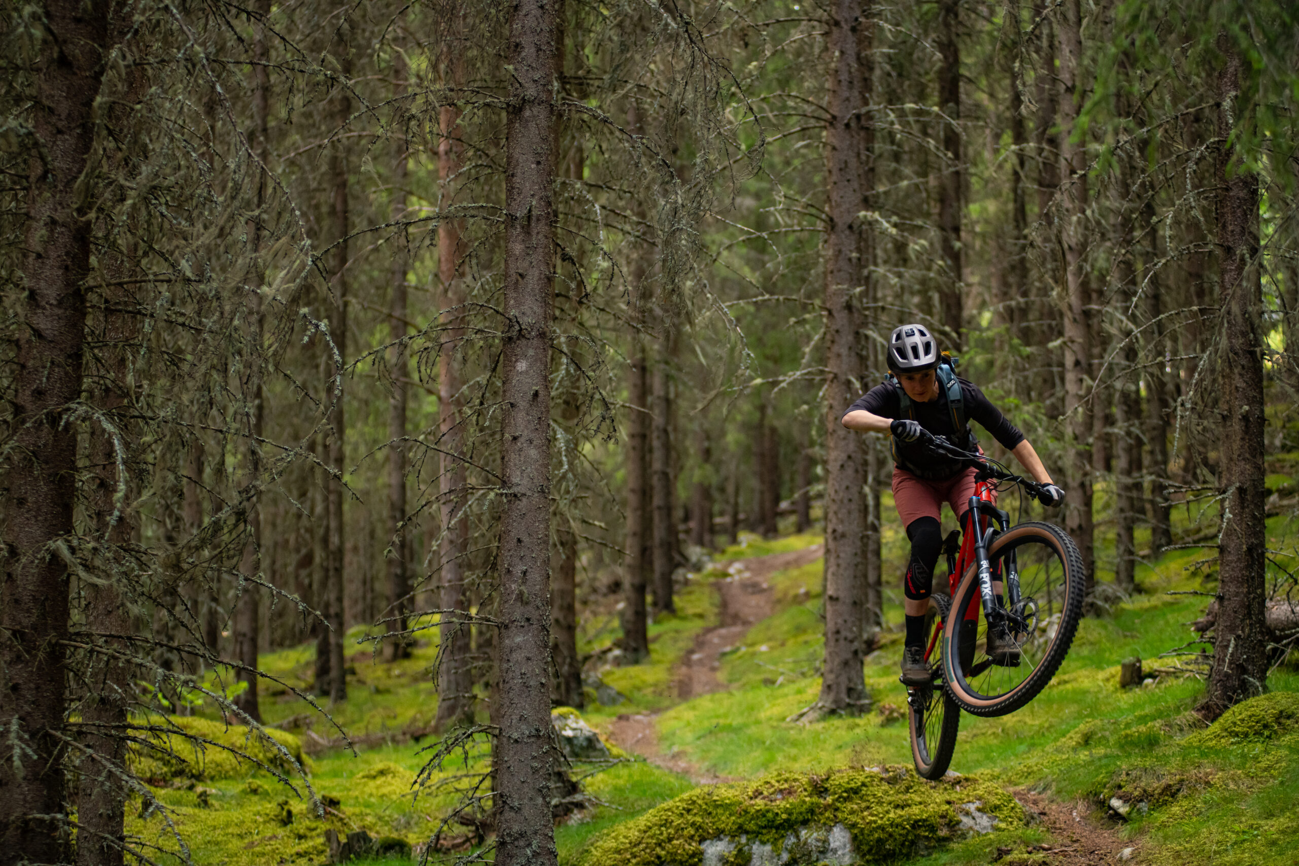It’s fairly obvious that we’ll drop a significant amount of height once atop the climb, with Gol huddled in a dogleg in the valley below. We waste no time in getting stuck into the descent. Half the hill is multi-line tractor track that hasn’t seen a vehicle in years. The many lines narrow into one without warning and losing the trail risks a tumble down the cliff. We essentially make a long, steady traverse of a very steep-sided valley with most of the exposure on our right, coming and going as we rattle our way off the hill. It takes a while for me to ignore the sheer drop and focus on going fast, but a minor wobble here would see you in a whole load of trouble very quickly indeed. Either you’d be careering through the tall pines, hoping not to be brought to a halt by one, or navigating the massive granite slabs that litter the forest.
