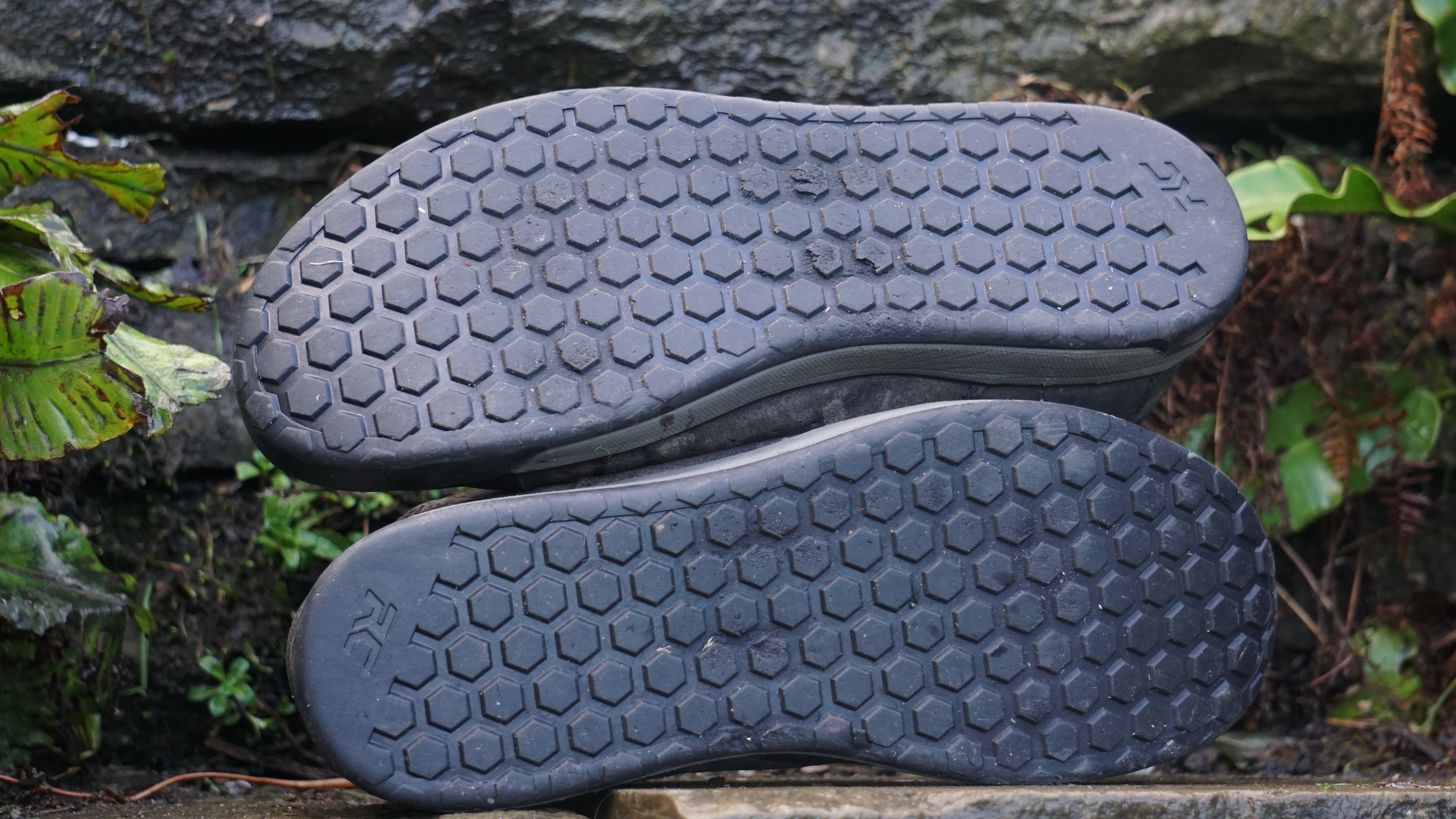 The combination of hexagonal tread pattern and grippy rubber do a good job of keeping your feet on the pedals on proper fast and rough tracks, and actually, that slightly less outright grip makes it easier to adjust your foot position when needed – just release a bit of pressure and shuffle your foot. Out of the three pedals I used them on, I’d say the shoes felt grippiest on the Nukeproof’s, then the DMR’s, then the Burgtec’s. Although it wasn’t a huge difference between them