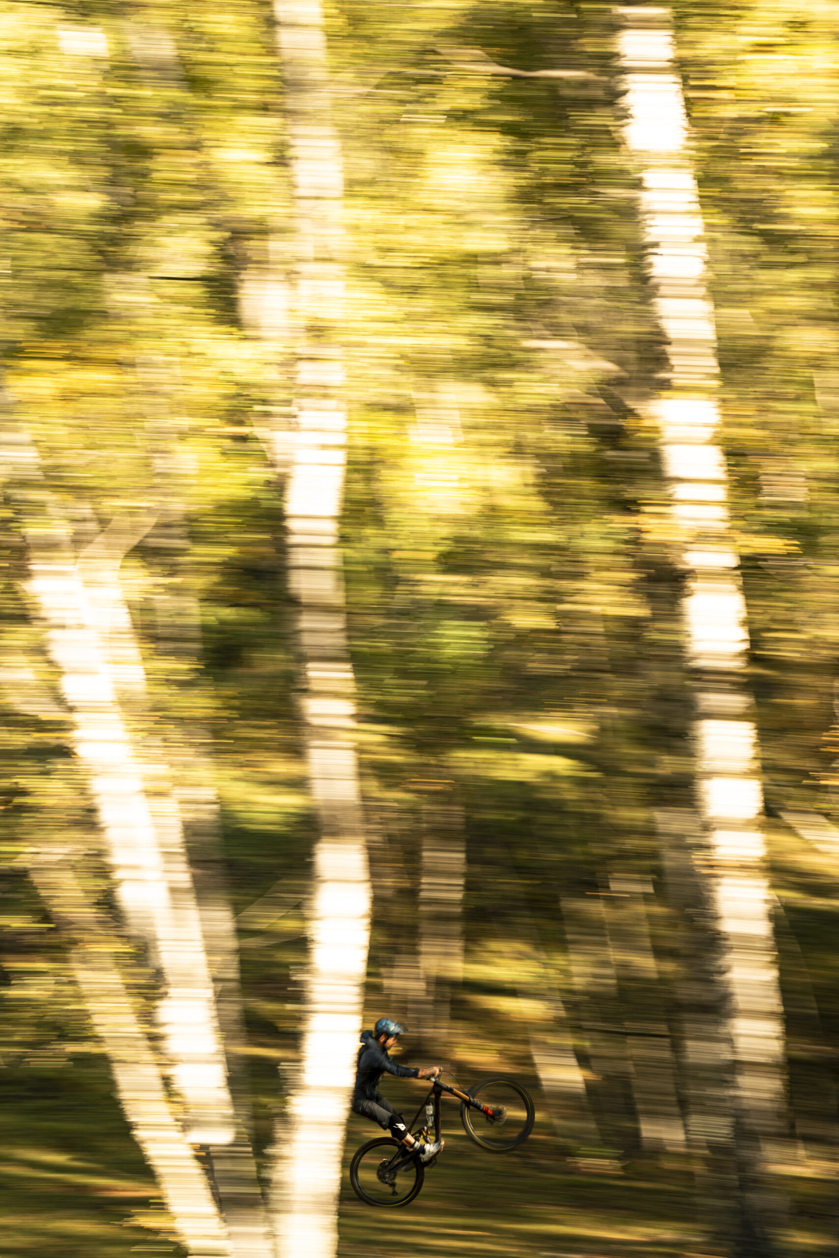 The rest of our descent becomes more and more fast and fluid. We can let go of the brakes without fear. We even have a hard time stopping to take pictures because we are carried away by the flow. The tracks are specially designed for mountain biking with modules allowing us to easily play with the trail. We make the most of a break to take a few tighter action images.