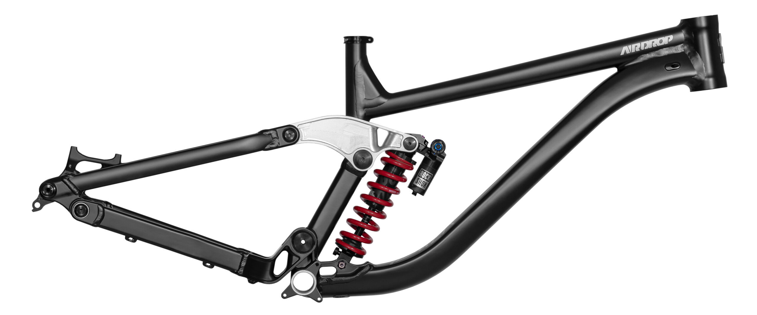 The Slacker uses a combination of hydroformed and extruded, internally and/or externally butted tubes. As a small-batch producer, we lean into CNC parts heavily. All lugs, hardware and pivots are CNC. The BB and main pivot are a single CNC unit and the lower shock mount is a CNC cradle. The rocker is a true one-piece design. Every Slacker frame comes with a brushed alloy head-badge, CNC axle and UDH hanger, seat clamp and an Airdrop reach adjust headset included.
