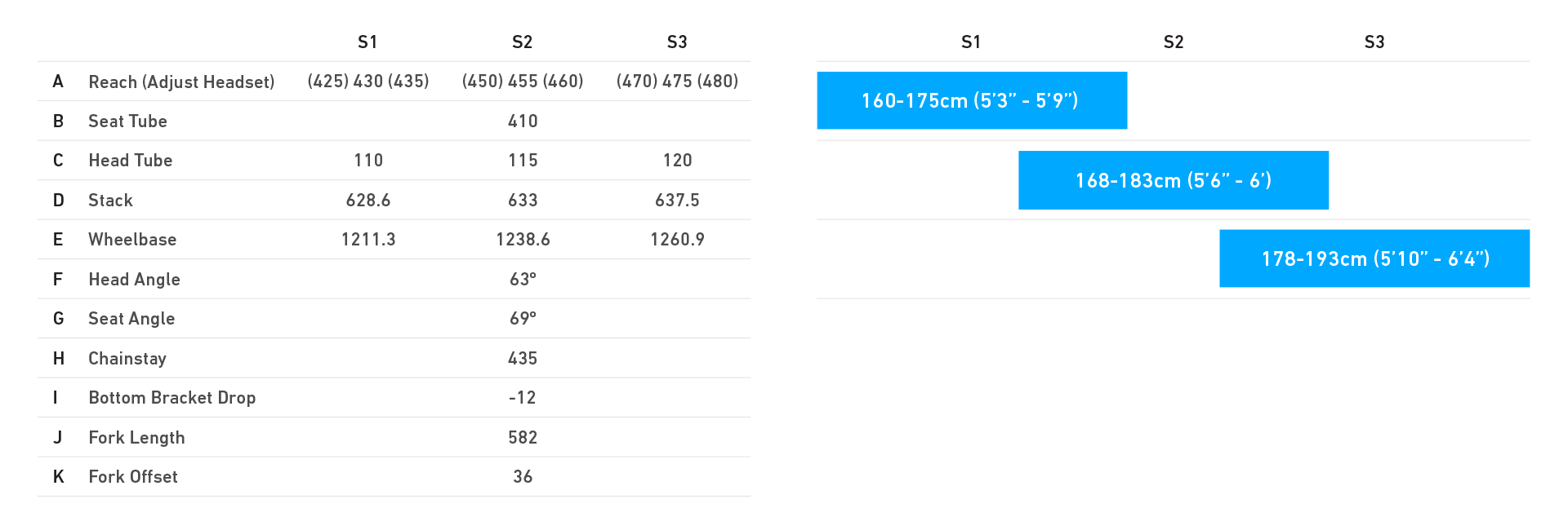 The Slacker is available in three sizes: S1, S2, S3. All sizes share the same seat-tube length but differ in terms of reach and stack. Additionally, every Slacker frame or build (excluding the Luxe, due to its tapered fork) comes with an Airdrop reach-adjust headset, providing a neutral, +5mm or -5mm position. The rider can choose their desired reach and further tune the on-trail feel.