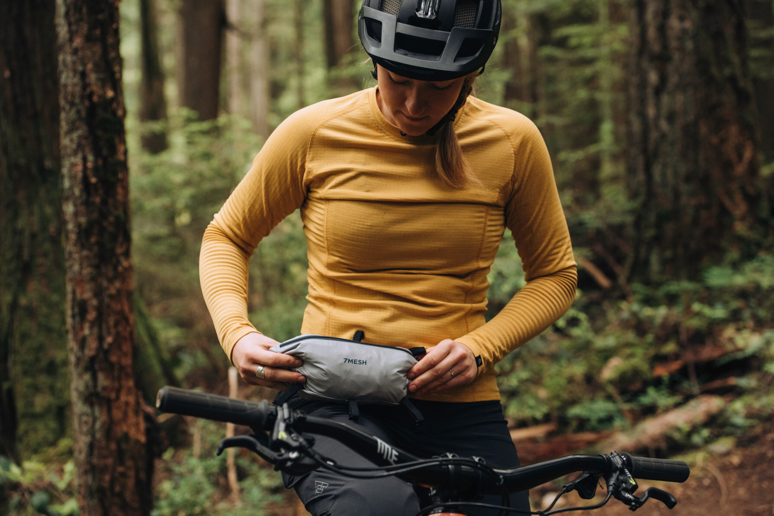 The changing coastal mountain weather of 7mesh’s Squamish home provided the perfect testing ground for the 7mesh design team and athletes as they tested iterations of the Stash pocket, elastic straps, and clip system. Perfected individually for each style, the Stash System allows attachment in a variety of places from handlebars to top tubes and seat posts.