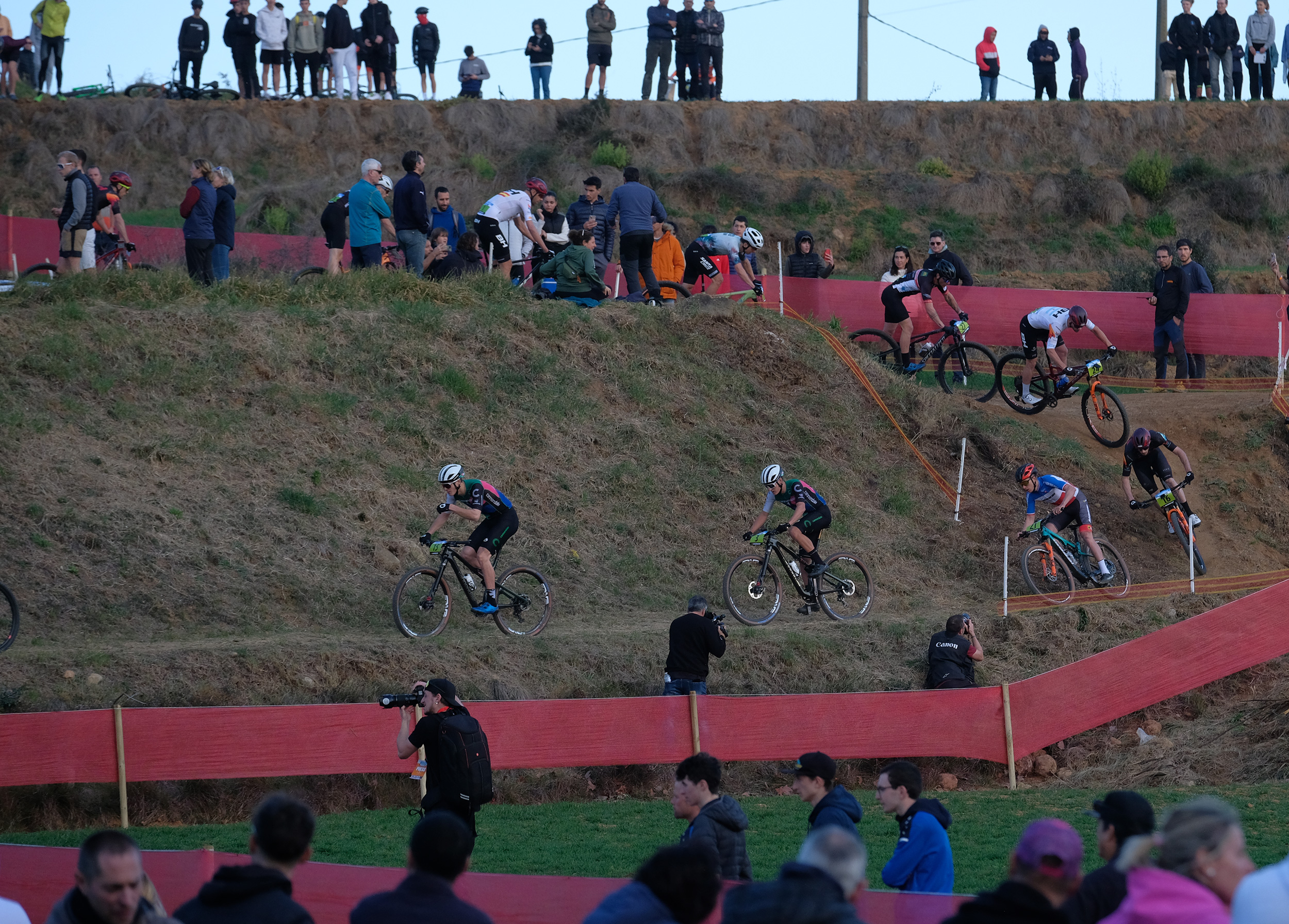 And with the mystery surrounding just who is going to be replacing the iconic Rob Warner in the commentary booth, now that Warner Bros/Discovery have bought the rights to broadcast UCI mountain biking up to the end of the decade, we have a few hunches that might pan out. Here’s a pic from the start of the men’s race of Ric Mclaughlin and Cedric Gracia – both had radio microphones with them, but weren’t part of the (trilingual!) live commentary at the event as far as I could tell. Ric has worked with Rob Warner at Red Bull and Cedric, well, is Cedric. Could this be our new commentary team? They’re here talking to Simon Burney, previously the UCI technical delegate, but now Head of Sport at the new ESO organisation. (Mind you, also at the race was Bart Brentjens, who often joined Warner in the commentary booth for cross country races. Hopefully we’ll find out soon.)