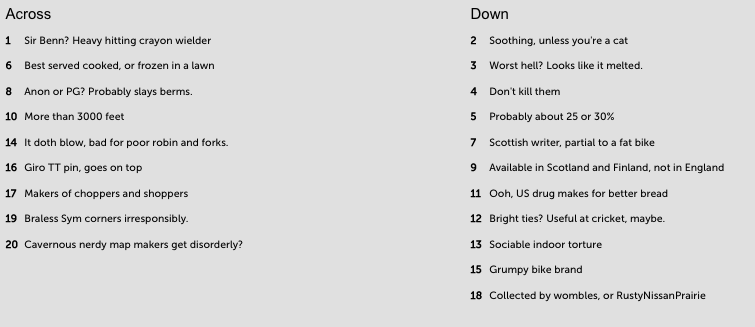 Oops! There\’s something to see here that only our full members get to see. Join us today for instant access to this content and more.Solution to Singletrack Crossword #4
