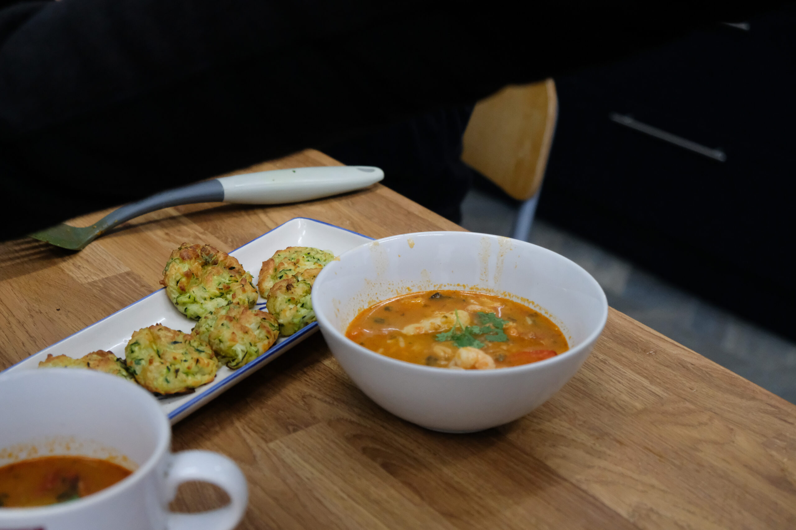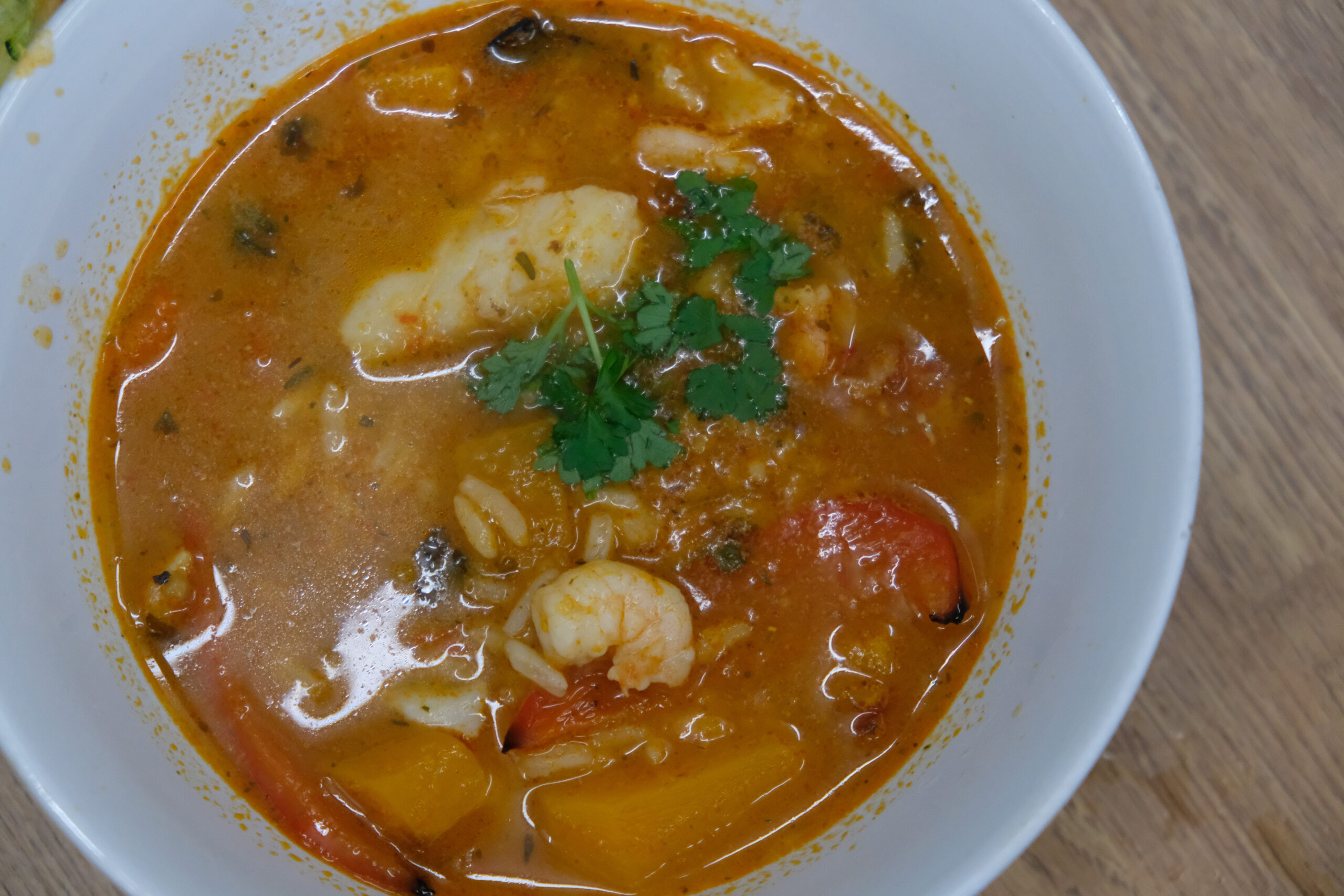 - Cook until the rice is cooked, adding the fish, prawns, red pepper and butternut for the last 10 minutes.