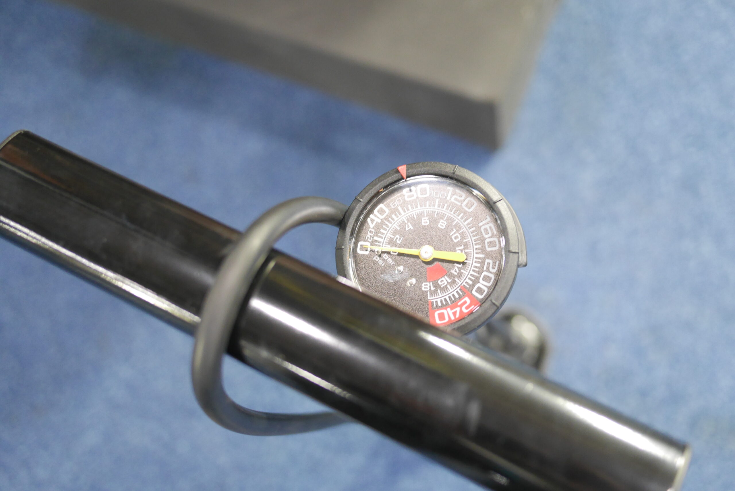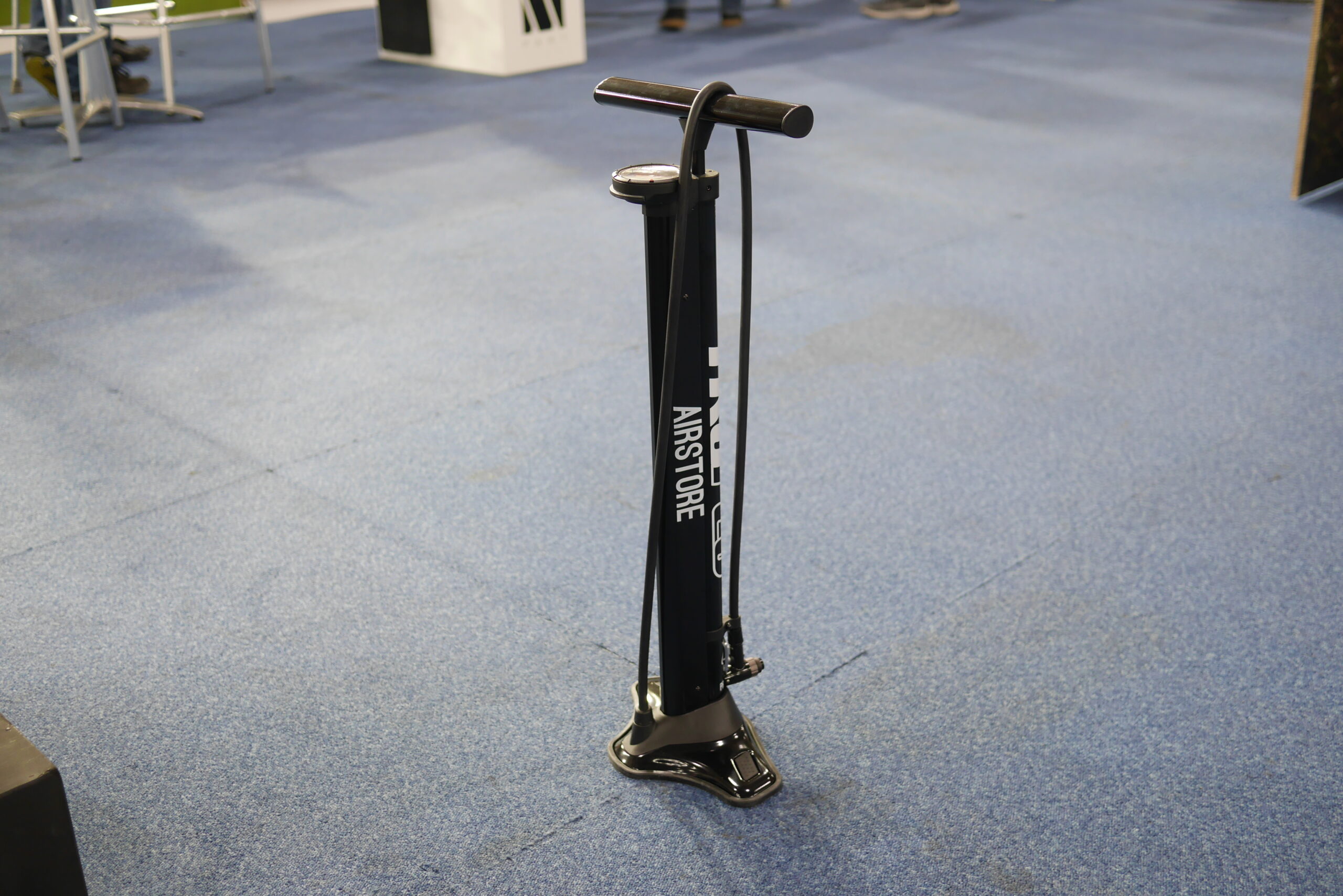Truflo Airstore tubeless track pump. One of those track pump with an optional tubeless mode for dumping a load of pre-pumped air in all at once. The gauge’s red panel of 240(!) psi makes us feel that nervous feeling of an imminent sticky explosion just by looking at it! Nice head on this pump. All Truflo track pumps have gone ‘smart’ by the way (ie. they work natively with presta or Schrader without swap-out faff).