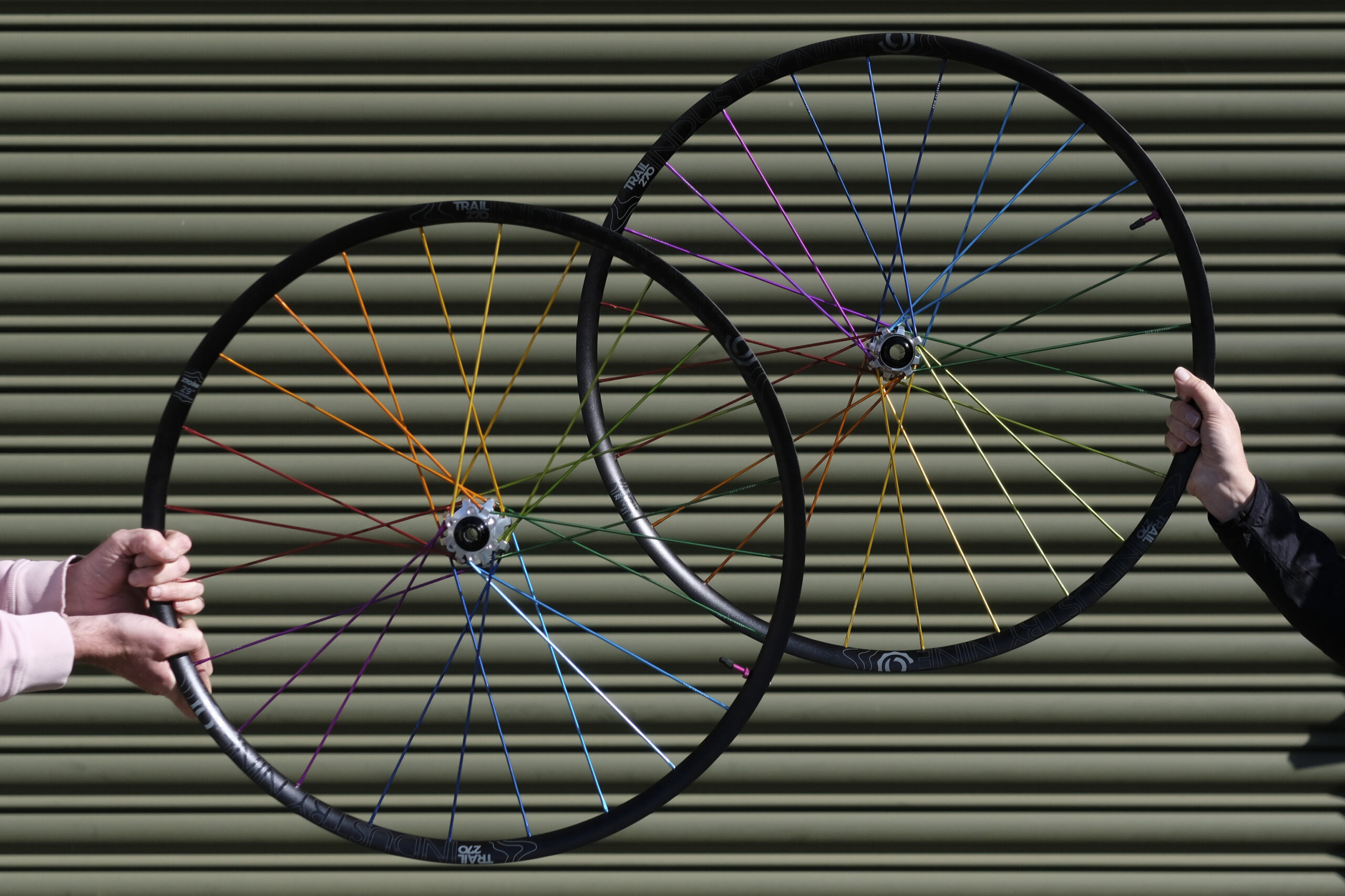 The wheelset I designed is essentially a pair of Industry Nine Trail 270 24H wheels, with rainbow coloured spokes. OMFG. They came in at 1,585g by the way.