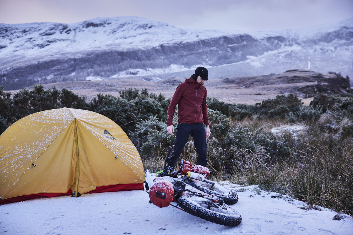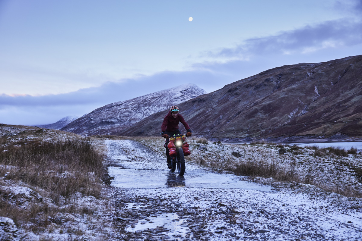 It lifted my morale to be finally dropping to the river. With edges frozen solid it was easily negotiated. However, the steep bank leading from the river posed another problem. I ate some food and braced myself once more for this seemingly endless battle. Three hours later, dawn was showing across the skyline and I could make out the Horn. The snow had stopped falling and the wind had dropped to not much more than the occasional breath – things were looking positive. It’s incredible the energy that first light brings when you’ve ridden through the night. With the growing light I could make out the path, and although unrideable, it made pushing and walking much easier. Rounding the Horn bought views down the valley and of my escape route, but the joy was short-lived. What should have been an epic flowing descent turned into a six-hour push to get down to Loch Stack. At one point on the descent I thought about putting my bike on the fly sheet of my tent and dragging it behind me. This was dismissed after thoughts of trashing my tent, which I would need to continue.