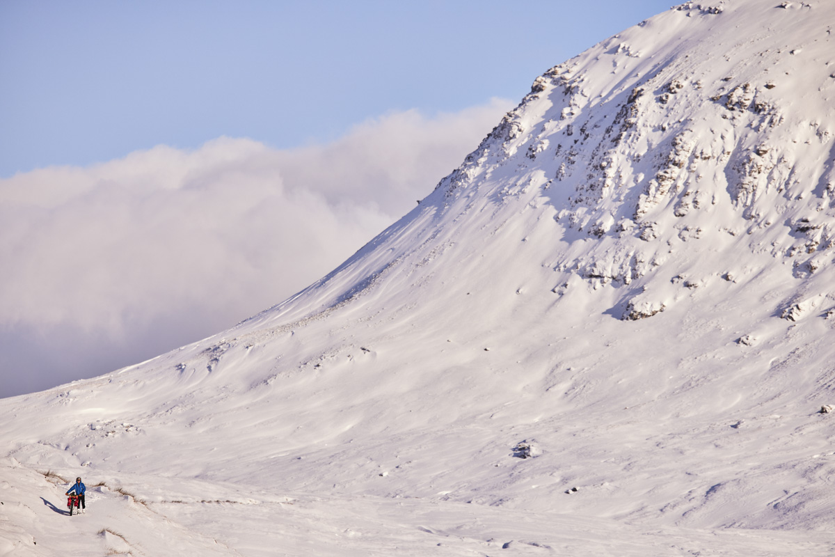 I was surprised at how much of the Glen I could ride – horror stories I’d heard sat heavy in my mind and I knew the riding wouldn’t last. As I left the forest and climbed the rib leading to the plateau, the increase in gradient became a battle. Lifting and lunging my bike forwards, it sank into the knee-deep snow. Two steps higher with my feet allowed me to once again repeat the effort. My pace slowed to a crawl and the hours ticked by. I heard that voice in my mind. ‘Stop! Turn back, this is pointless. It’s too hard.’ Listening, but refusing to hear, I knew the adventure I’d hoped for was about to begin.