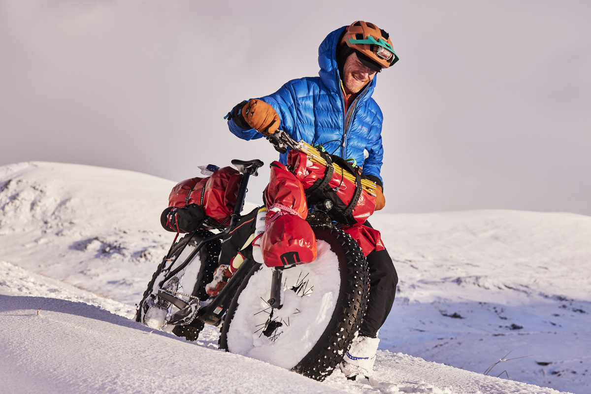 At 2am I was gassed. My arms began to cramp with the repeated strain; it had been hours since I had eaten anything besides sweet nonsense. I was about to run out of the water as it had slowly frozen inside my bottles. In the diffused beam of my torch, just to my left, was a boulder. About eight feet in height, it promised a spot to pitch my tent and gain the rest I required, having been on the move for 21 hours. I left my bike standing in the snow and ploughing my way over to the rock I attempted to flatten a ledge for my tent. Spindrift ripped across the top of the boulder carried by the relentless winds. As I got to the end of the patch I was clearing, I turned around – the snow was being replaced as fast as I had cleared it. Stopping wasn’t an option: I had to keep going. I struggled back to my bike, took a deep breath, and carried on following the line on the GPS.