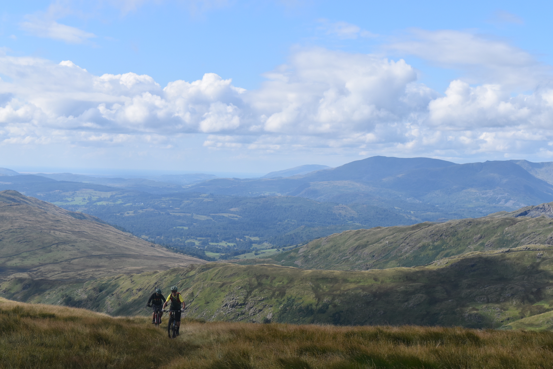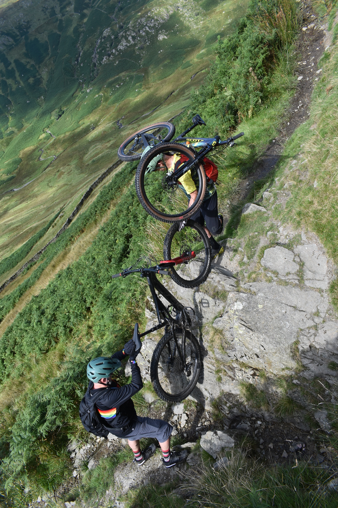 As we gradually gained height, the whole of the South Lakes plus the third best county in England (Lancashire – a distant runner-up to Cumbria and, of course, Yorkshire) opened up behind us while the neighbouring peaks we could spot grew exponentially in number. An awkward carry up a stone section afforded Mark a moment for a bit of Zen-like cross-legged contemplation. Nick gave us a masterclass in sheer, bloody-minded determination as he fought his way up a particularly steep section of grassy trail. There may have been some less than helpful words of, err, encouragement and commendation being uttered when he finally spun out. Catching up with him, we pondered the question of why the Romans went over the mountain instead of through the valley far below. Nick revealed a hitherto unknown David Starkey-esque side to his character, waxing lyrical with tales of how the landscape was formerly a jumbled mess of forest and bog meaning ambush from ticked-off locals was an ever-present possibility. Culturally enriched, it felt like no time at all that we attained the saddle between Beacon and Thornthwaite Crag. With a vertiginous drop down into the undeniably impressive Kentmere Valley far below, we were reminded just how high we had come as the wind whipped in across the tops, lending a chill to the proceedings that none of us had experienced for many a month. Pressing on around the edge of the hillside on a precipitous section of singletrack from which a fall would be in the decidedly consequential column, we took turns to re-ride one particularly challenging section which ultimately none of us managed to clean. I am surprised that our helpful comments such as ‘Try not to f**k it up as it is a loooong way down!’ and ‘Remember to throw your bike to safety when you are falling, yeah?’ did not aid our passage. Curious.