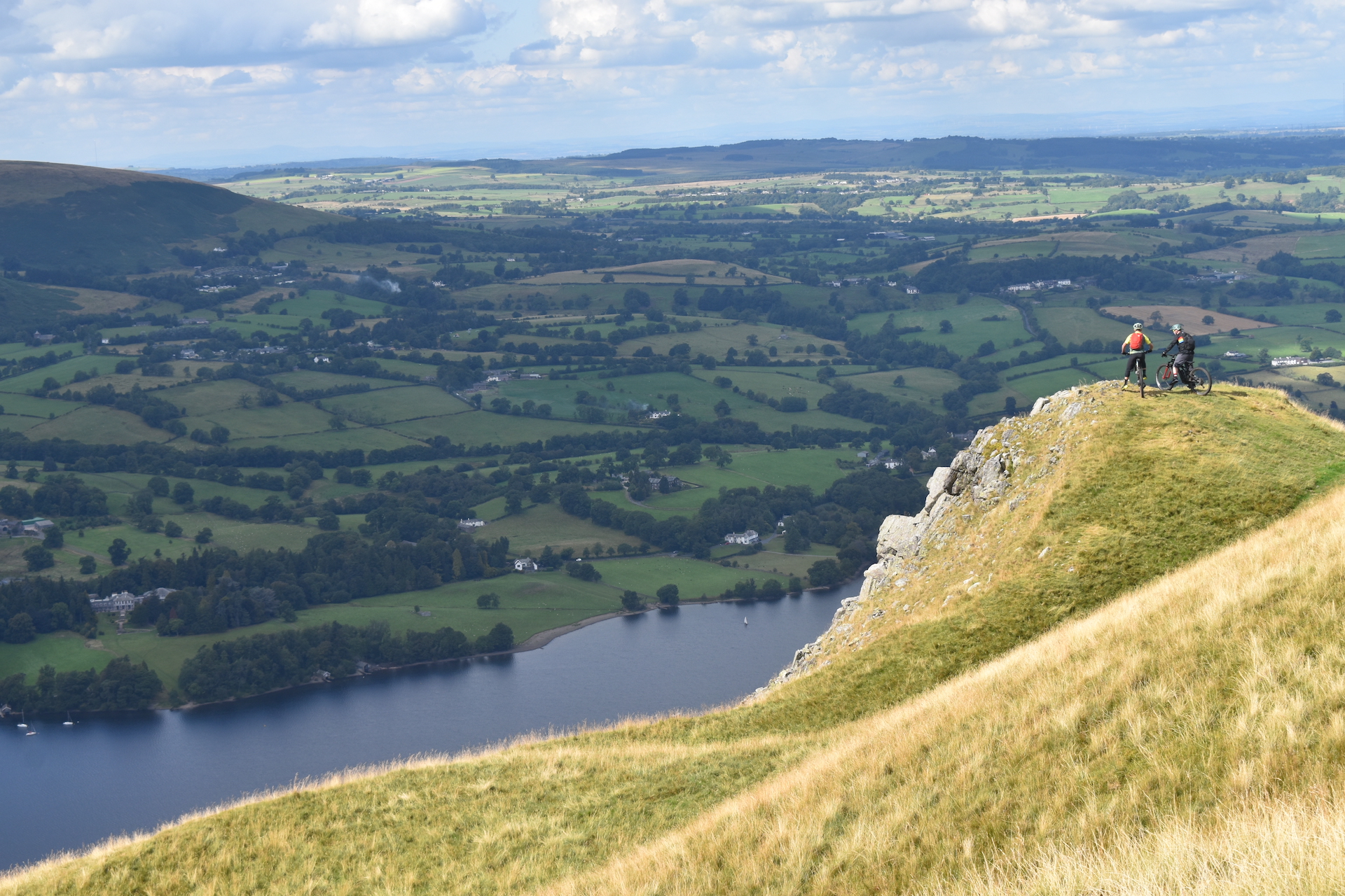 Passing a tiny tarn, I have to admit to getting more than a little excited as I realised this was the exact spot where my path to zero riches and even less glory started as a cover model for issue 8 of this venerable publication. “Quick! Take a picture!”, I shouted to an obliging Mark. My excitement was tempered by the fact that about a minute later we found the actual tarn where Mark had taken the shot first time around. Doh! Approaching mid-afternoon, white fluffy clouds were peppering the sky while the sun shot rays of golden goodness on the tinder dry grass. We were making decent progress, although Skiddaw seemed no closer than it had been two hours previously. Upping the pace a little, we continued our holding pattern of climb and descend until we finally saw Pooley Bridge in the distance, signifying that our 20-odd kilometre traverse was finally heading in the right direction. It’s no exaggeration to say that we were all pleased to reach the bustling little village as part one of our adventure had proven successful. Mark wasn’t ready to puke, his e-bike was proving to be a real ride improver and we were all having fun. So far, so very good.