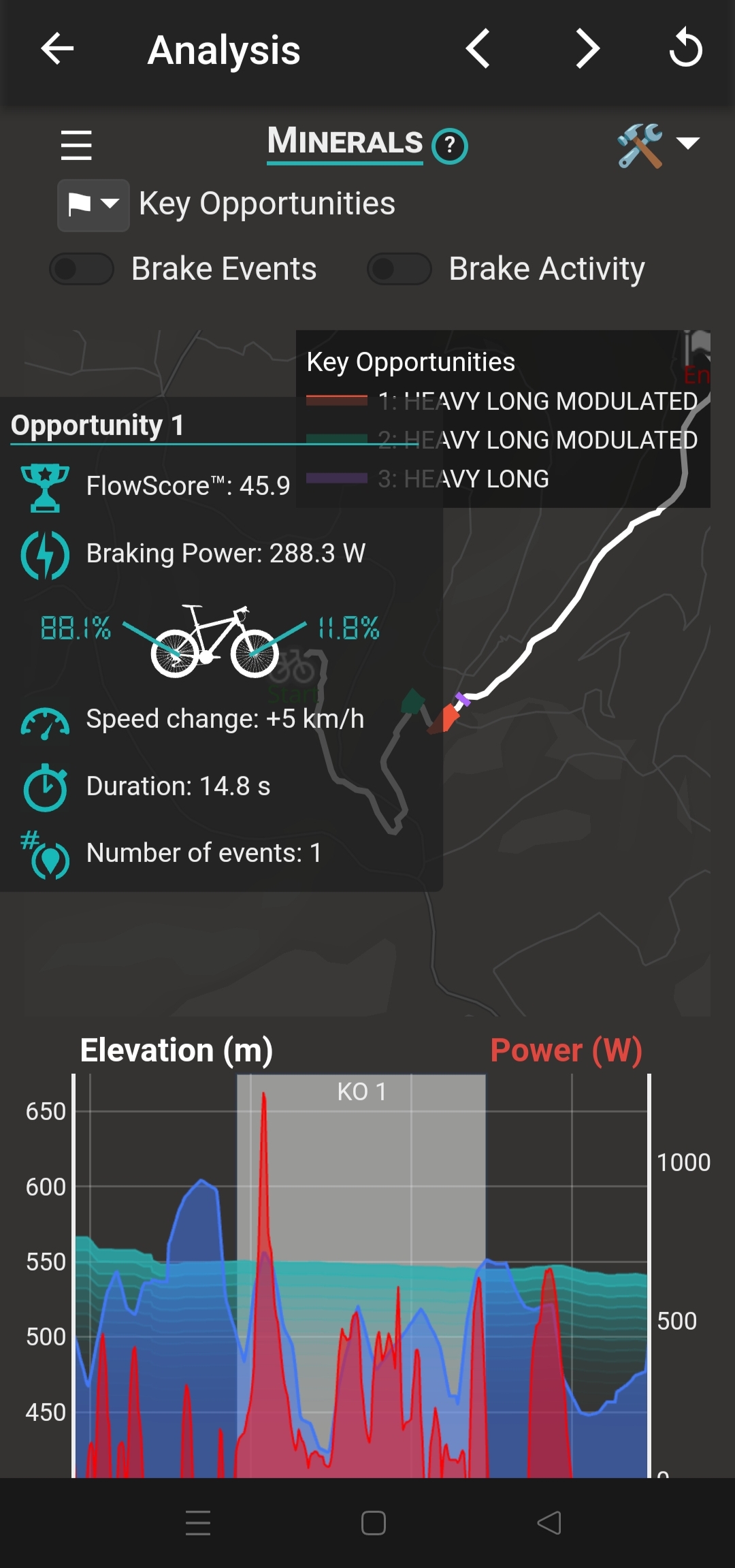 The BrakeAce app identifies your 3 Key Opportunities- your personalized insights into where and how you can improve. Utilizing the 4-step BrakeAce Method, riders can capitalize on their Key Opportunities for better trail flow. As you improve, new Key Opportunities arise. BrakeAce assesses your riding based on Modulation, Duration, and Intensity of braking, and provides feedback on how you are using your front and rear brakes. Brake events are categorized into types such as Brake Checks and Stabs, which can be easily compared with your riding buddies.