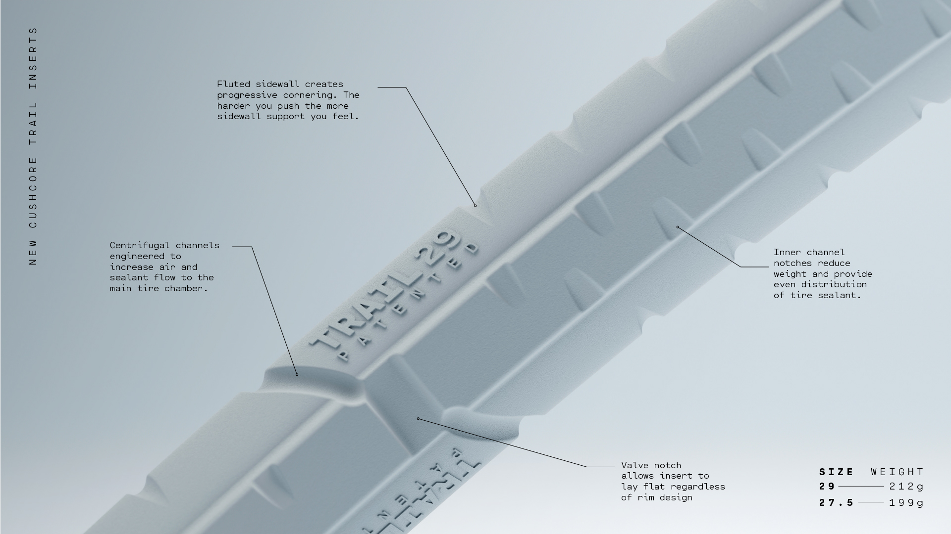 “The fluted sidewall design provides progressive sidewall support: the harder you push, the more support you feel. CushCore TRAIL enables supple tire response on flat corners and a stable sidewall when railing berms.” – Austin Sanford, CushCore Engineer