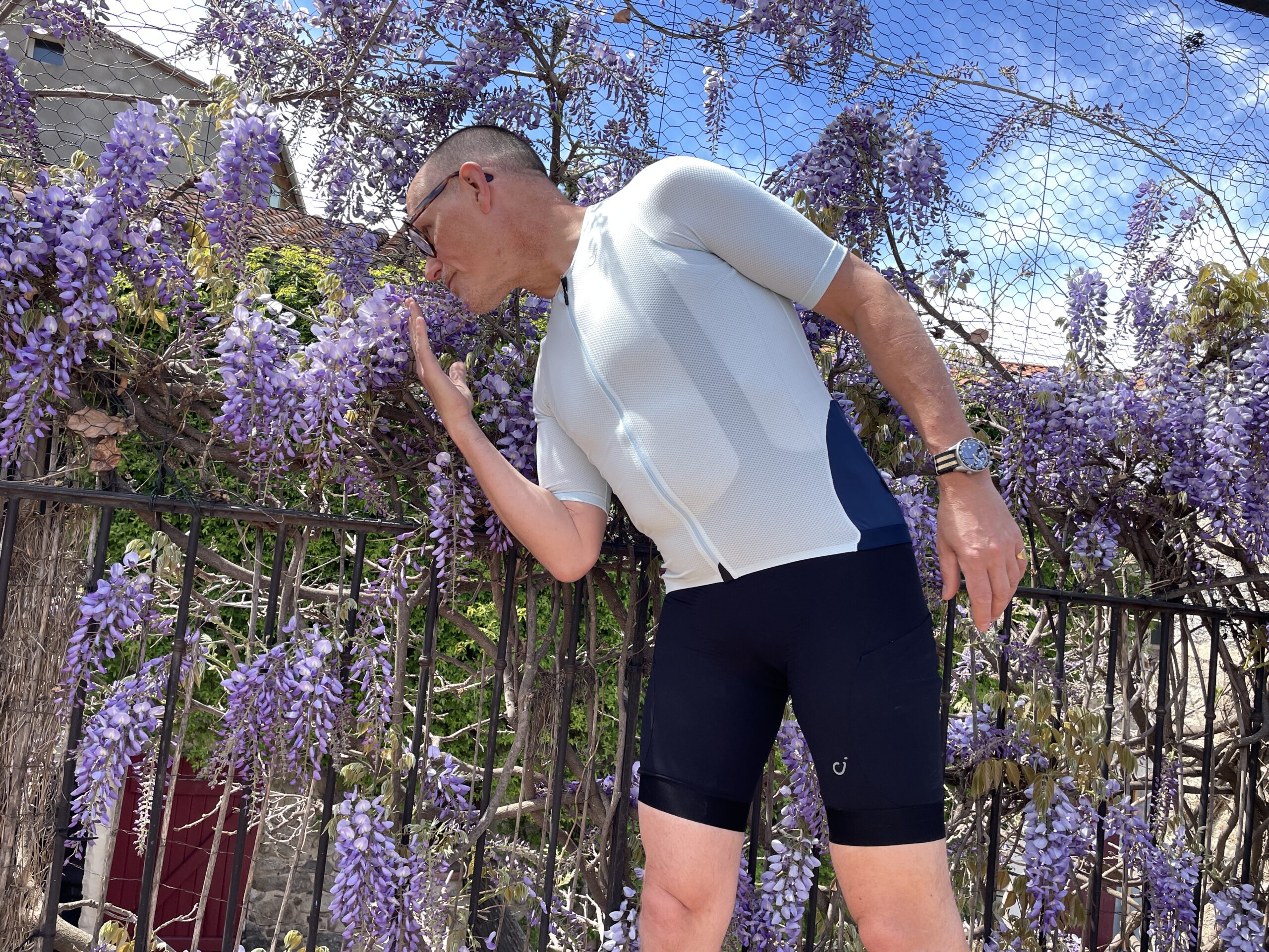 More ‘Chipps in Lycra’ – for which we can only apologise. Unfortunately, he’s the only person on the team who can test hot-weather cycling gear at the moment… Here’s the Velocio CONCEPT Radiator Jersey. Apparently, the Polartec Delta Mesh Radiator fabric wicks and absorbs moisture so effectively, it’s actually cooler than wearing nothing at all. With SPF protection throughout the sun-exposed shoulders and back and reinforced pockets that won’t budge when fully loaded, this is what you want when you’re going big on a hot day. Don’t forget to wear your vest, though. It’s virtually transparent.