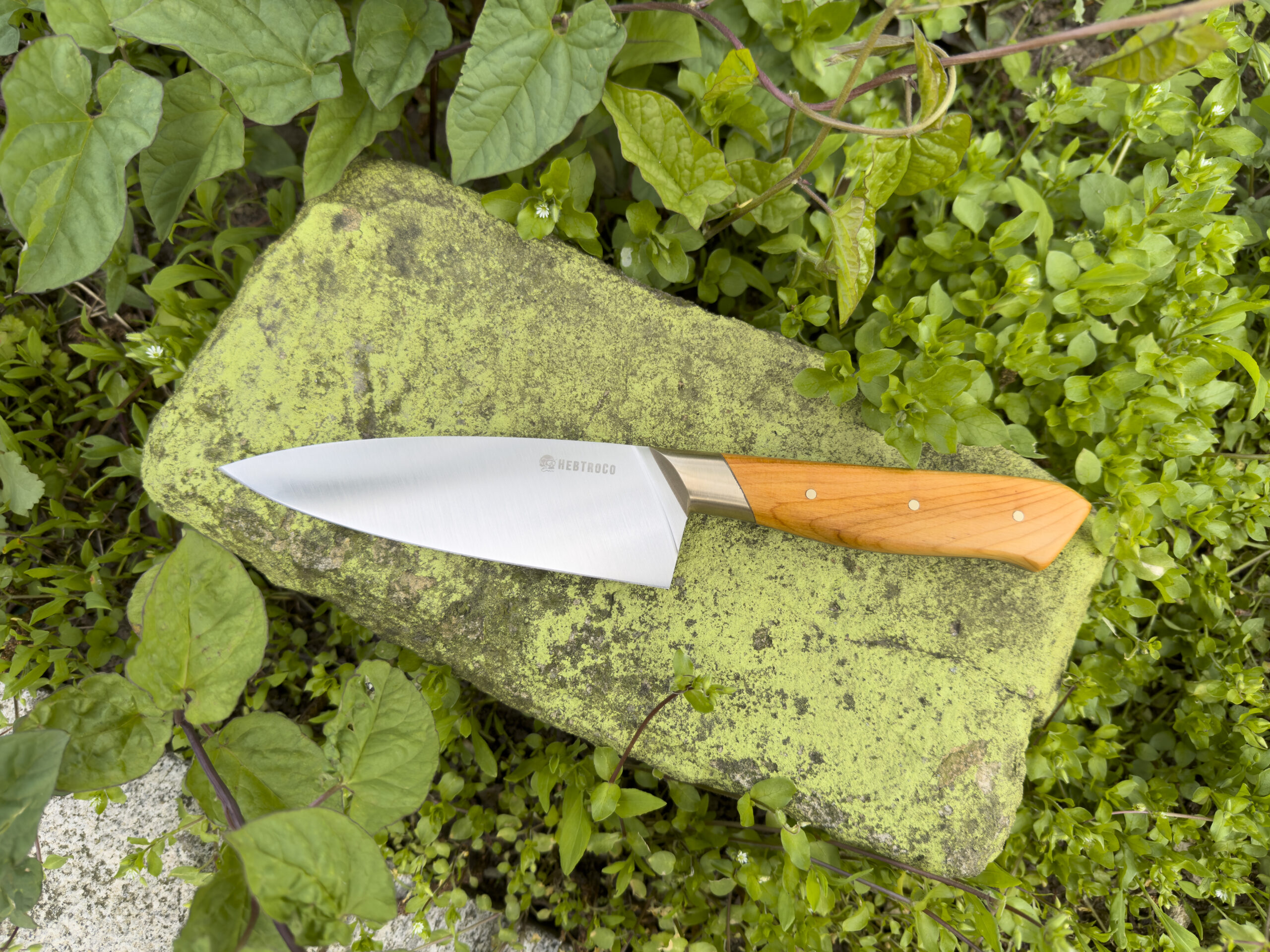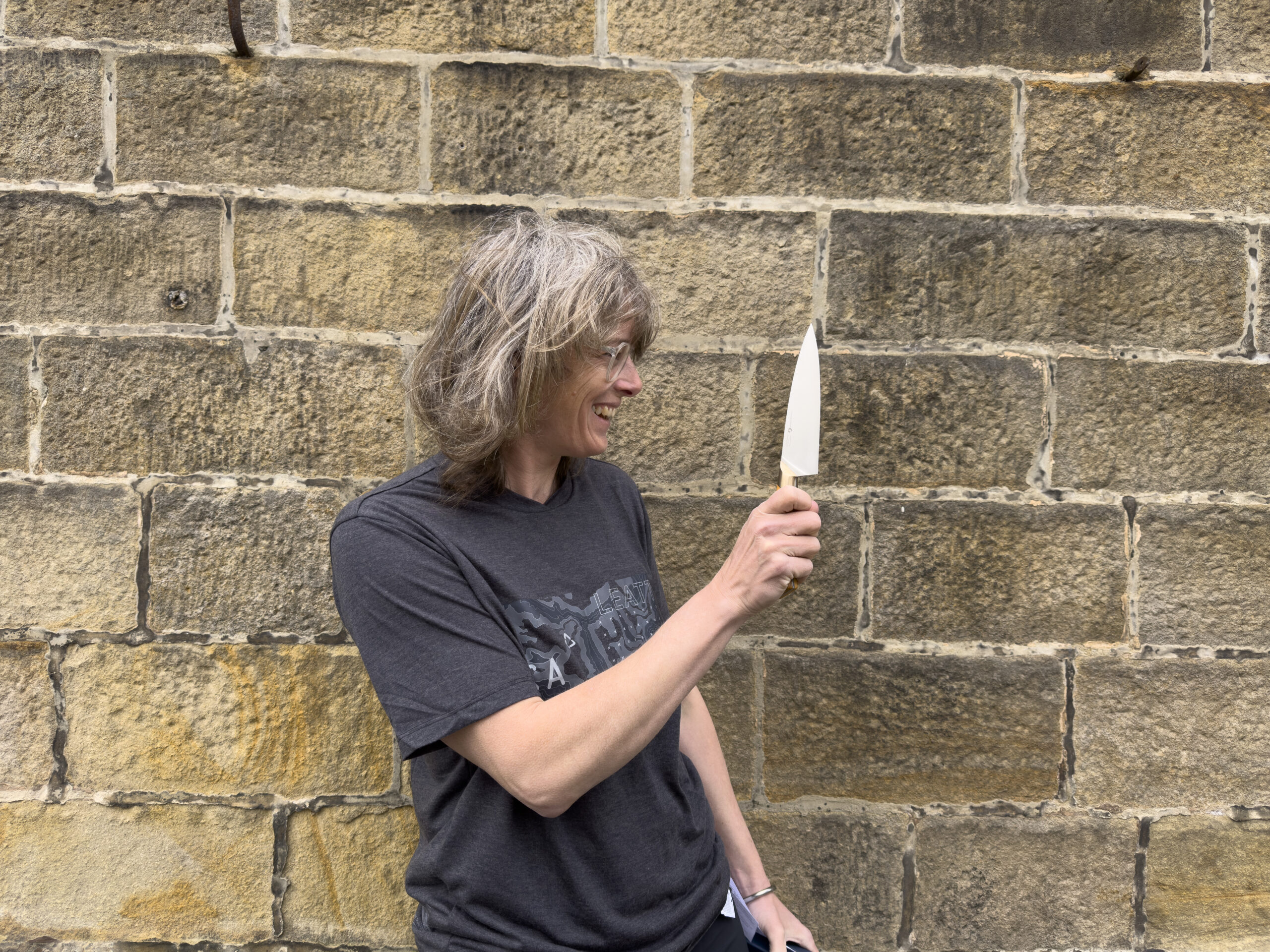 While we all eagerly await the HebtroCo/TJagain makeover, here at ST Towers we have hardware from the trouser boys. This knife is made in Sheffield and is 6 inches long. You don’t need to be a chef to use it. But it is sharp, so you do need to be careful. It comes with a first free sharpening from Community Cutlery knife sharpeners in Ilkley, so you should be able to keep slicing tomatoes nice an easily for the foreseeable future. The handle is made from yew, the blade is made from steel – apparently a fine grained steel originally designed for razor blades. Hannah likes cooking, and chopping. She hates washing up. You shouldn’t put this knife in the dishwasher. Luckily, she is getting married. Her 12 year old is unimpressed that it comes from Sheffield. ‘What’s so special about Sheffield?’ he says. But he is impressed with its slicing abilities.