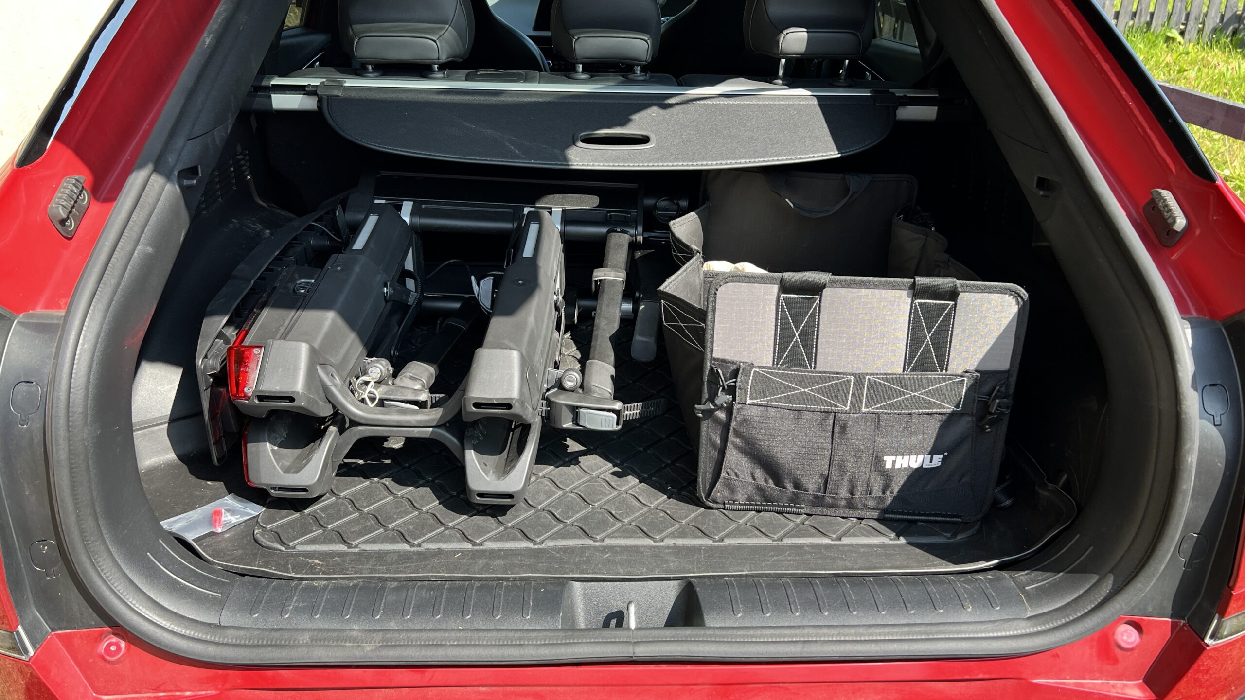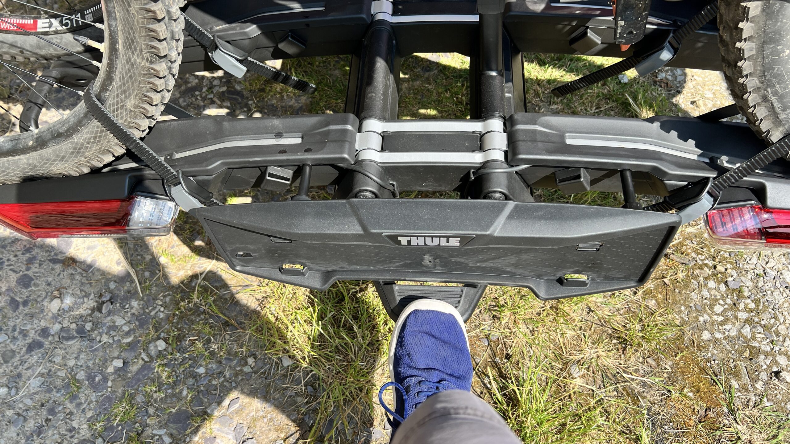 This is a very expensive rack, but crikey! It’s a joy to use. certainly in the first ride out we’ve done with it. The EPOS 2 holds two bikes and attaching them is really easy and quick. Gone are the normal screw clamps of previous Thule racks and in are quick ratchet straps and folding arms. The lighting board is built in so you just hook up the the electric point, add your number plate and go. The USP though is how it collapses into something the size of a medium suitcase that can just sit in your boot.