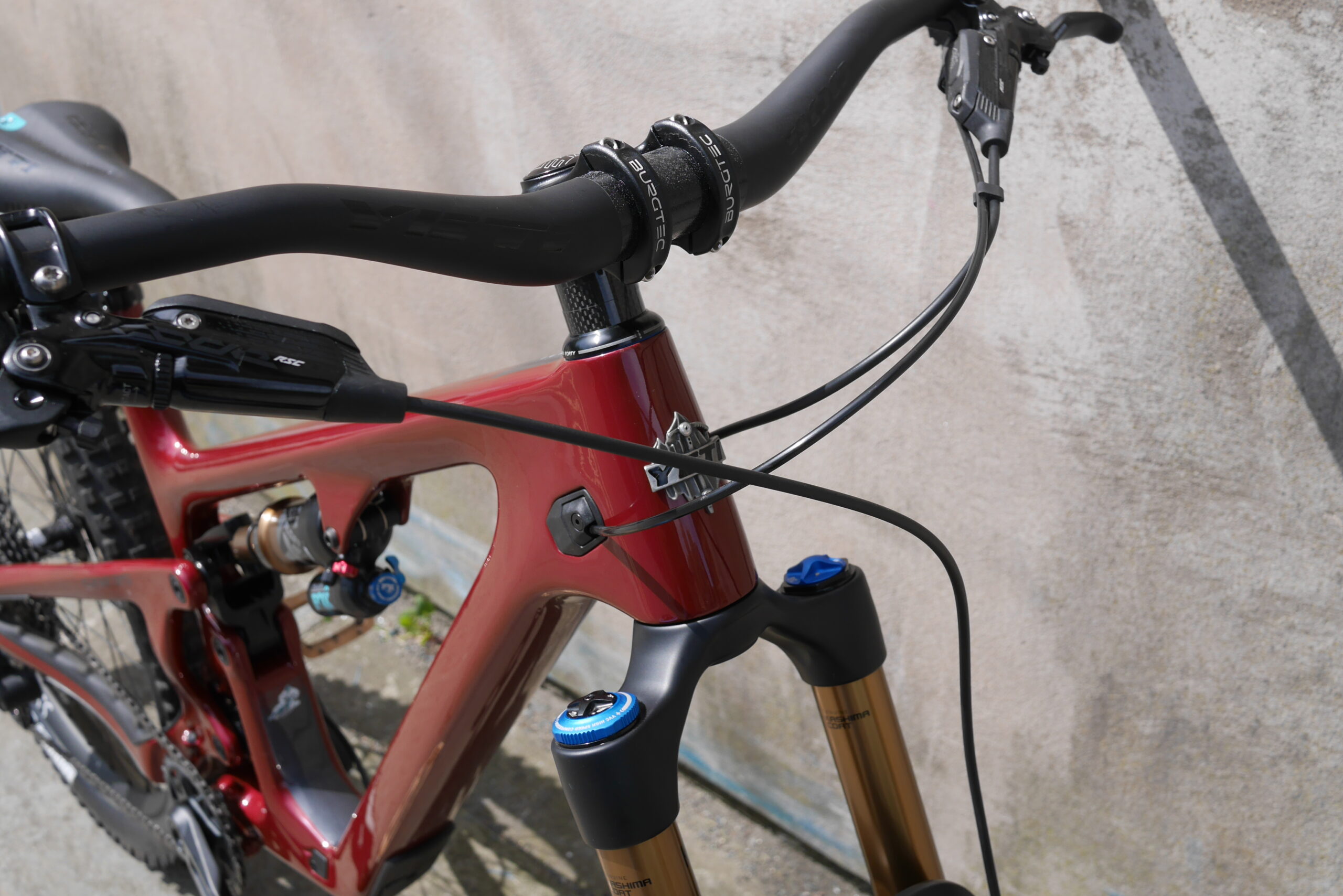 The Trail 40 name comes from the massive 40mm (external, 35mm internal)) width of these Ritchey rims. Using some kind of Ritchey magic, the deep section rims don’t appear to need rim tape, so we have no idea how you fiddle a new spoke nipple in there, but it does mean that there’s nowhere for pesky air to leak out. The wheels are handbuilt and signed by the builder, using 28 J-bend spokes in a two-cross pattern. Freehub is SRAM XD (as here) or 9/10/11 speed Shimano. These are 27.5in wheels, and designed for 2.4-2.8in rubber… Valves are included.