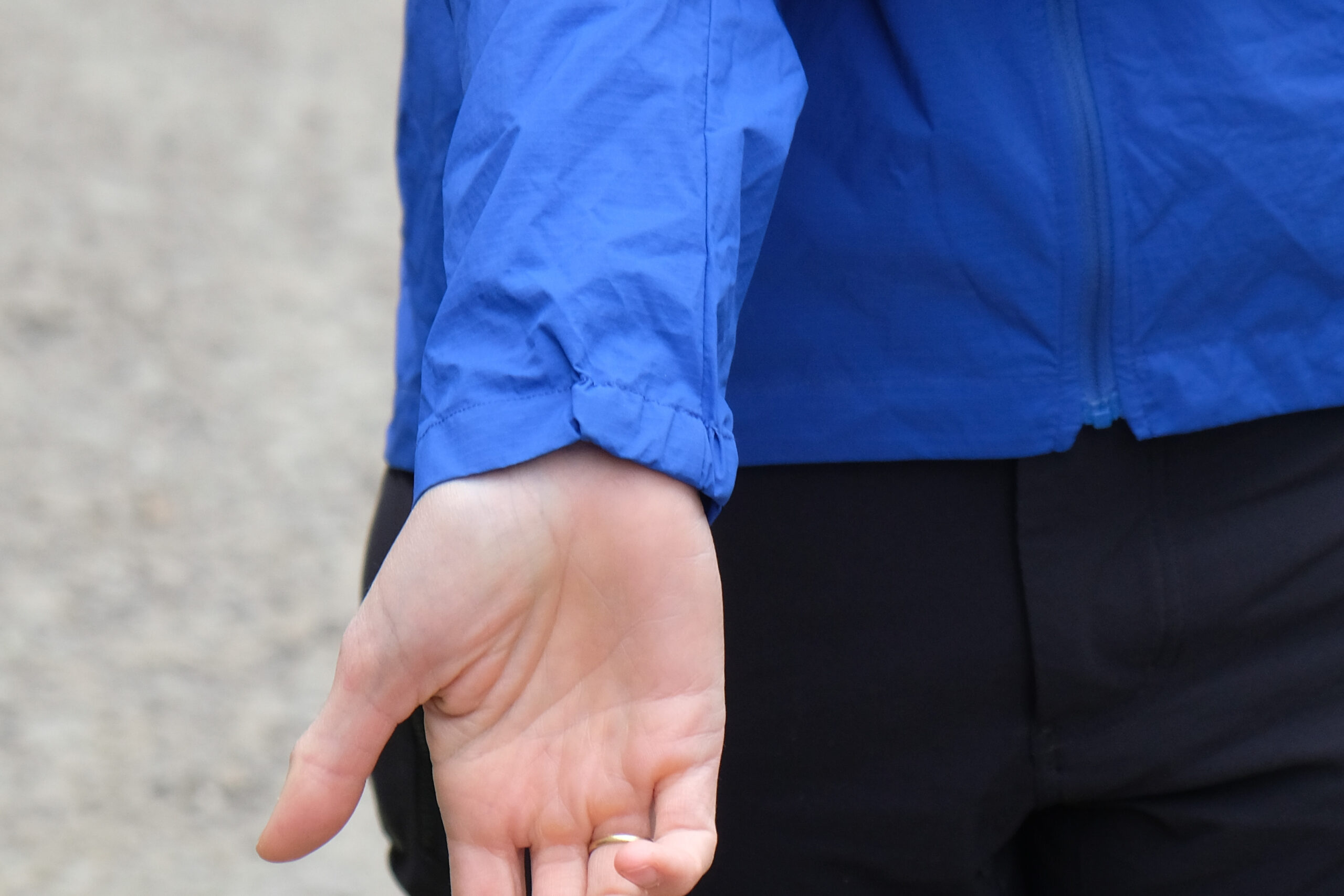 The sleeves have ~2in elasticated section on the cuffs, and they’re loose enough to pull your sleeves up, yet I haven’t found that wind gets up them. Wind doesn’t penetrate the jacket if you zip it up and make sure the hood is secure. It is not very breathable and I’ve had a few rides with a boil in the bag effect if I leave it on for long climbs. I have been impressed with the water resistance, so I guess the lack of breathability is a compromise to have a super lightweight layer that can fight off unexpected showers, or puddle splashes.