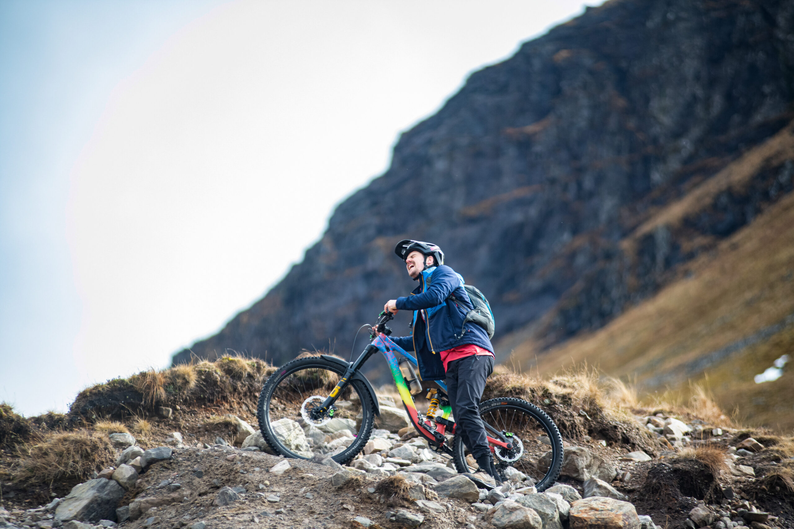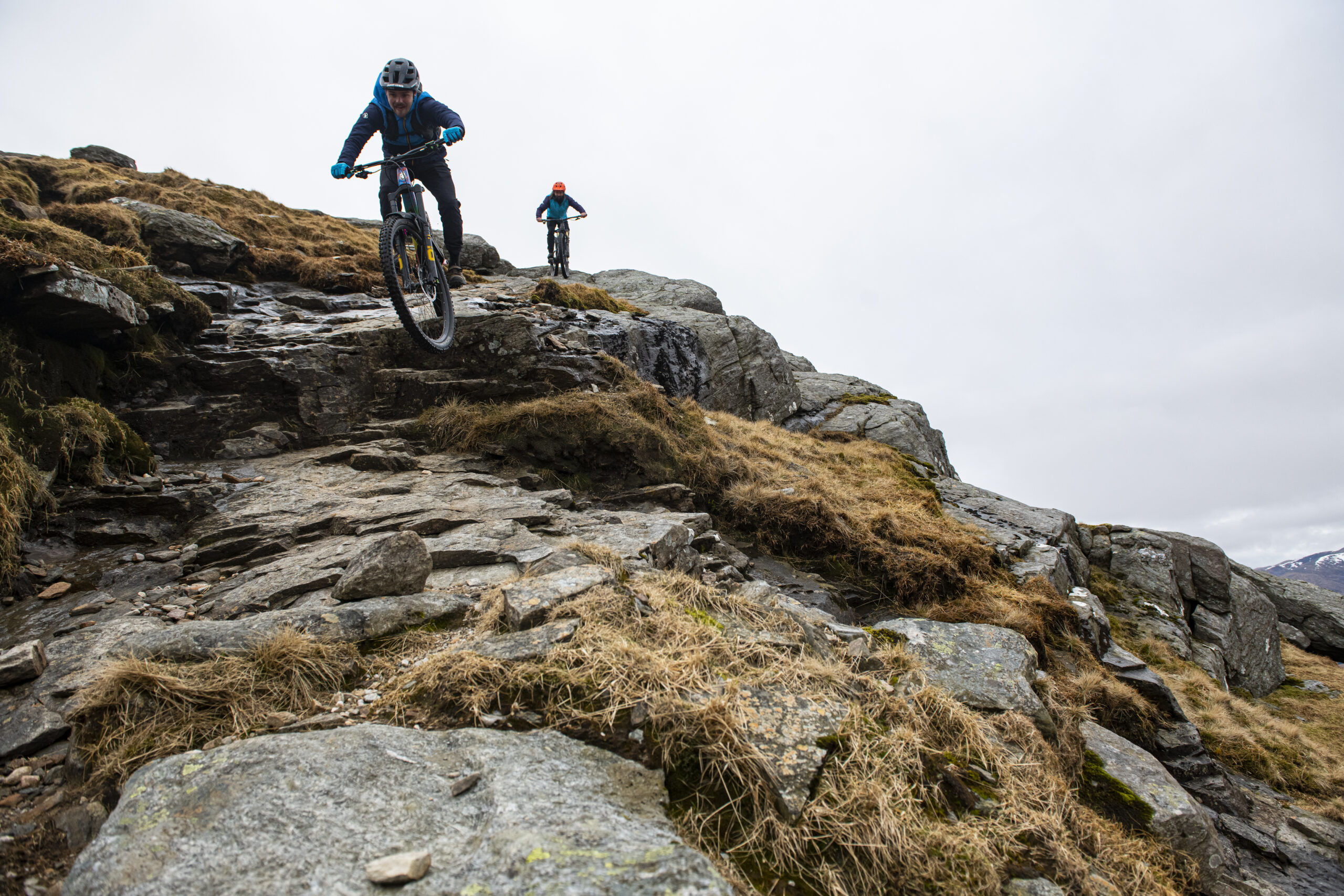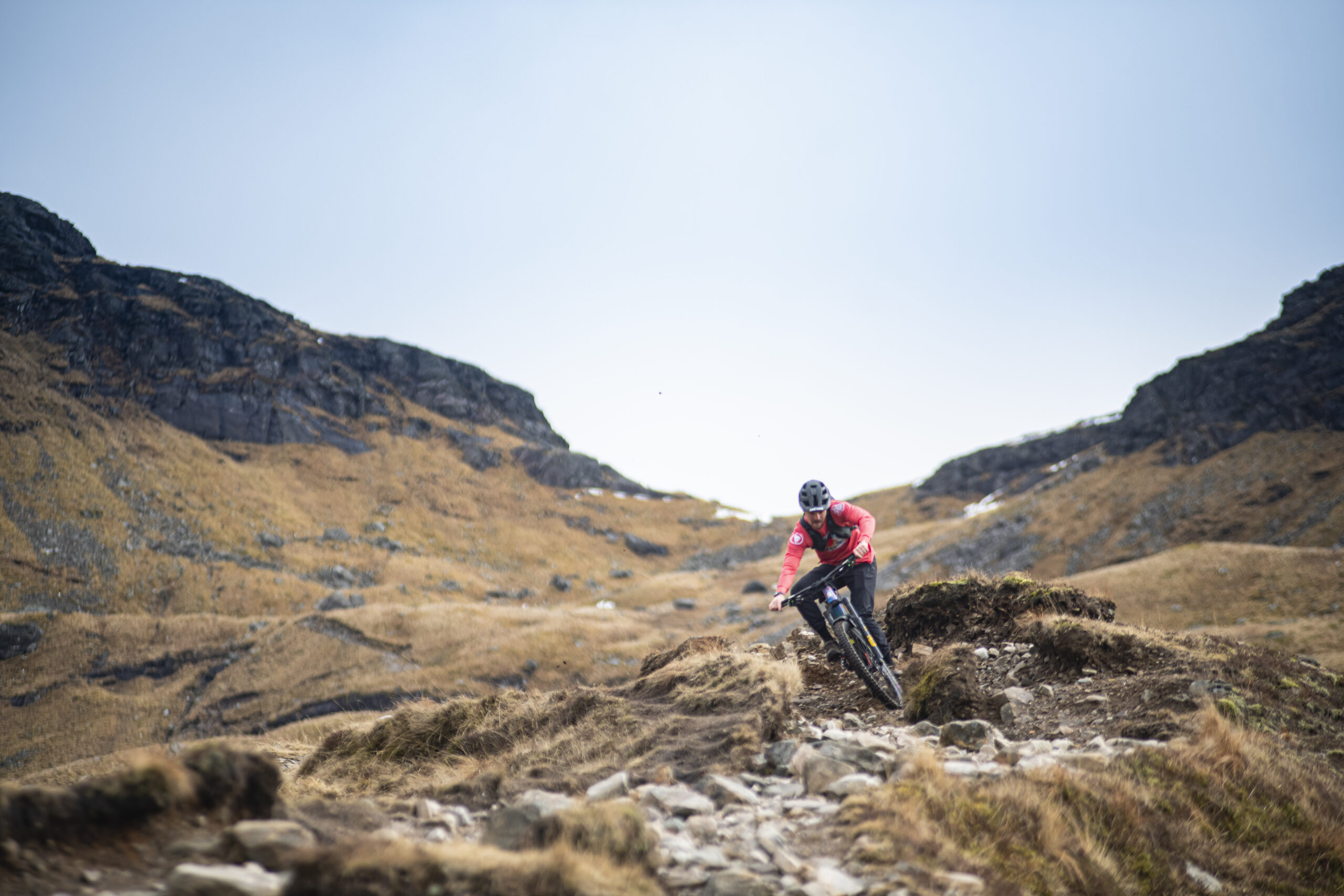 Moments of flat-out speed are interspersed with picking your way down things at a crawl before you’re afforded a breather, pop the saddle up and get ready to go again. It’s not long before we’re back at the lochans having ‘ridden’ the snow patches higher up. Regrouping before the slabs again, we look back and wonder at how much height we’ve just lost and how long it took to get there. This is the running theme of this descent.