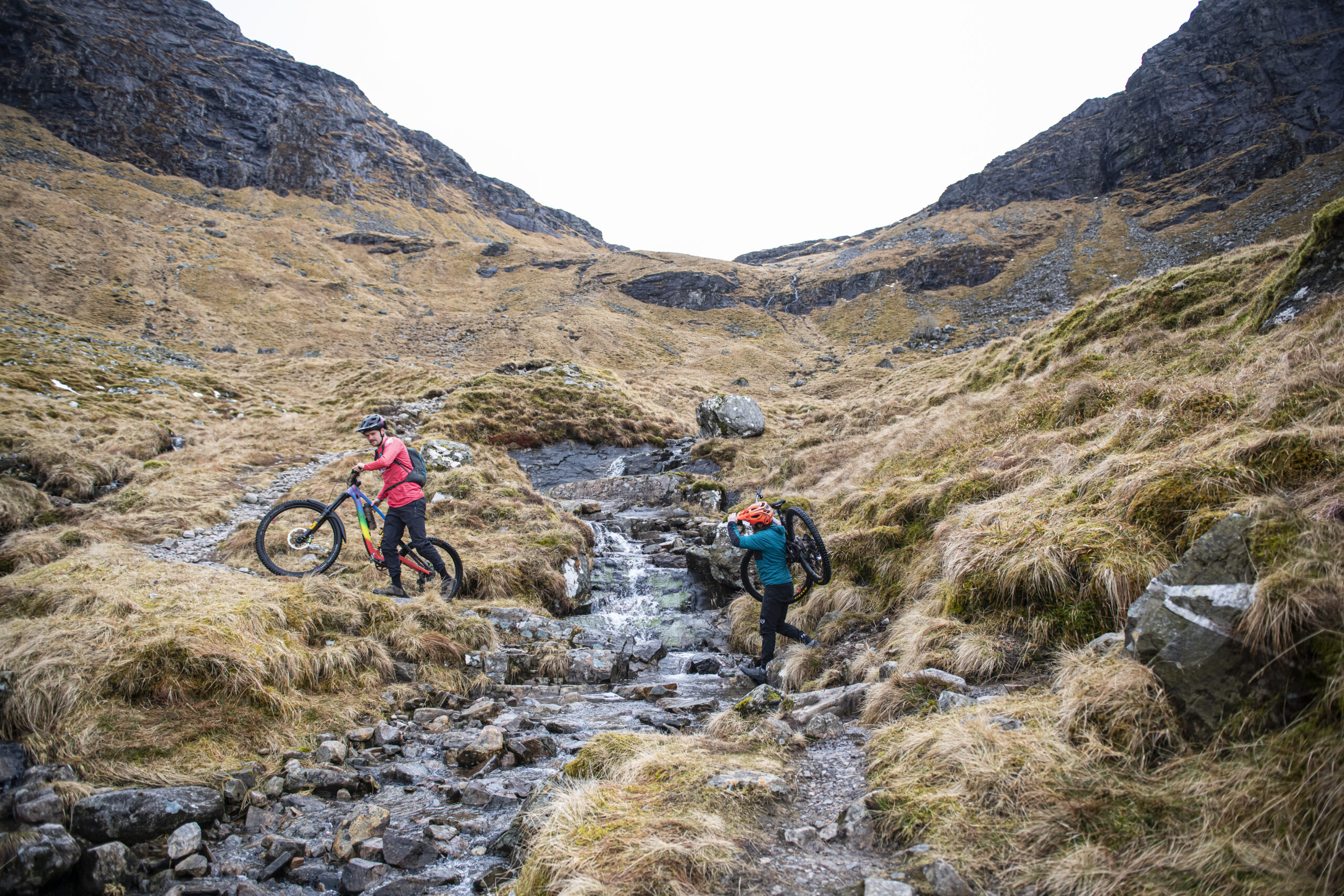 The slabs above the bealach are imposing both to look at and ride, and we both take the wrong line. A bit of pedalling about and we’re sort of on the right track again. Wheel-catcher rocks and jagged slab edges give me the fear and I’m happy to be beyond them. A quick glance to the skies to see if the eagles have returned before the mega tech of the scree below awaits. Joe makes this section look like a blue trail. I make it look like I haven’t ridden a bike before.