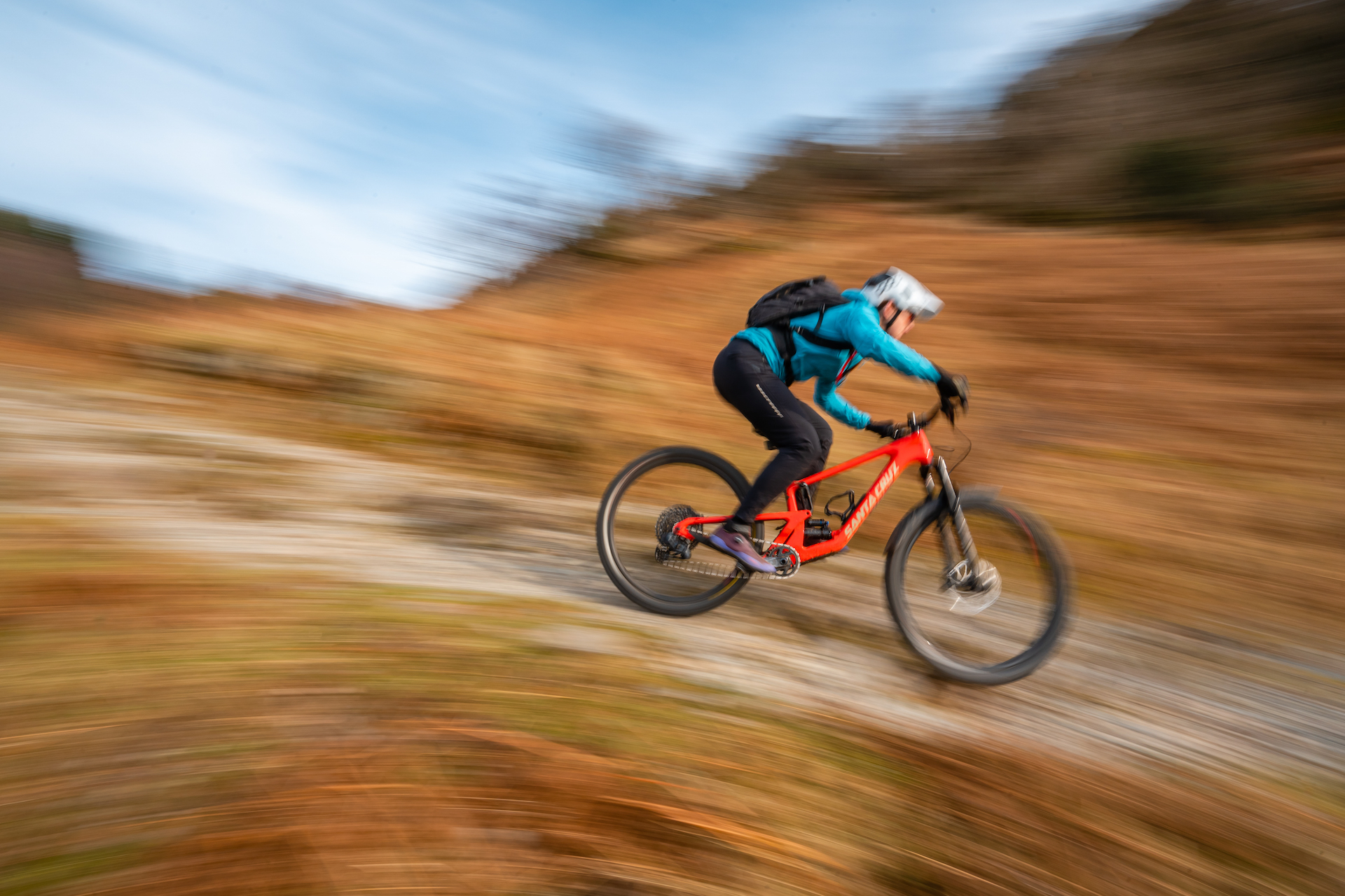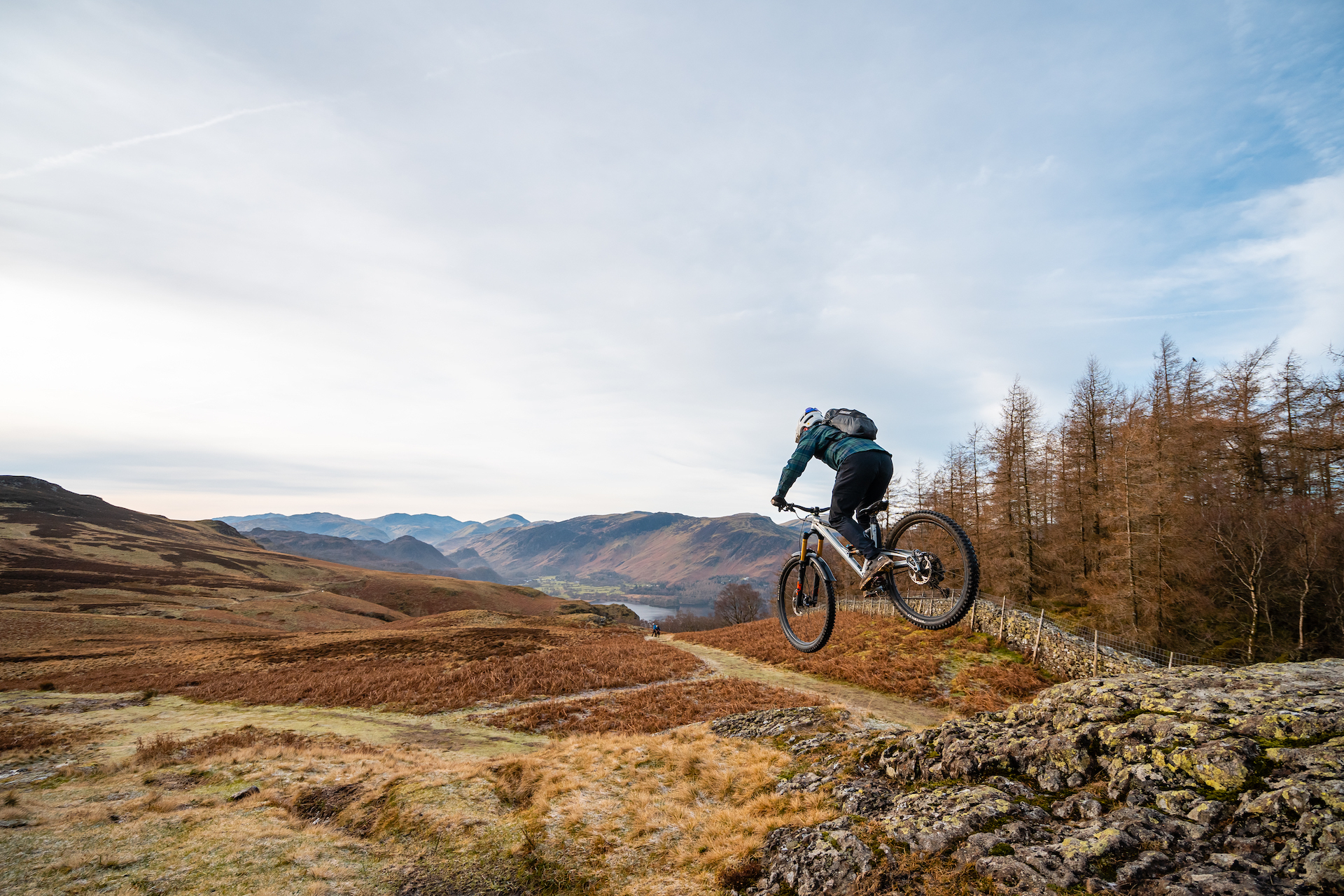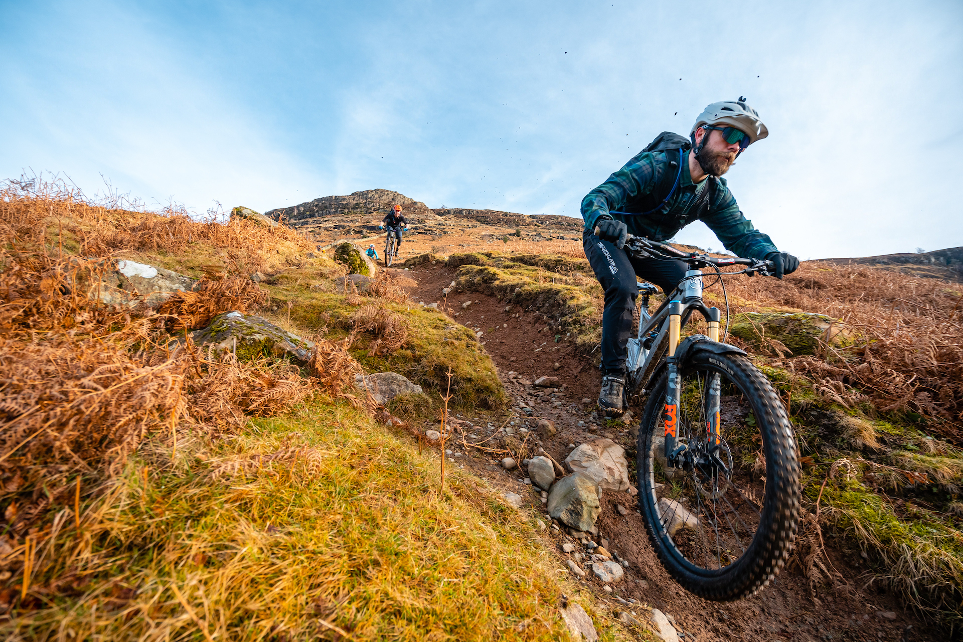 Yet another group of riders are snapping at our heels as we journey towards Castle Crag under the shadow of Rigghead Quarries. The Jaws of Borrowdale loom ominously ahead and Keswick peeks through the gap in the valley, all of a sudden looking much, much further away than before. It’s an iconic view, but we mustn’t let it distract us from the task at hand. The ground fades away, nothing too severe at first, and our speed increases. Imperceptibly, the well-groomed trail from earlier is gone and it’s as though the trail builders just gave up. Larger drops and holes appear between the previously carefully placed rocks. We think light, floaty thoughts, try not to touch the brakes and skim across the surface. It’s a real balancing act – brake too much and your poor tyres and rims will connect all too sharply with a perfectly placed square-edged rock. Brake too little and you’ll be carrying way more speed than is comfortable. Amazingly, we all escape scot-free, tyres and rims intact!