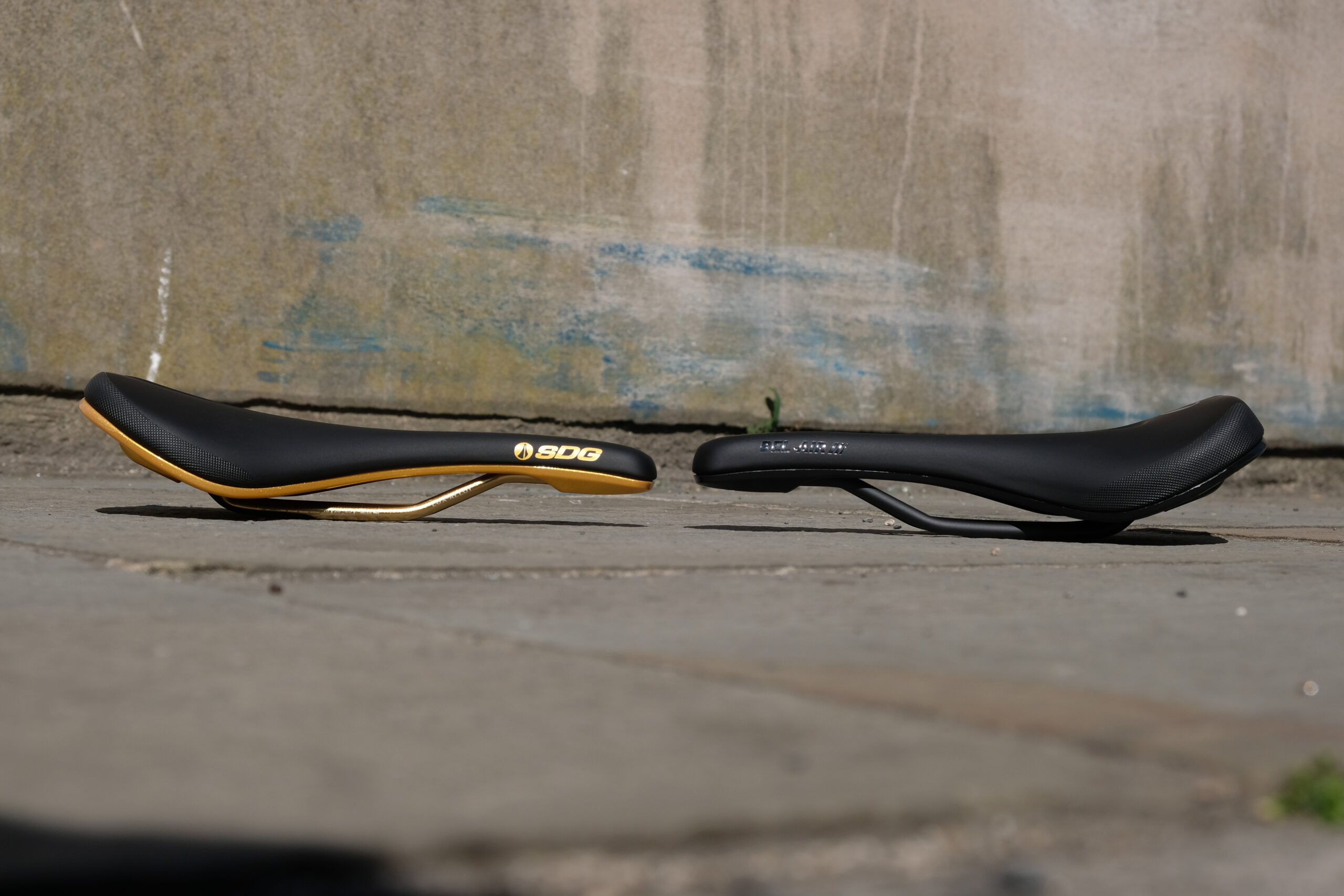 The totes black saddle is the Bel-Air V3 Max. SDG don’t want to call it an eMTB saddle but… it sort of is. Having said that, there a plenty of biobiking folk who like a raised tail saddle too. And decent amount of padding. And a wider saddle nose.