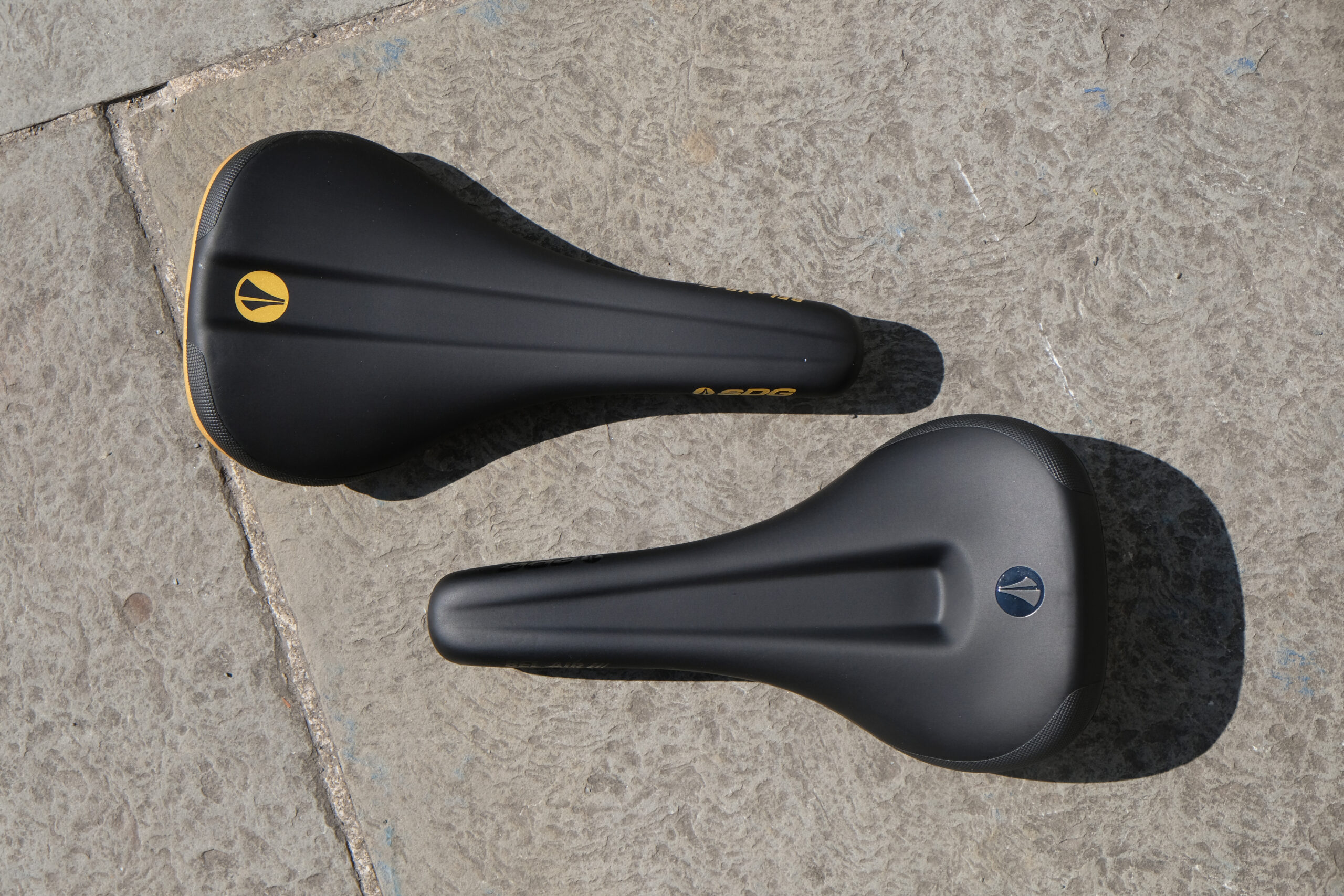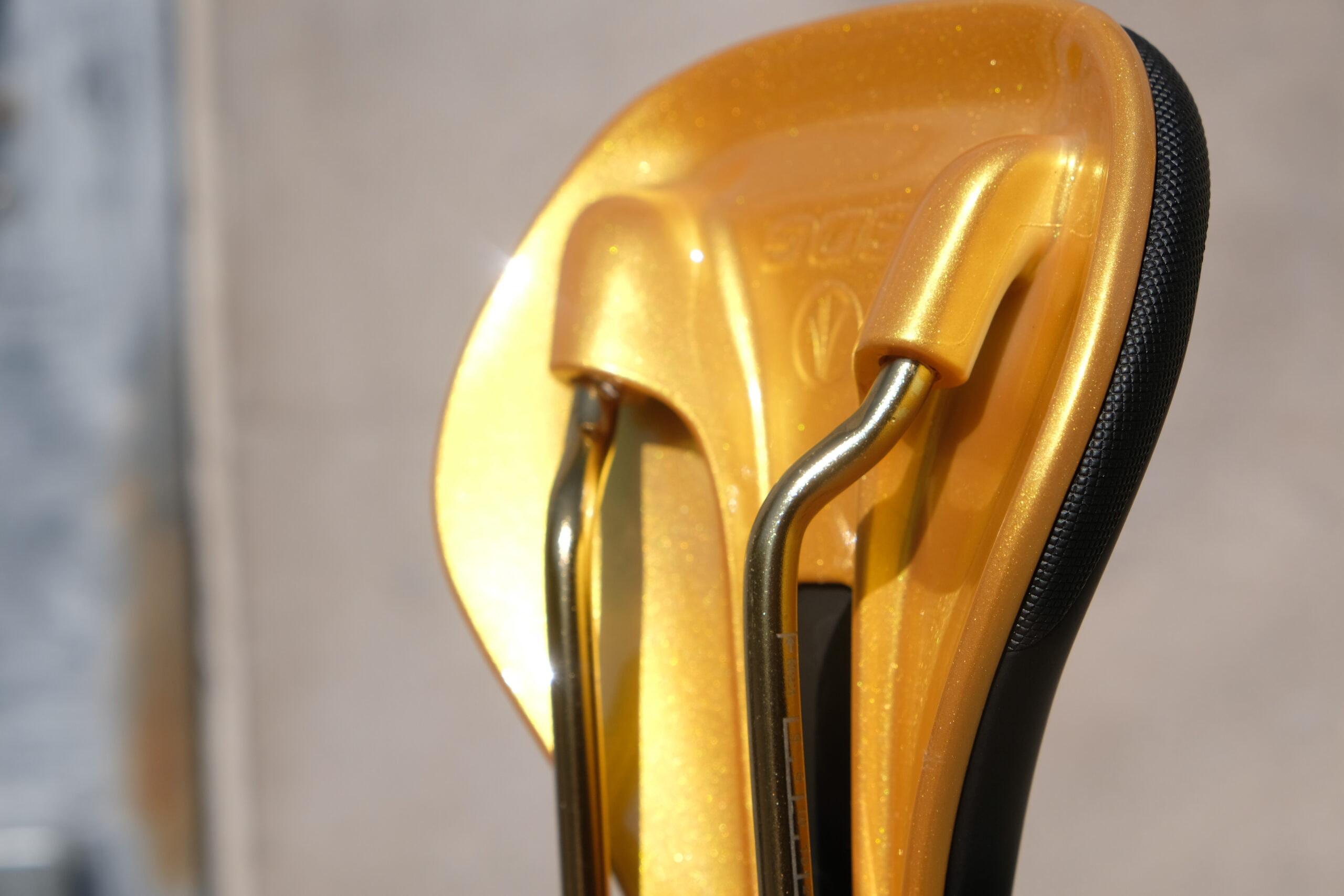 The black and gold (GOLD!) saddle is the modern classic Bel-Air V3 in Galactic flavour. The Bel-Air V3 features summink called “ATMOS Shaping”; a seamless vacuum sealed cover with sonic welded edges. What you can’t see on this saddle is the hidden undercut (a relief cut-out in the underside).