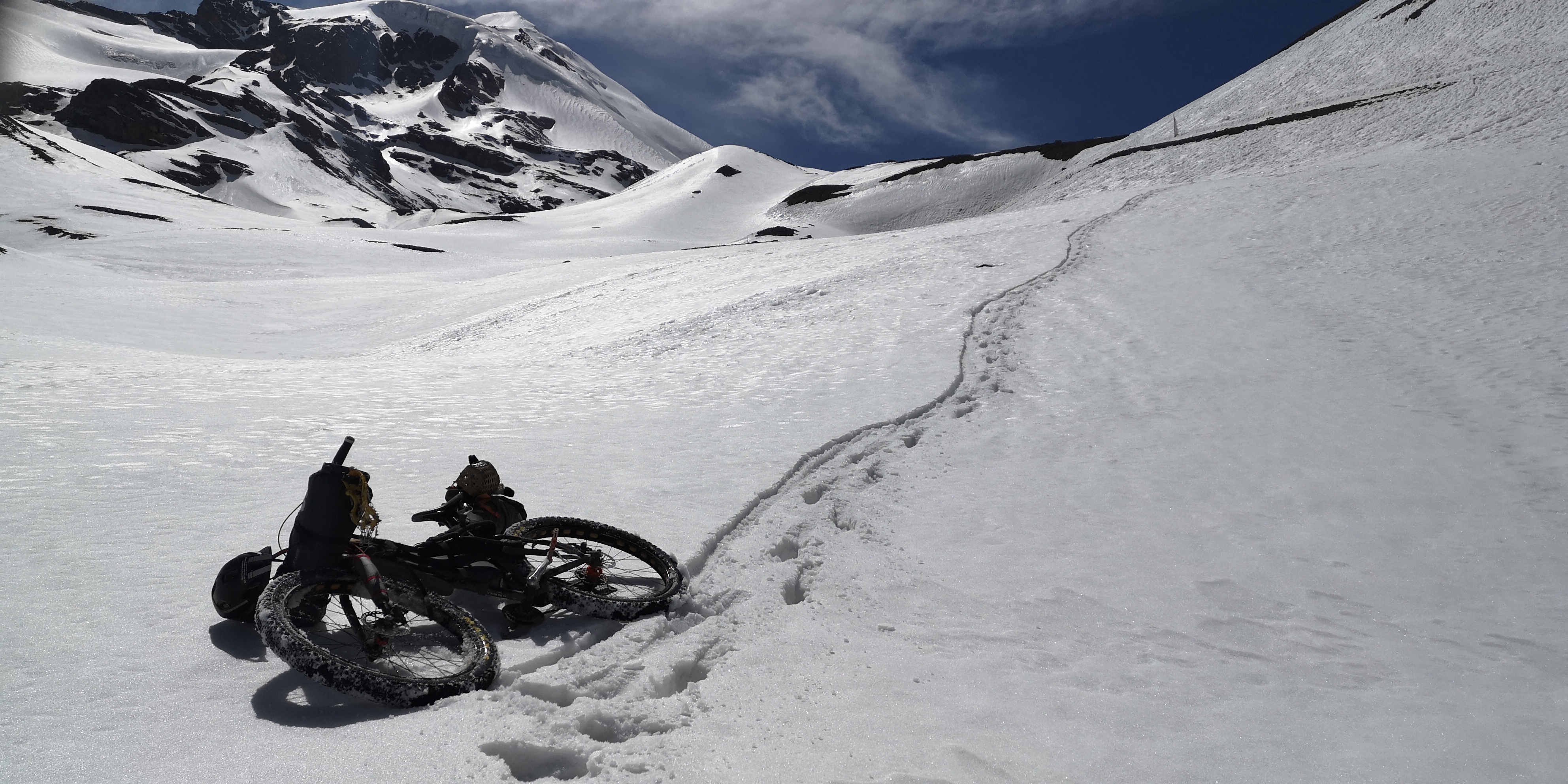 On the day of ascending the pass I start at 3.30am in Muktinath. In the pitch black the world has shrunk to the reaches of my head torch. An hour after dawn I arrive at the foot of the pass, where the snow starts. I have tried to carry my bike on my back, but it proves rather uncomfortable, so from here it’s dragging and pushing the Surly for the next 10km. Somehow this seems much more exhausting than on my training rides at home.