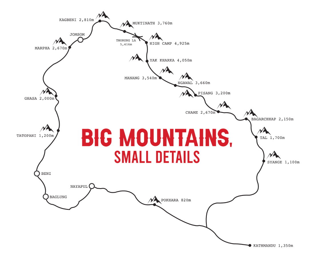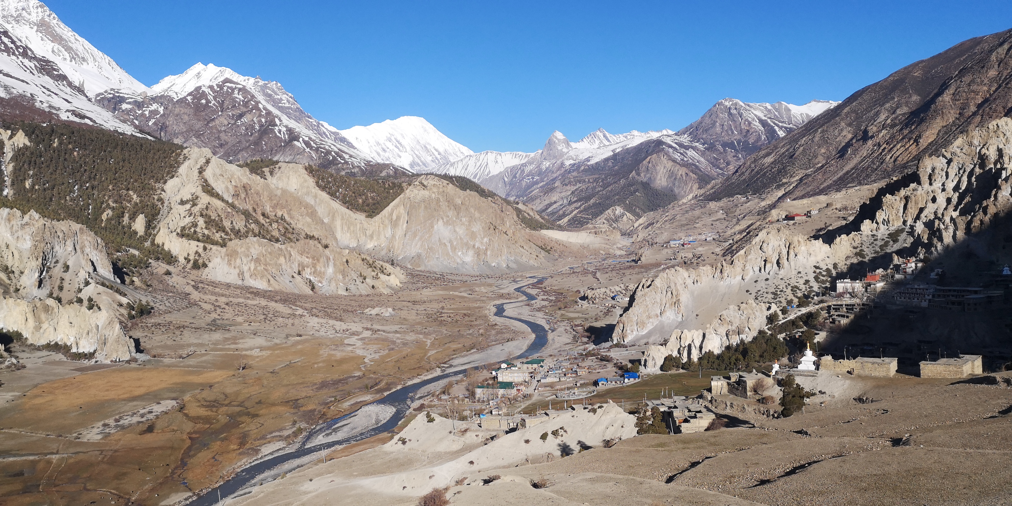 Most people walk the circuit anticlockwise, starting in the more remote Marsyangdi valley, crossing the pass and finishing in the Kali Gandaki valley. Going in that direction requires 400m less climbing when crossing the Thorong La pass and helps to adapt better to the altitude having a longer, more gradual climb to the top of the pass. Knowing the pass well, I chose to go in the other direction, starting in Pokhara and finishing at the trailhead of Besisahar, a descent over four days down the beautiful Manang valley. Travelling in April, daytime temperatures ranged from a balmy 25°C at the beginning of the journey to a chilly -5°C when crossing the pass.