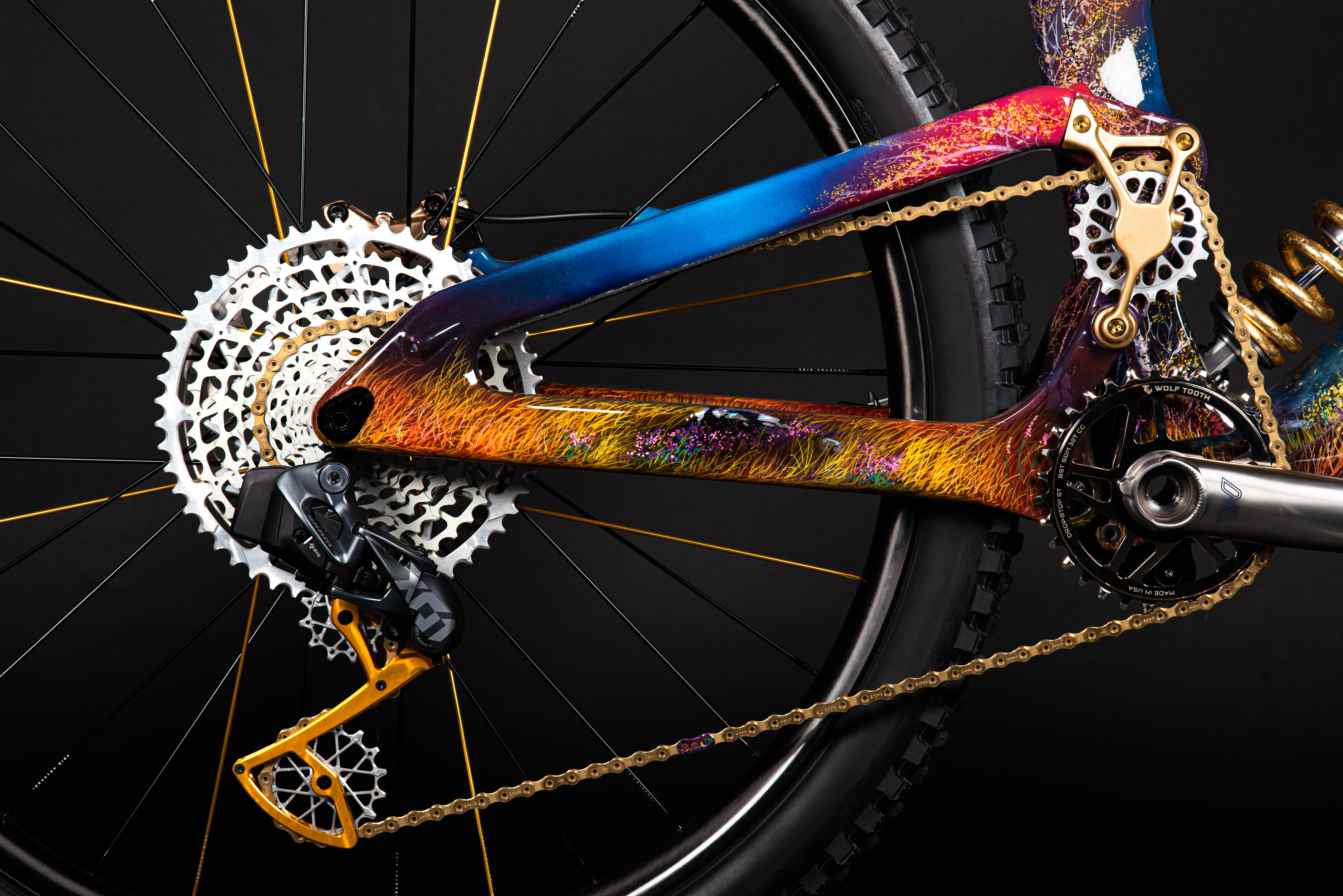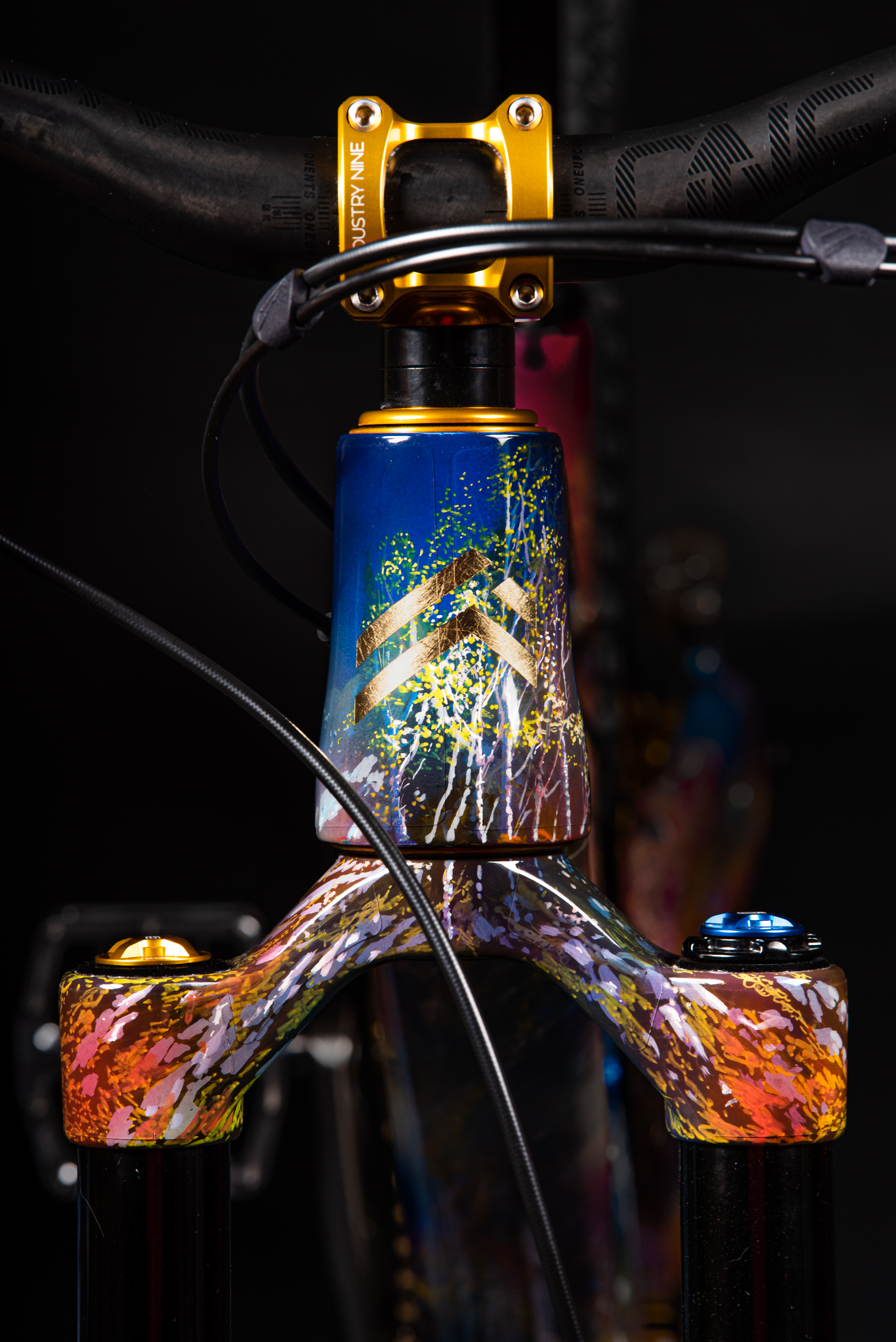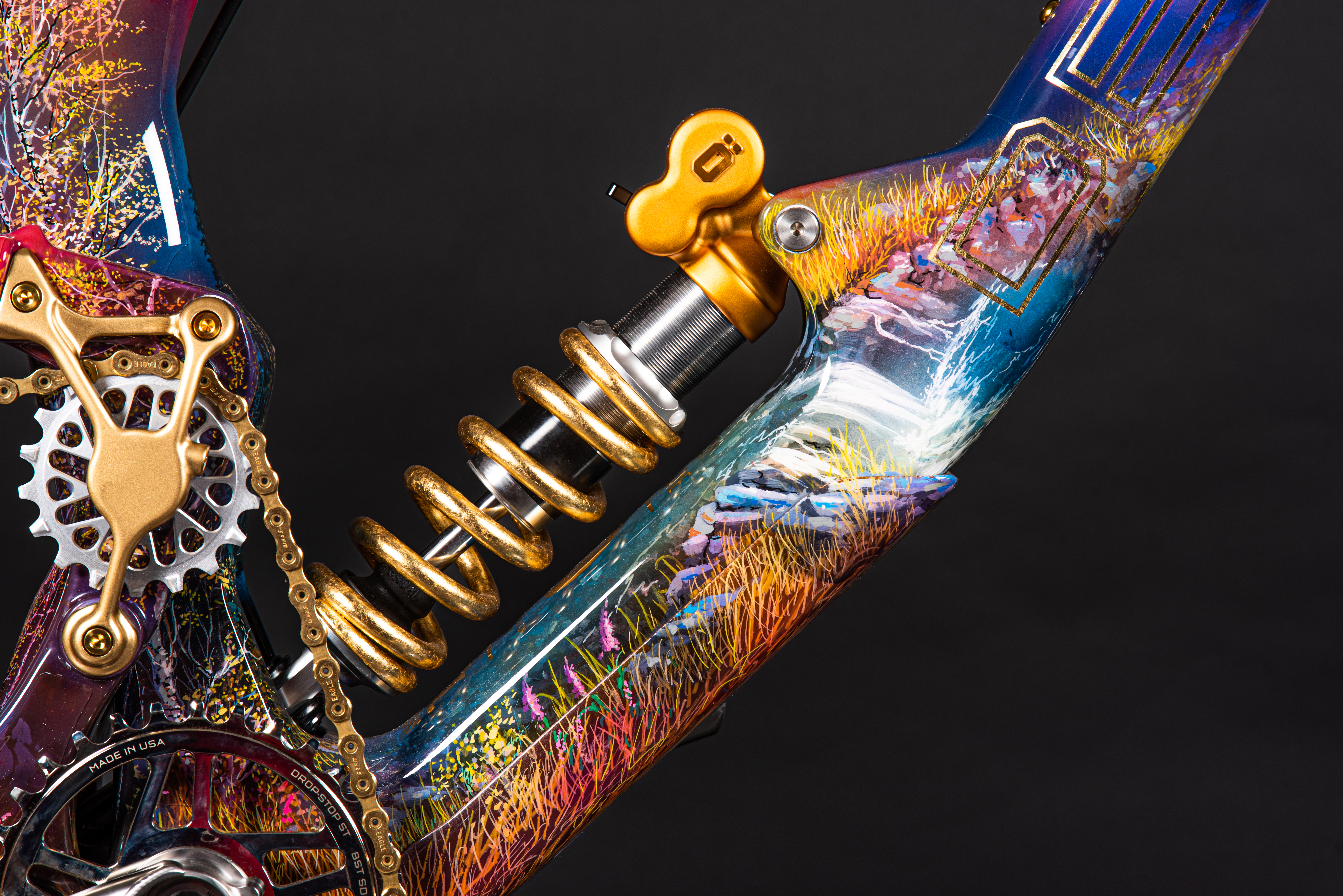 This is our latest project showcasing our hand-painted Claymore frame by Scottish artist Douglas Roulston. The piece represents the humble beginnings of Deviate cycles as it depicts numerous features of the Cairngorms where Deviate was conceived. Namely, the Green Loch and the Caledonian forests to name a few. As well as being a completely bespoke hand painted frame with a story behind it boasting gold leaf decals on the frame and fork, with a gold leaf spring too. The build itself is equally as special, we aimed to get the best of the best in the component department whilst still allowing it to work well with the frame design. “To ride or not to ride?” We feel like this would be a good talking point for the mountain bike community.