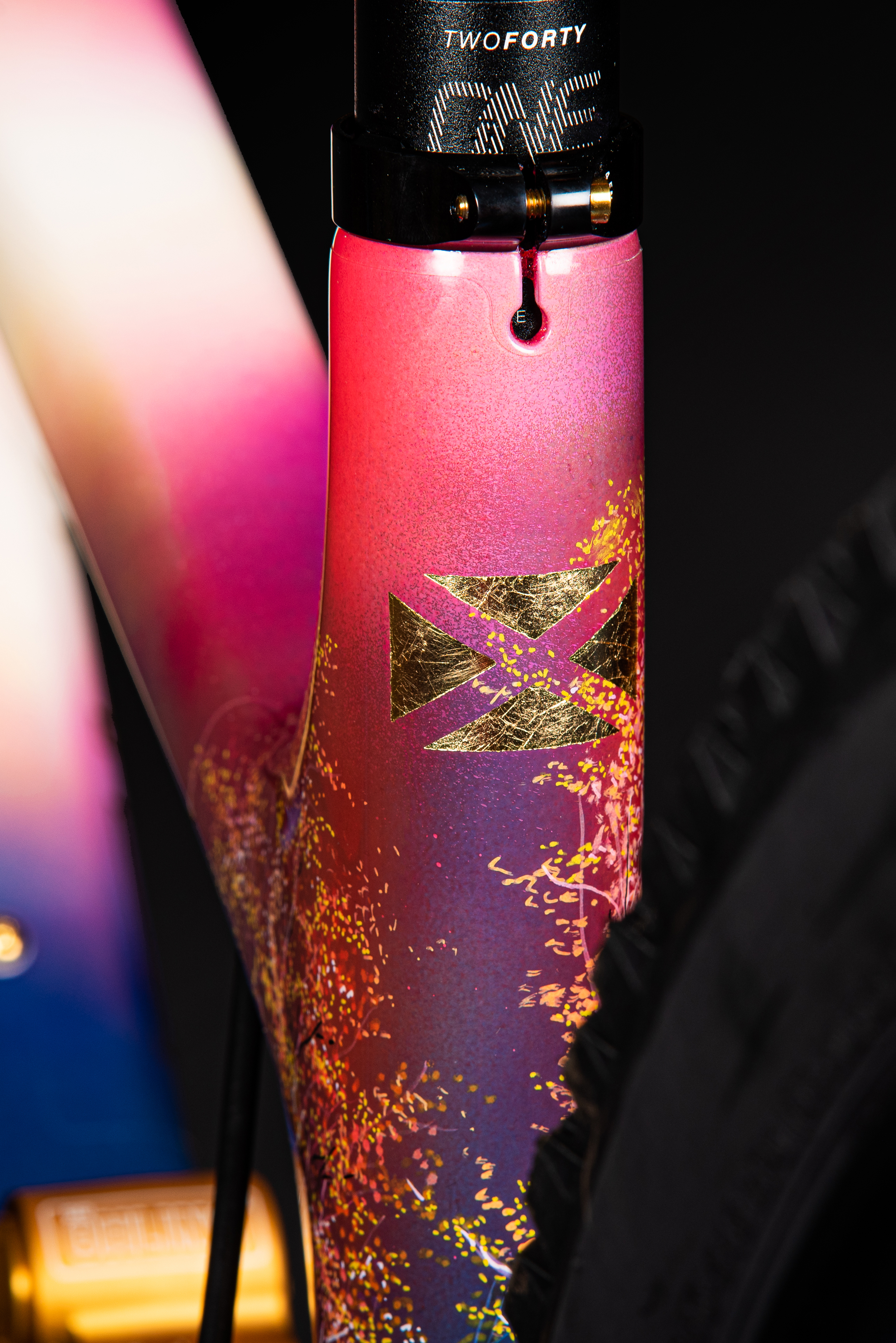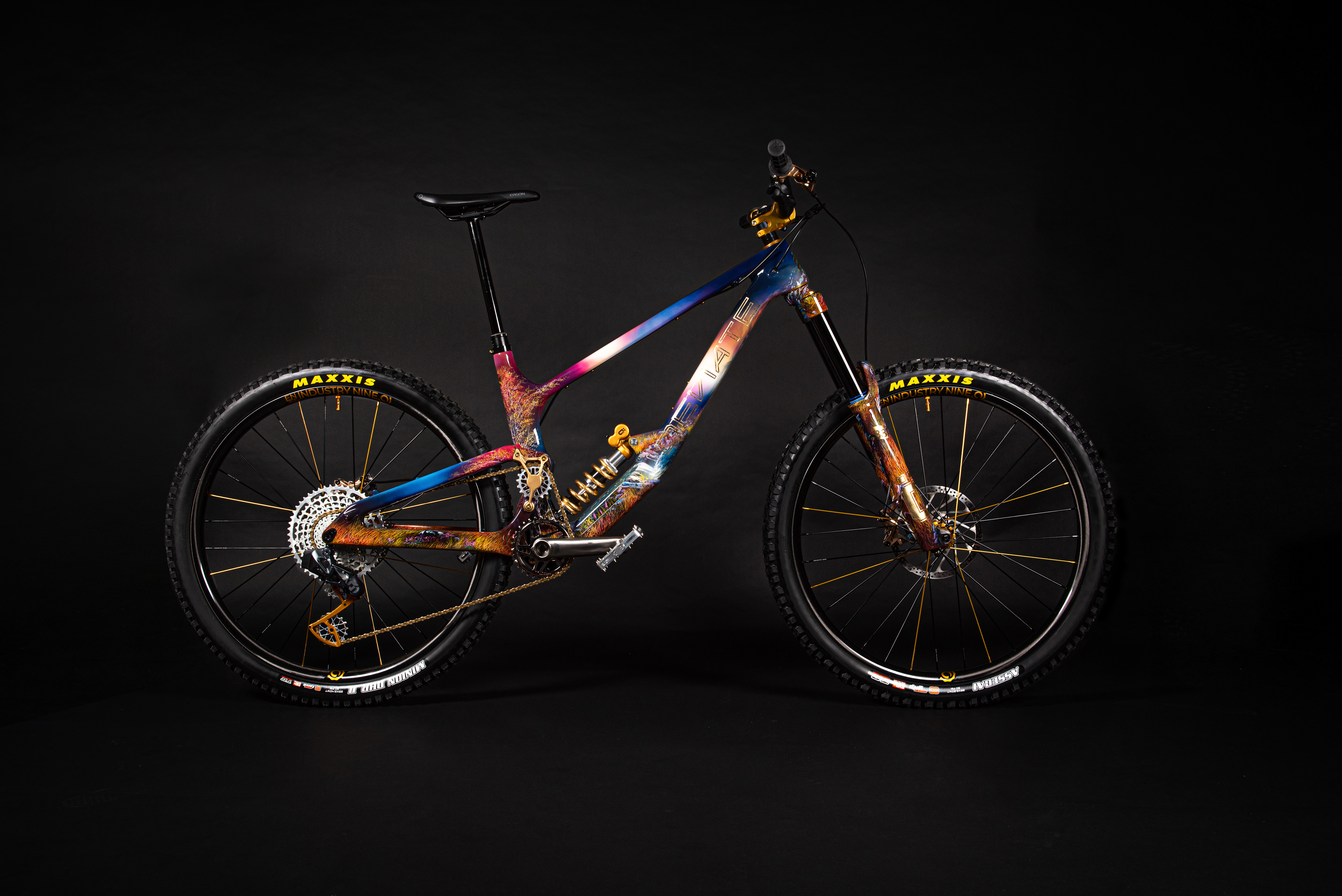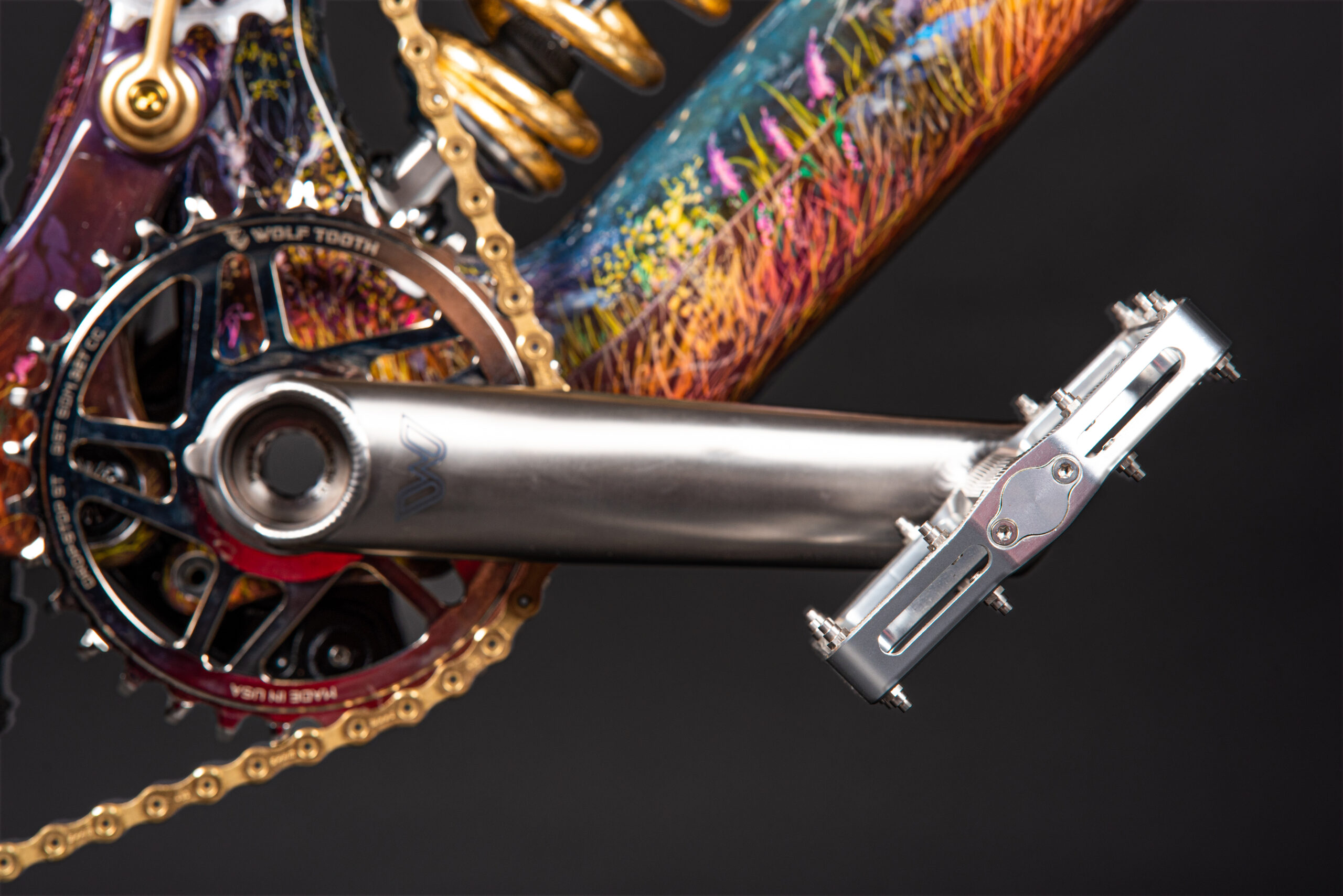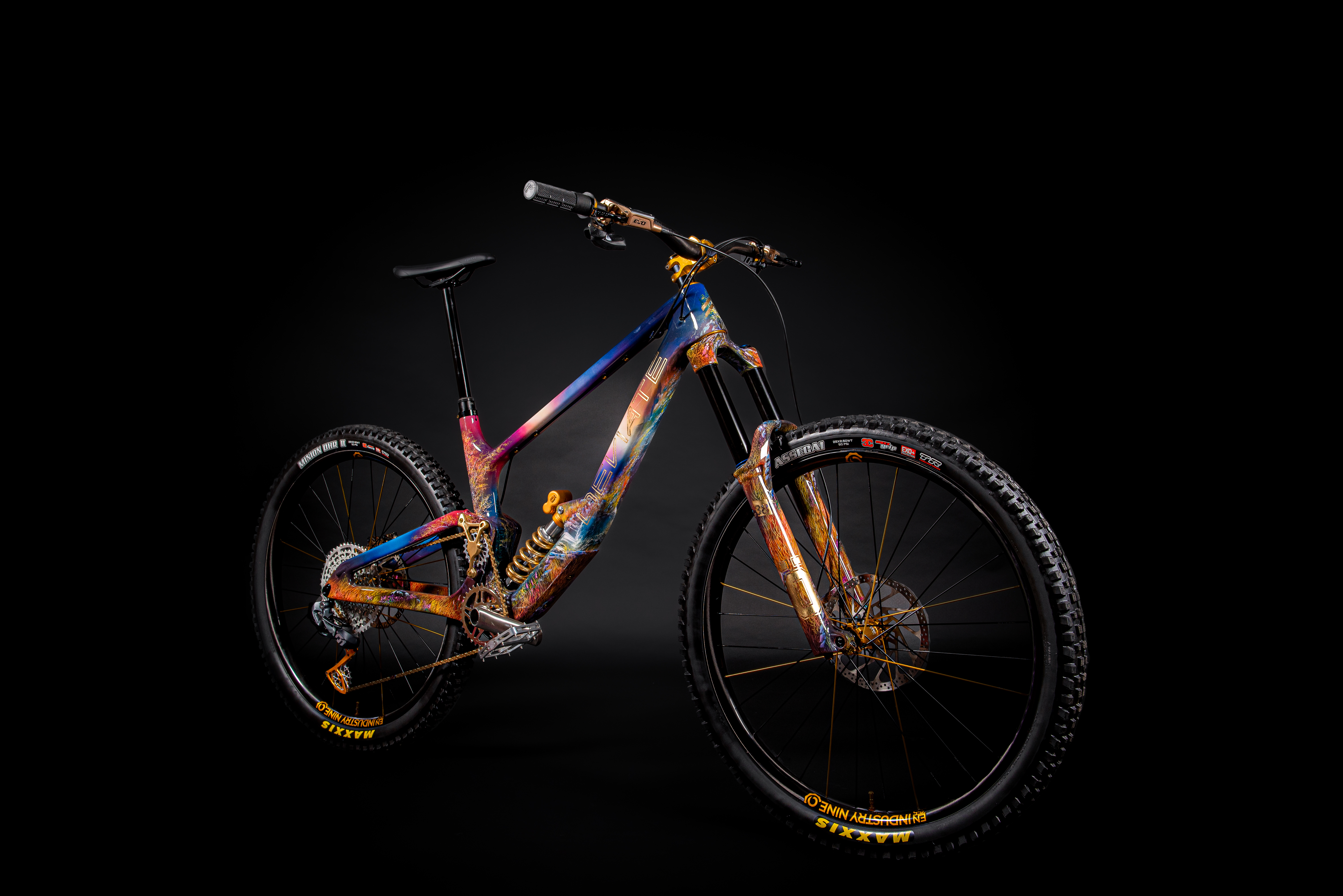 This is our latest project showcasing our hand-painted Claymore frame by Scottish artist Douglas Roulston. The piece represents the humble beginnings of Deviate cycles as it depicts numerous features of the Cairngorms where Deviate was conceived. Namely, the Green Loch and the Caledonian forests to name a few. As well as being a completely bespoke hand painted frame with a story behind it boasting gold leaf decals on the frame and fork, with a gold leaf spring too. The build itself is equally as special, we aimed to get the best of the best in the component department whilst still allowing it to work well with the frame design. “To ride or not to ride?” We feel like this would be a good talking point for the mountain bike community.