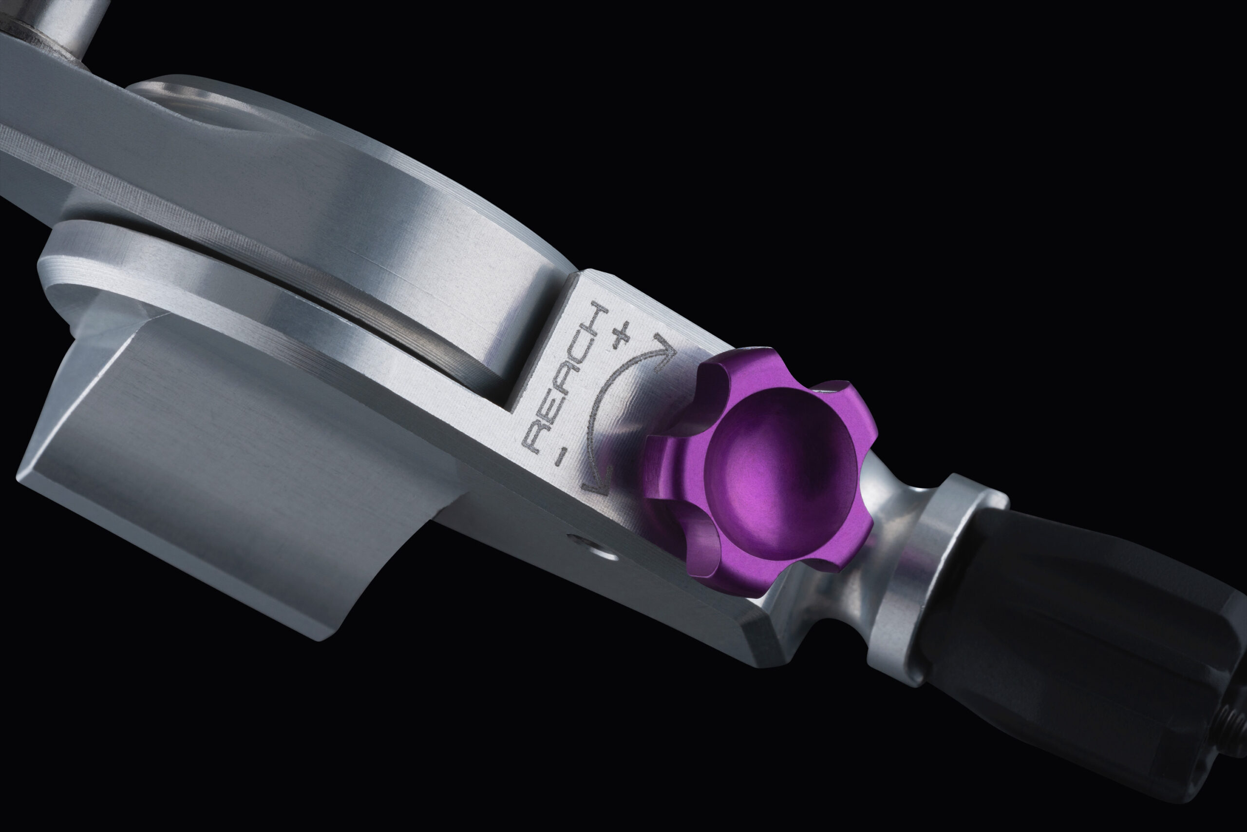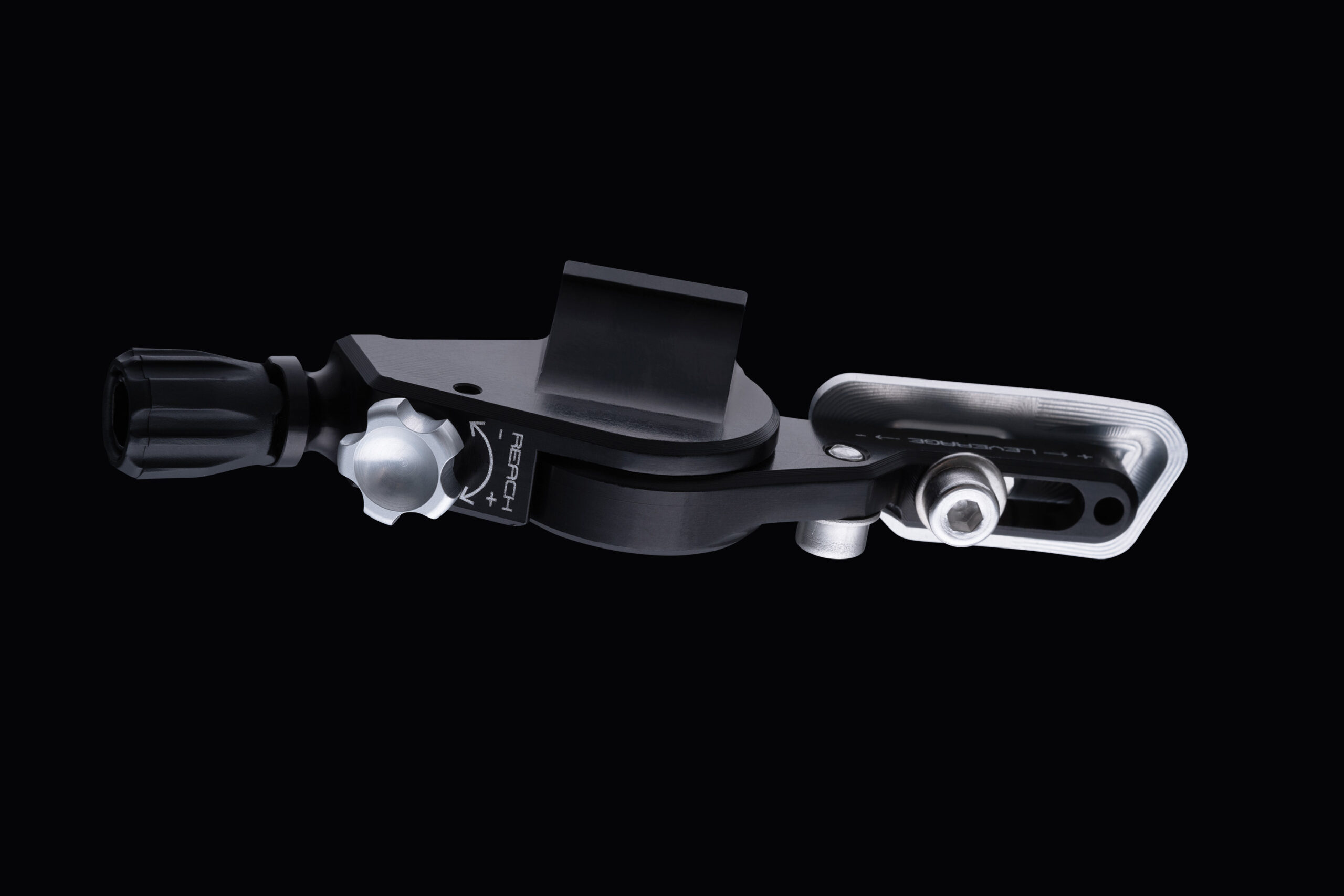 The lever rotates on ball bearing for super smooth and precise action with minimal unwanted movement, and features adjustable leverage with a 20% range of adjustment: Increasing leverage provides a lighter lever action and more lever travel, decreasing leverage provides a quicker action with less lever travel. Combined with adjustable reach and fore/aft and lateral position adjustment it makes it easy to get the ergonomics set-up for your preference.