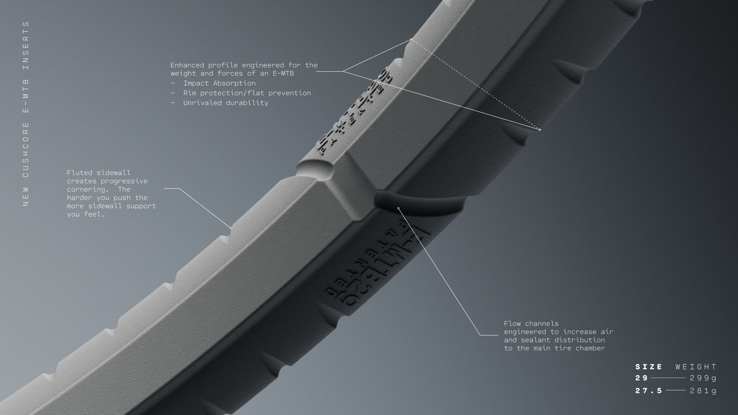 “The E-MTB also incorporates the same new fluted sidewall design found on our recently released TRAIL insert. This provides progressive sidewall support: the harder you push, the more support you feel.” – Austin Sandford, CushCore Engineer