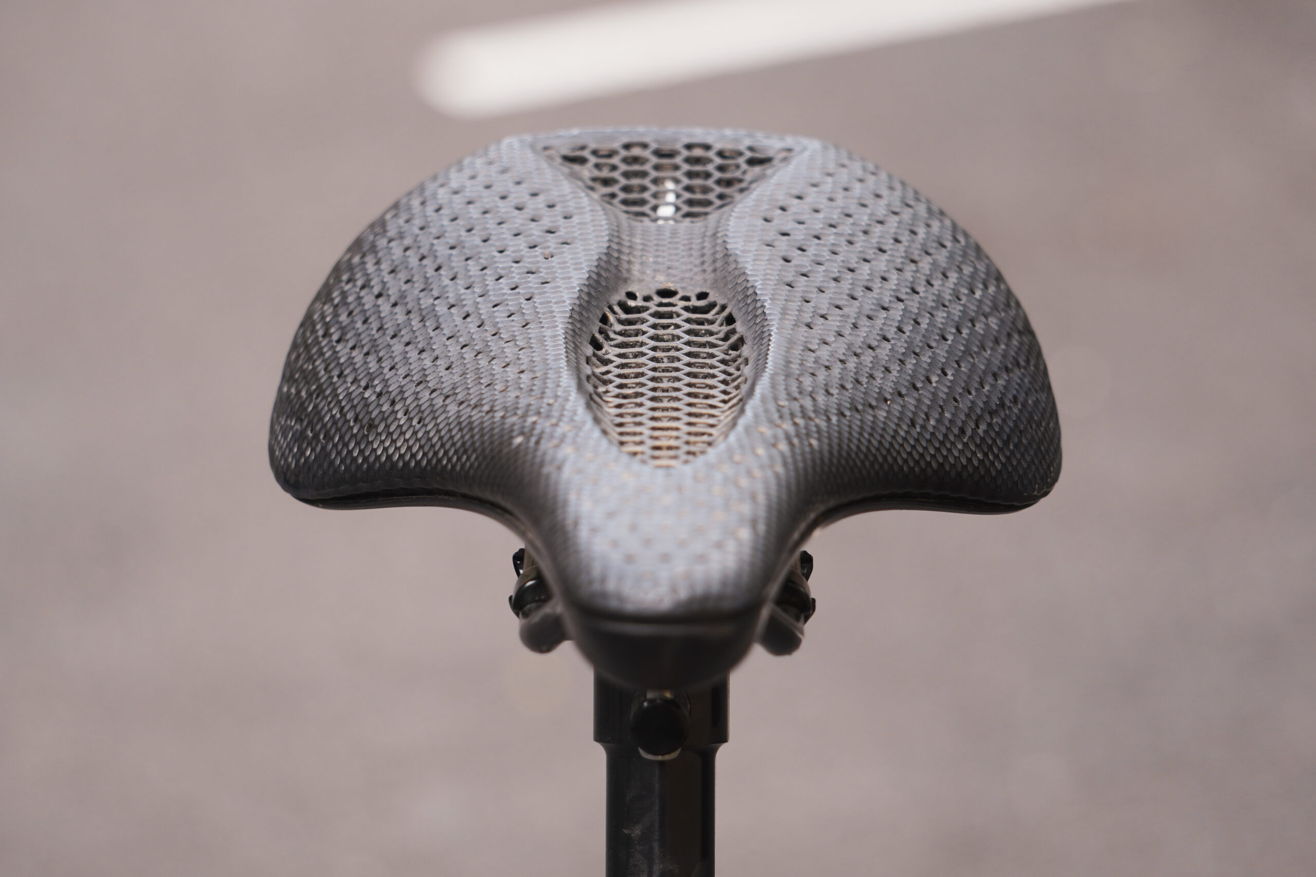 The Specialized Power Pro Mirror is a 3D printed saddle made from liquid polymer. It has titanium rails, a reclaimed carbon fibre base and is available in two sizes, 143mm and 155mm, to suit varying sit bones.
