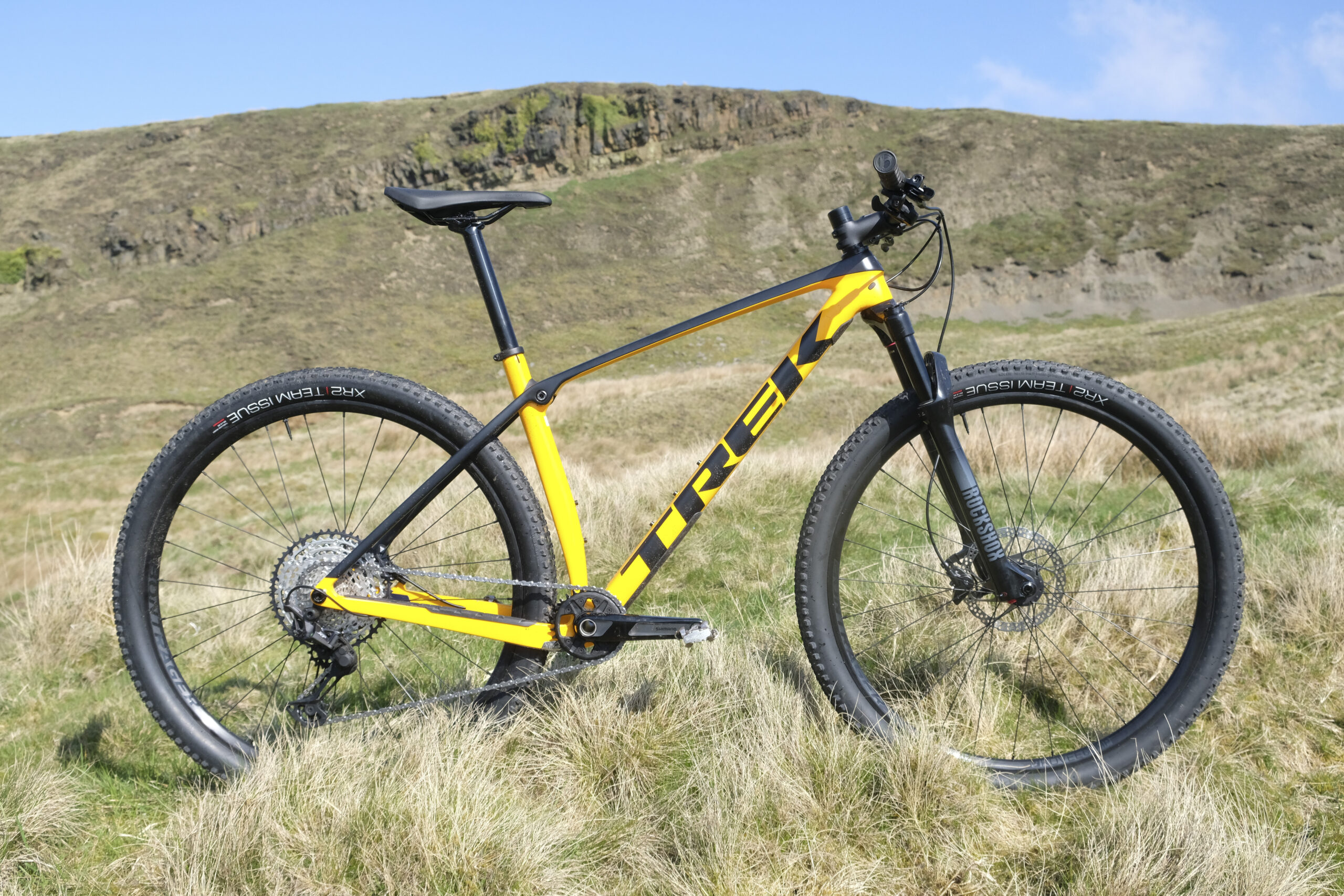 The frame is made from Trek’s OCLV Mountain grade of carbon and, quite frankly, it looks really rad. The waspish black and yellow colourway is particularly pleasing. The aesthetic helps offset the relatively unexciting build kit. The own-brand finishing kit, mid-tier Shimano stuff and fairly nondescript RockShox Recon fork are all fine but hardly set the pulse racing.