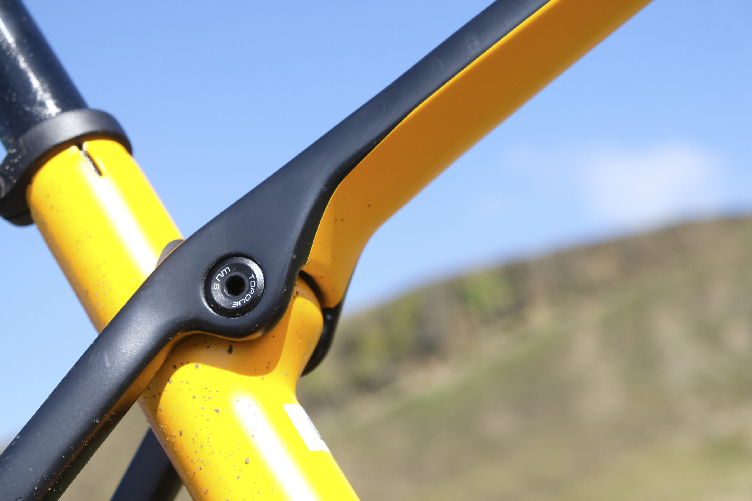 Whereas those older designs typically had some sort of spring placed inside a wishbone seat stay arrangement, the Trek Procaliber has a fixing placed just in front of the seat tube and below the top tube and a wedge of elastomery material in the join. I’ll get into how it feels on the trail shortly.