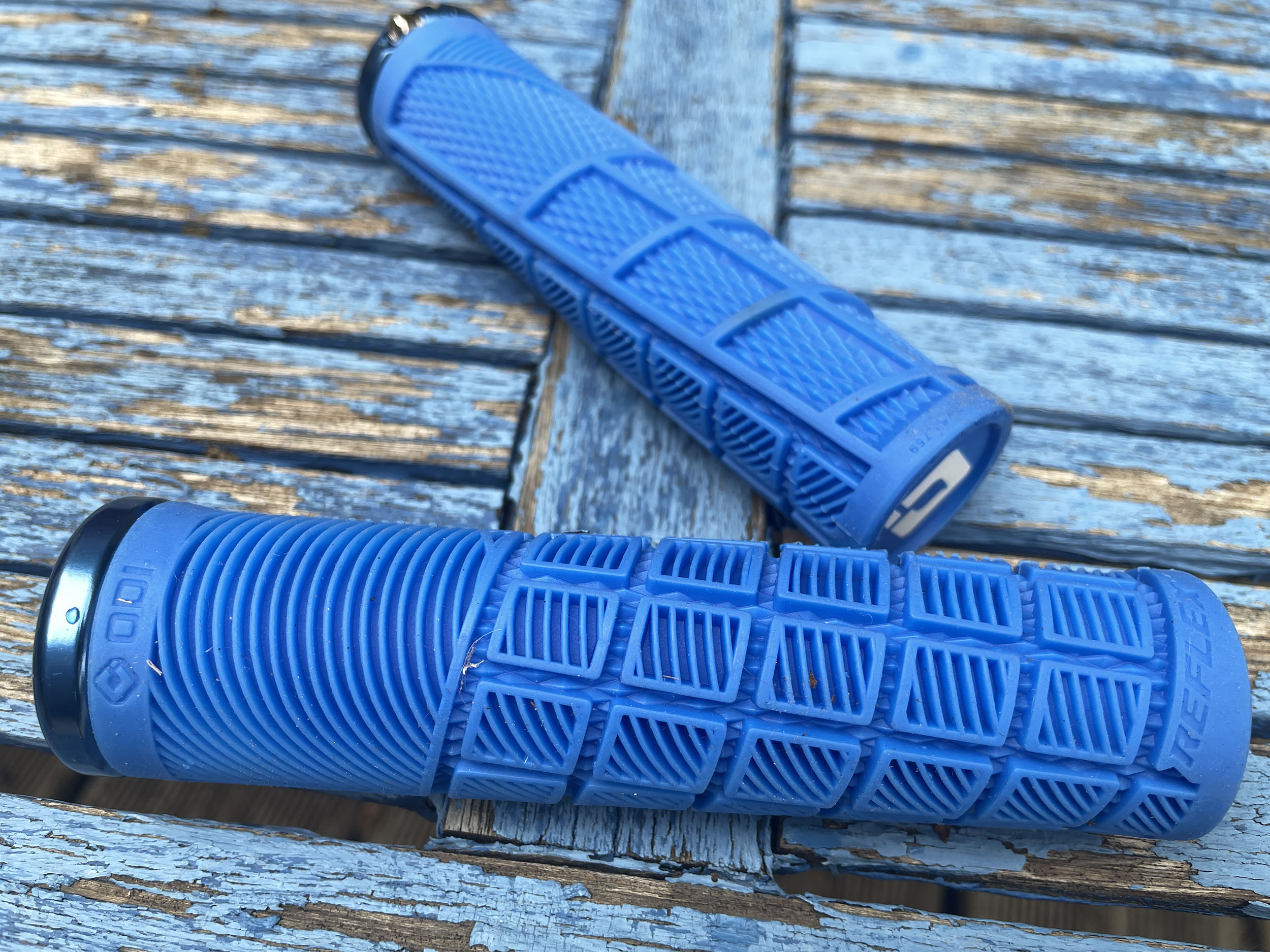 The ODI Reflex grips are a kind of ‘best of’ ODI’s grip designs, with different grip zones doing different things. The boxed-in ribs help cushion the palm for reduced arm pump, while the file tread and ribs of the underside are good for finger grippin’. The ODI Reflex grips are single lock-ons and, as Benji will be delighted to hear, you can even knock the ends out to run bar end mounted brush guards…