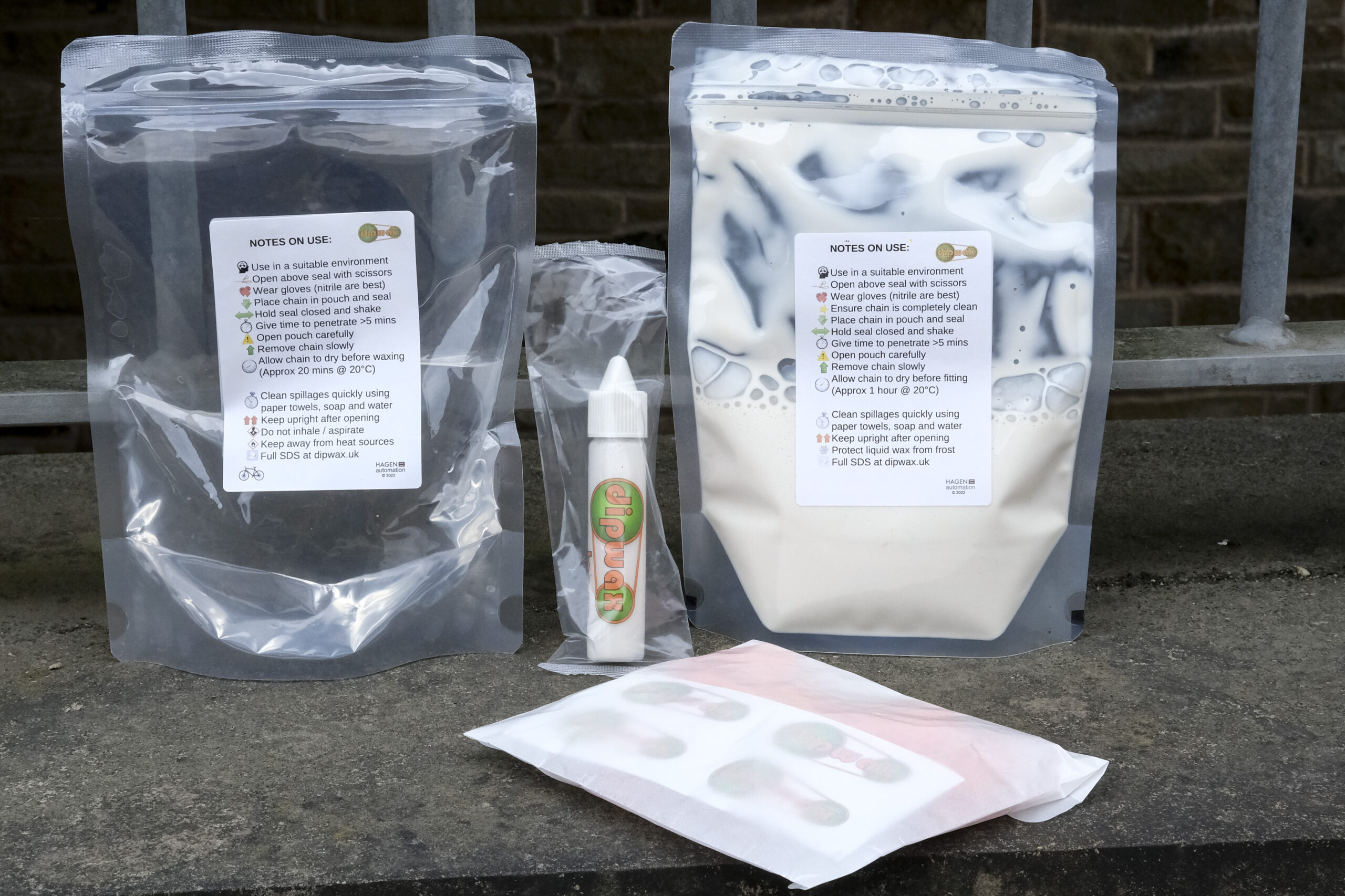 Dipwash cleaner is a specifically low-volatile solvent with “massive cleaning power” yet dries to a zero residue finish. Dipwax is water based wax lubricant using carnauba wax and friction reducers. It dries to a “durable, clean, dry coating. No mess, no fuss, no clag buildup.” The dipwax system kit comes with: dipwash cleaner 250ml pouch, dipwax chain lube 250ml pouch, dipwax 20ml top up lube, nitrile gloves and… stickers! Yesssss.