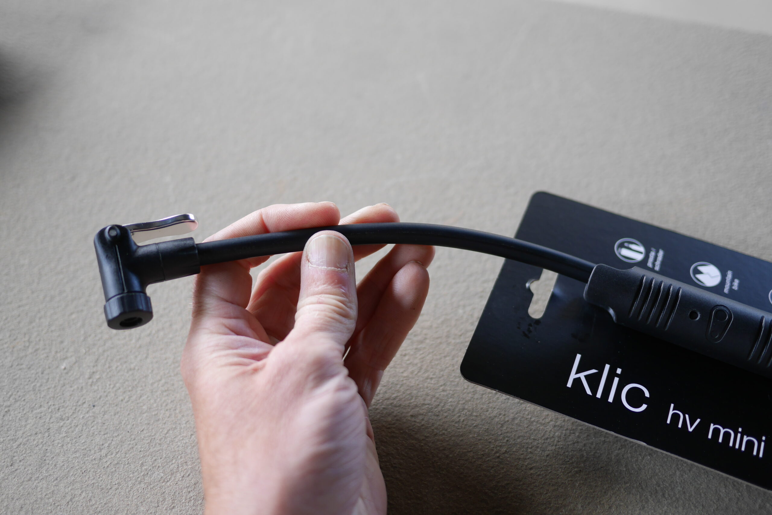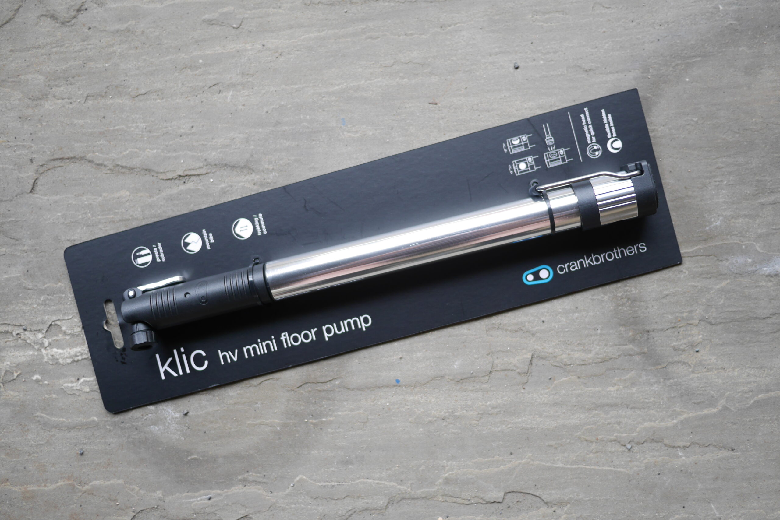 A maxi mini pump anyone? We’re big fans of portable pumps that have hoses. They just work betterer and don;t knacker valves. This a new backpack-able pump from Crankbrothers. 325mm in length (which I think is 13in in old money). Rated to 110psi (which I think is 7.6 bar in Euros). Magnetic ‘quick-connect’ hose which is nicely flexible and stows away when not in use. Fold-out ‘klic stand’ foothold with rubbery base. I like the base.