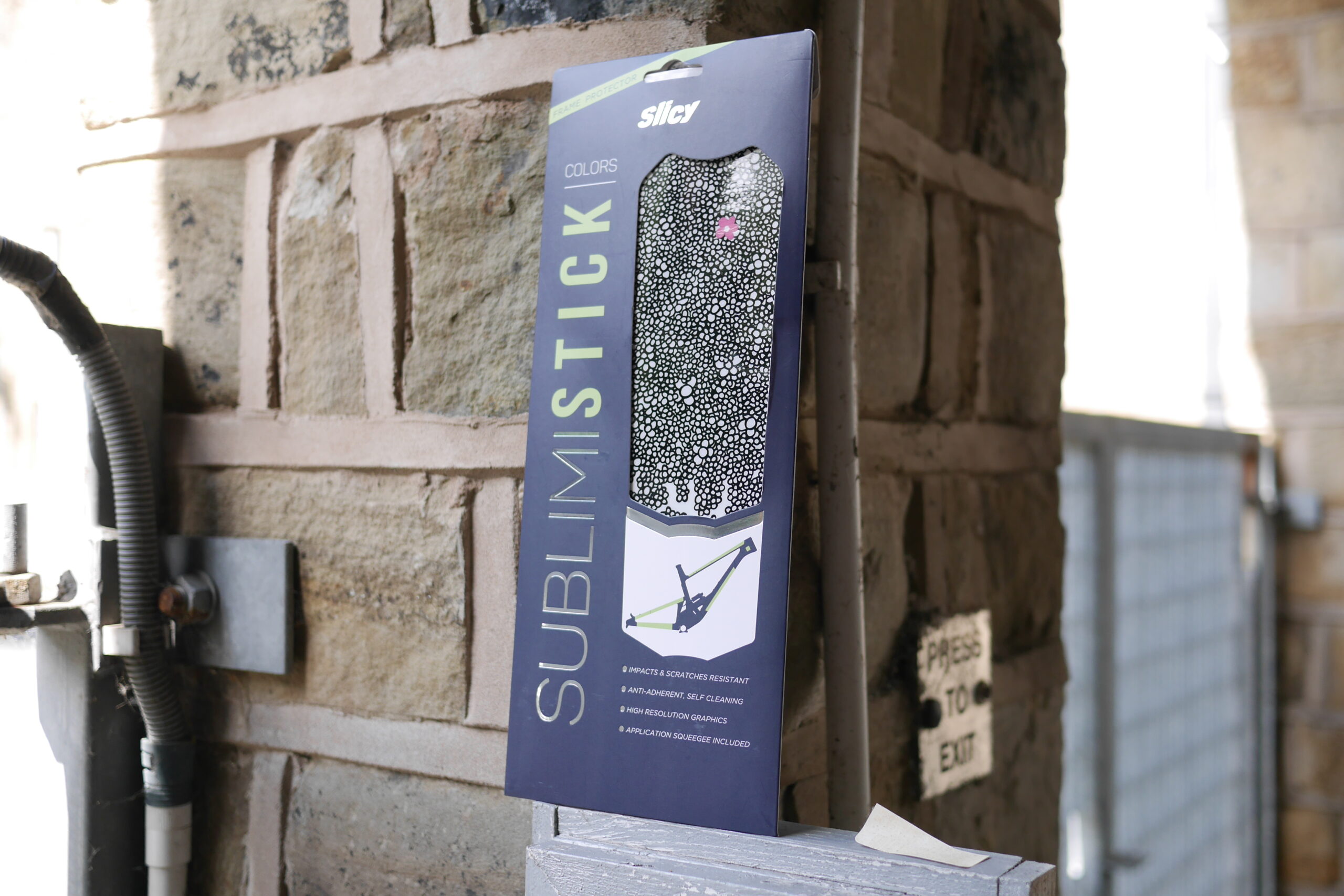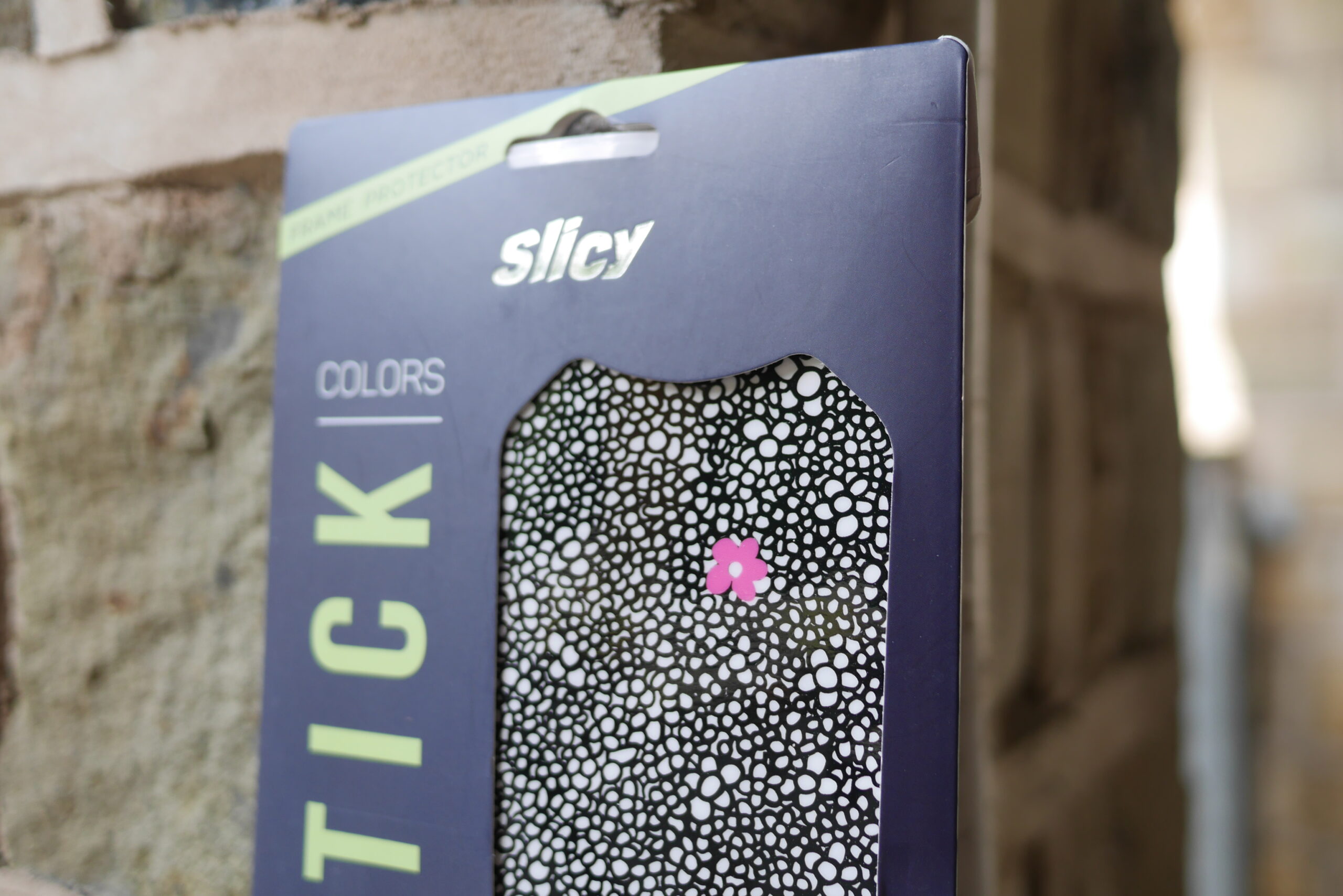 Yer man Jo Burt has designed a frame protection kit for Slicy. The design features black outlined flowers. Some filled white, but most are transparent to allow your frame colour to show through. And there’s a single pink flower on each section. Because. Two patches for the down tube, three for the top tube, four for seat stays and one for the seat tube.