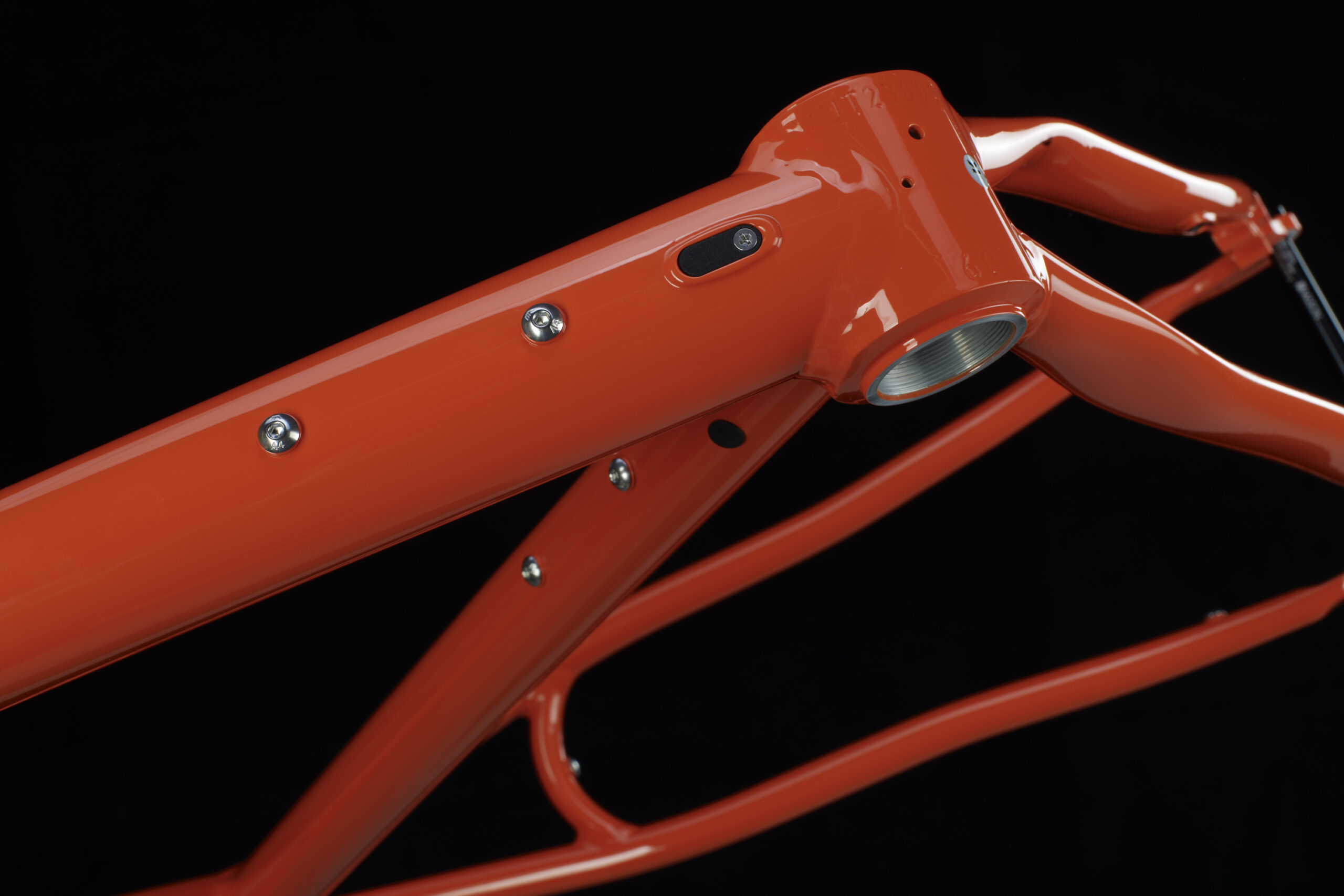 Dedicated top-tube dynamo routing with reinforced ports for internal cable routing between the front and rear lights.