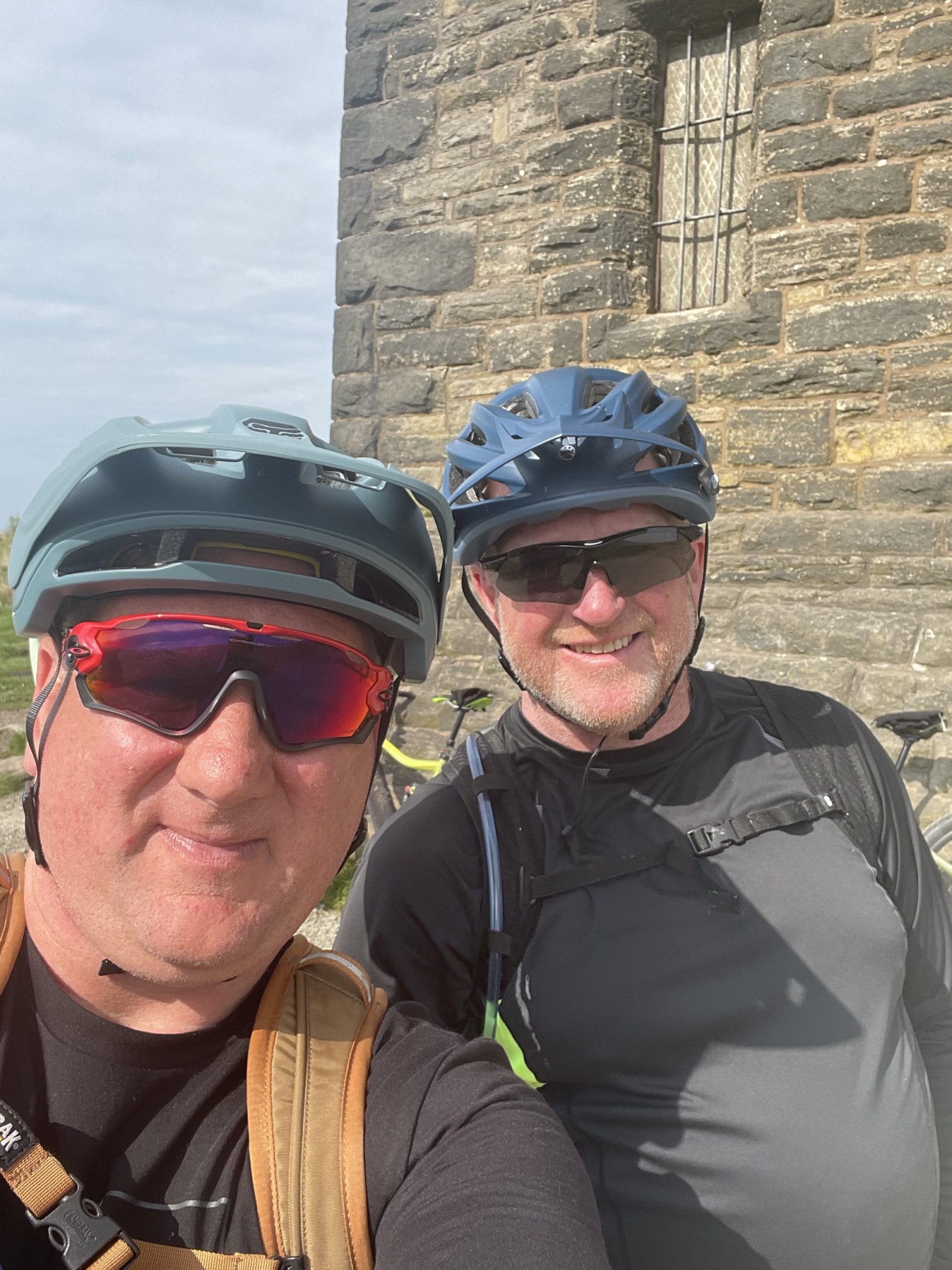 I’m not sure if Simon has ever taught anyone anything, but if he has he is firmly from the ‘in at the deep end’ school of pedagogy. Darwen Tower was our destination – a space rocket shaped monument up a big northern hill in Lancashire (actually named Jubilee Tower built in honour of Queen Victoria’s Diamond Jubilee in 1898) and our path up to it was via a wickedly steep, narrow, rock-strewn track punctuated by rain run-off gullies and curbs called Donkey Brew – some of you may have had the pleasure. I turned my motor to turbo setting and, doing as I was told by a Simon who was disappearing ahead of me up the hill, ‘aimed straight at ‘em and don’t stop spinning’. I was panting and sweating and struggling – this was supposed to be easy, an adventure, fun…