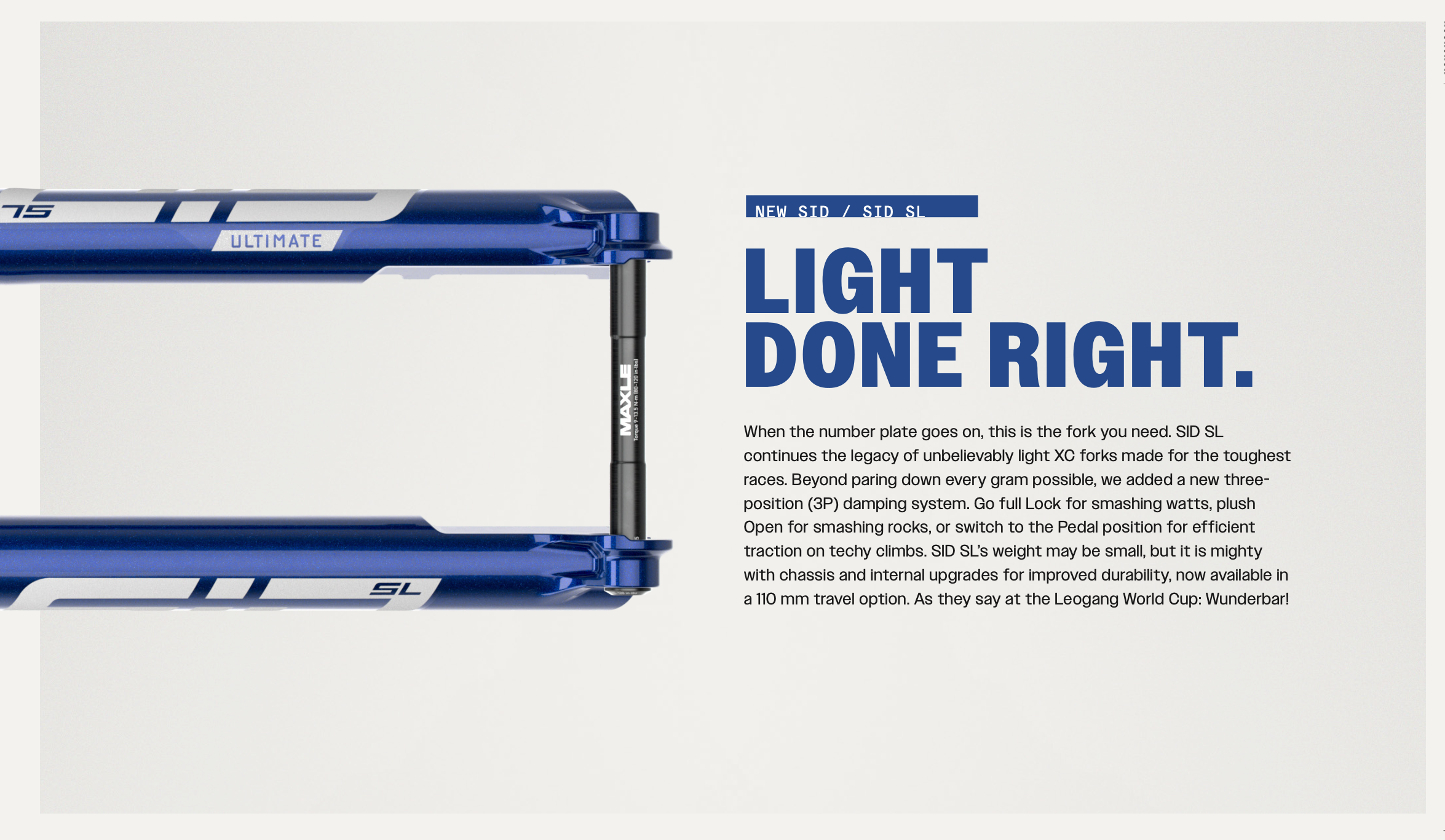 When the number plate goes on, this is the fork you need. SID SL continues the legacy of unbelievably light XC forks made for the toughest races. Beyond paring down every gram possible, we added a new three-position (3P) damping system. Go full Lock for smashing watts, plush Open for smashing rocks, or switch to the Pedal position for efficient traction on techy climbs. SID SL’s weight may be small, but it is mighty with chassis and internal upgrades for improved durability, now available in a 110 mm travel option. As they say at the Leogang World Cup: Wunderbar!