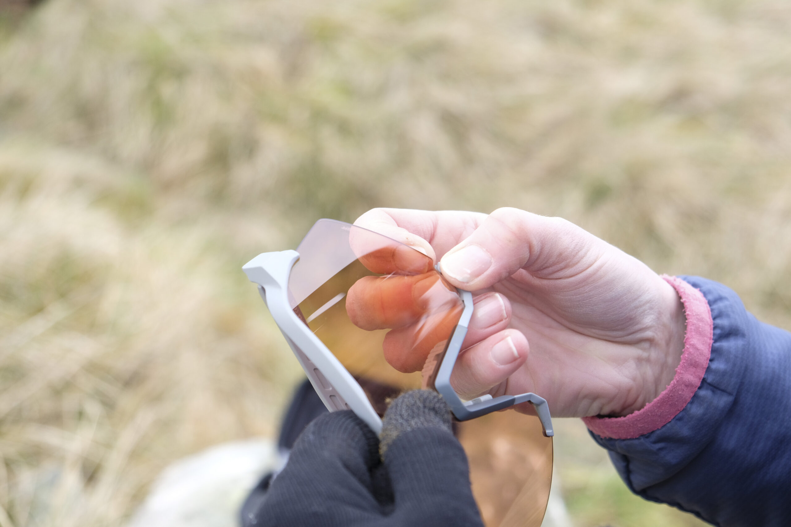 Swapping between lenses is quite easy once you’ve got your head around yanking on the plastic. It feels wrong to be pulling at your glasses, but that’s what you need to do. You pull the lens off the main frame, plus pull the lower frame piece off the lens. Then, push and clip your other lens back into place. It’s fiddly enough that you’ll want one bare and ungloved hand for sure, but there’s a pleasing lack of titchy small parts to lose. There is an alternative sized rubbery nose pad piece should you need it to get a good fit, and I’ve found that it stays well attached to the lower frame piece.